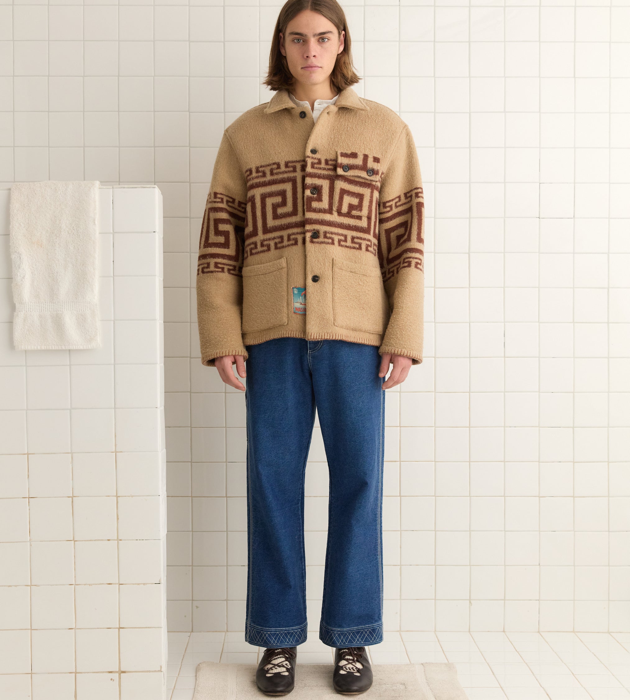 This jacket is made of a midcentury wool blanket with a Greek meander motif. Hand-mending throughout.