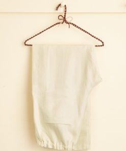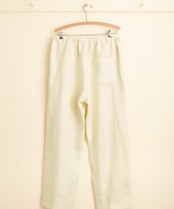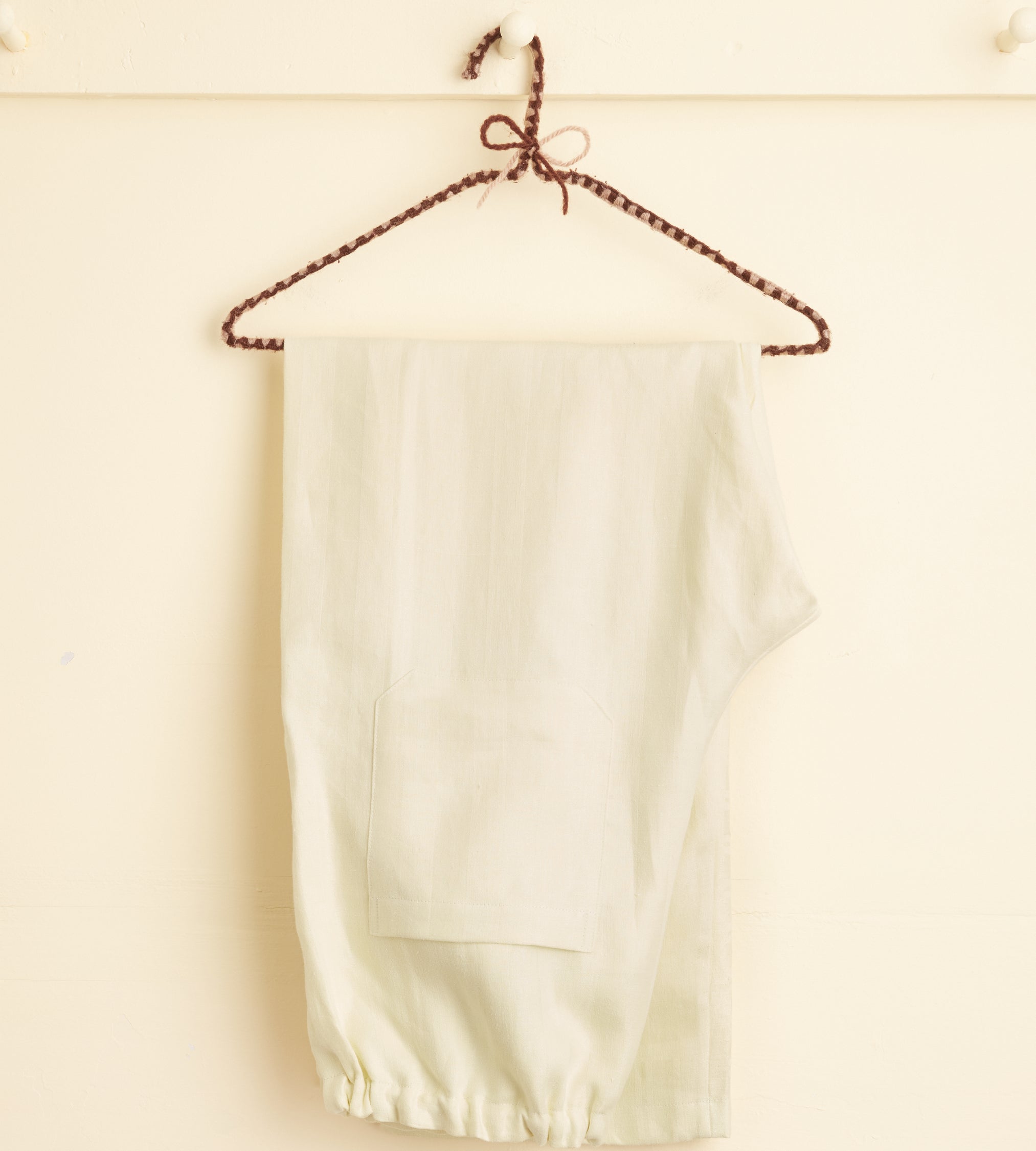 These pajama pants are made from a pale green damask tablecloth from the early 20th century. Hand-mending throughout.