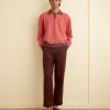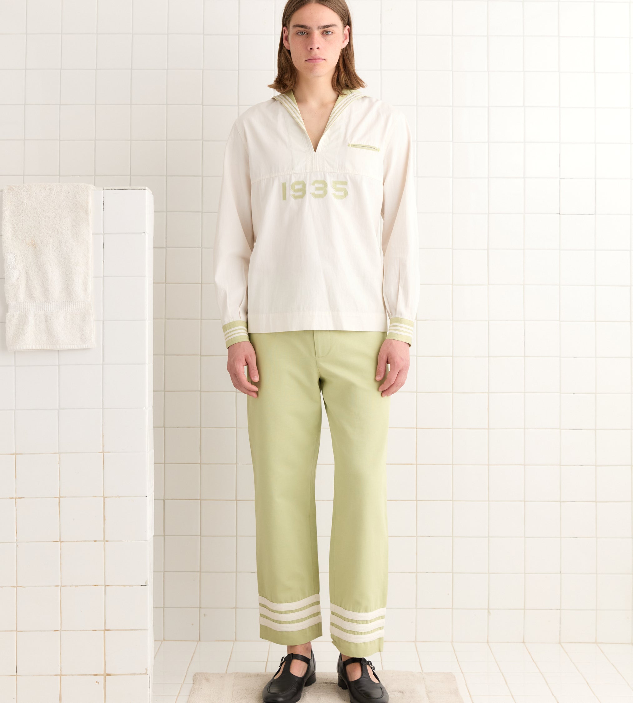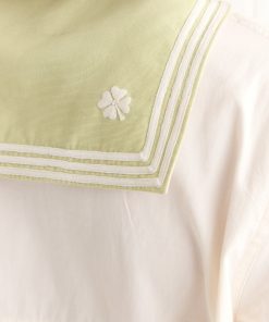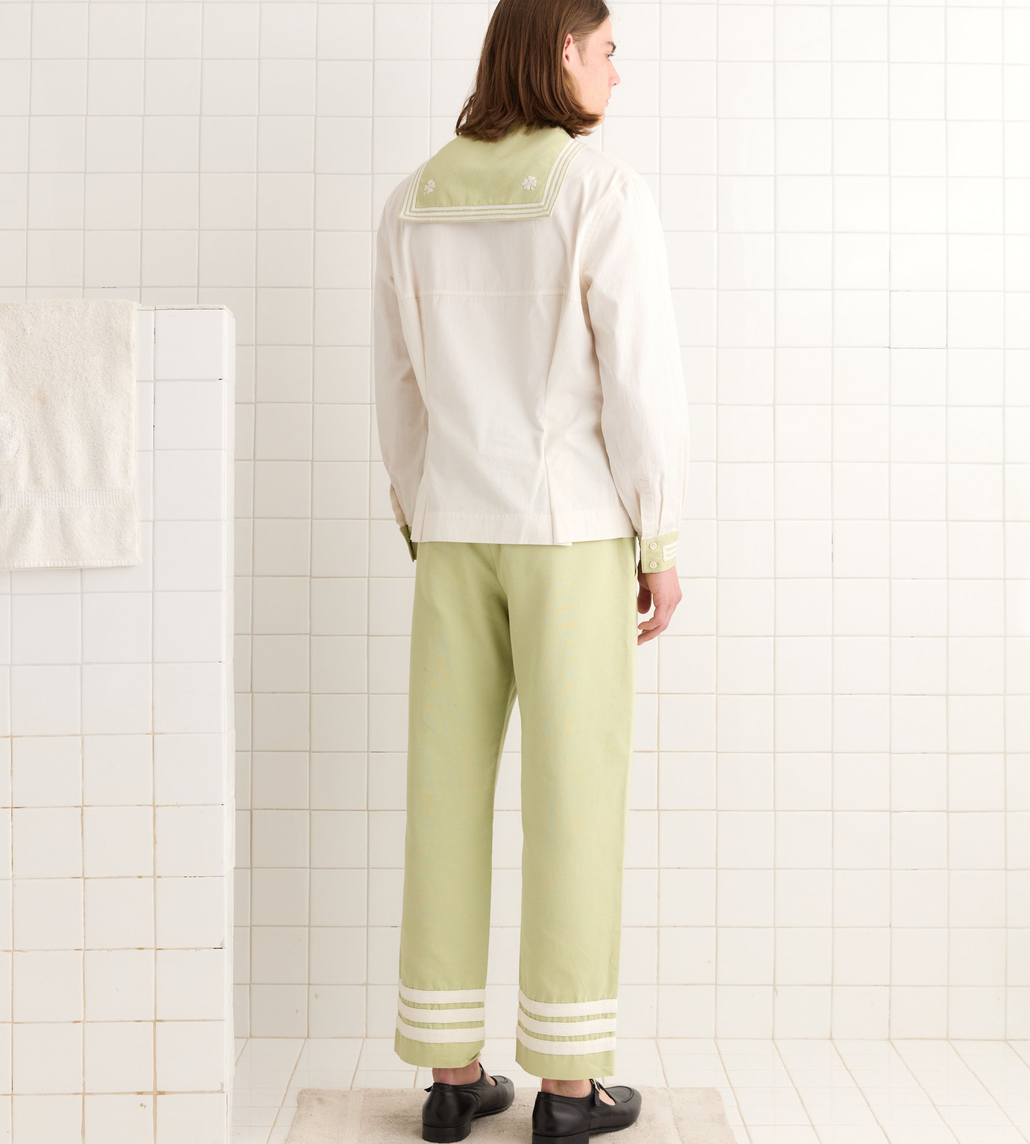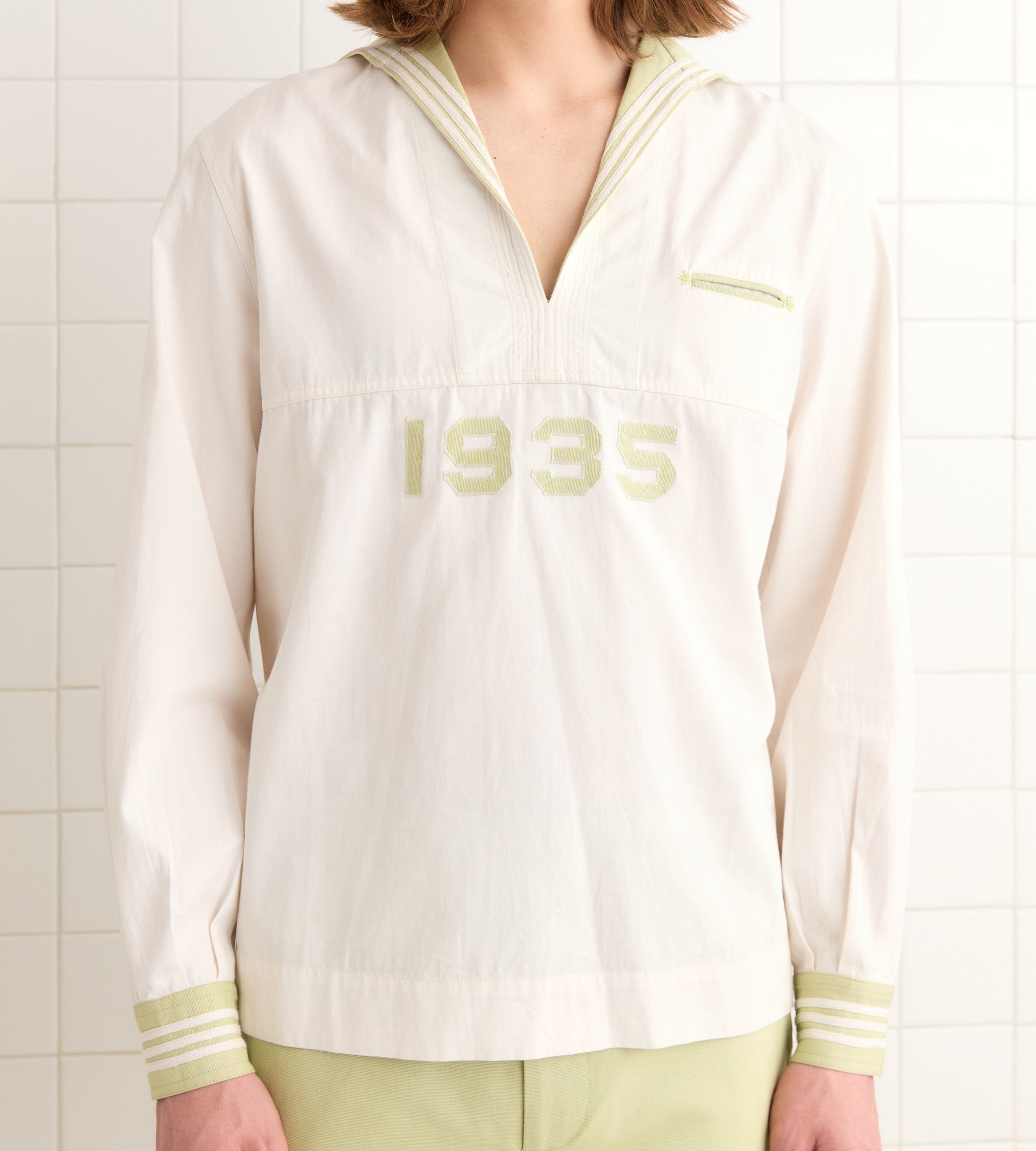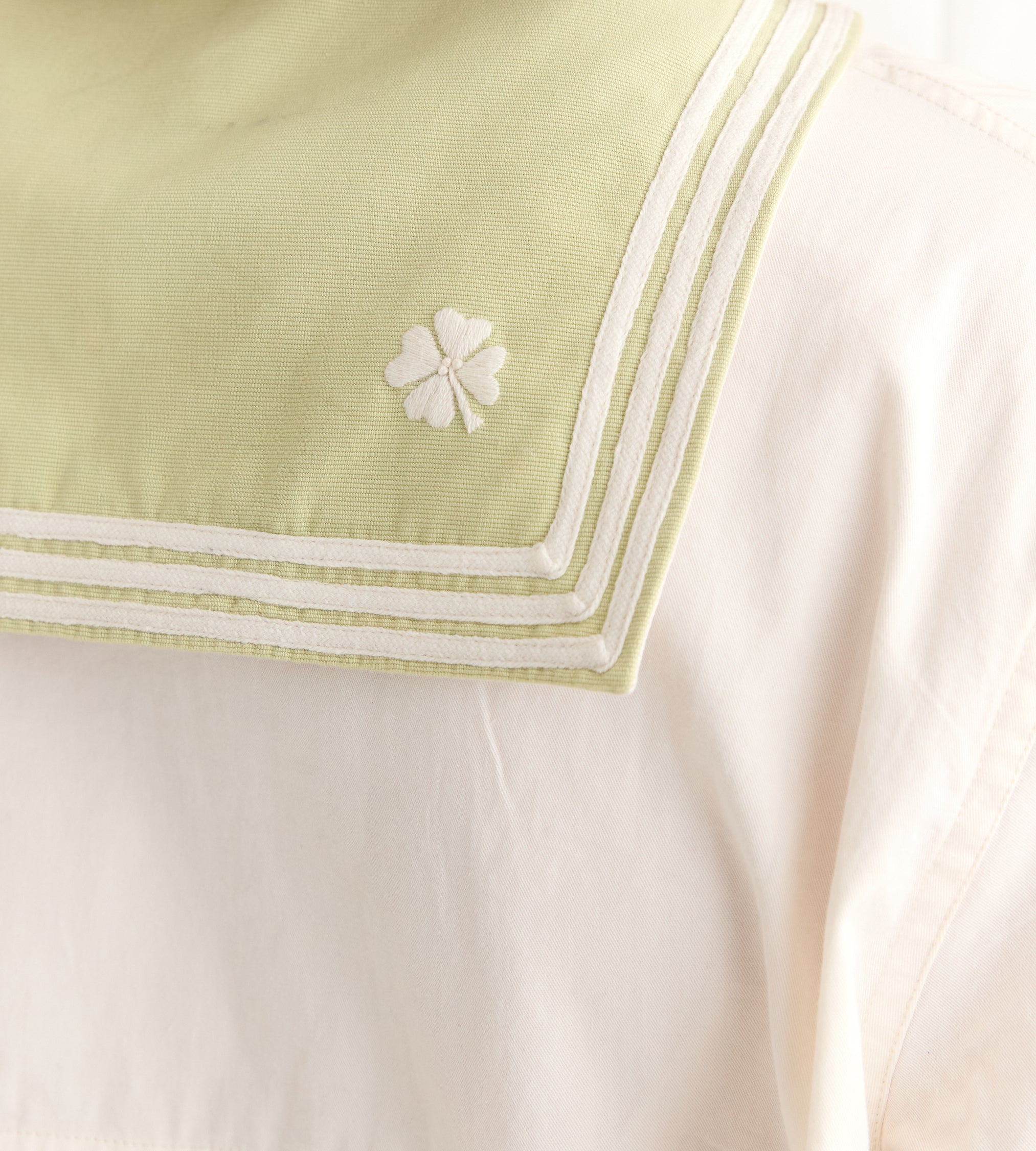This style is inspired by an antique shirt, c.1920s-1930s. Sailor collars like this one were common throughout early sportswear. We reproduced the original piece, with its sailor collar and front welt pocket, in natural-toned cotton with green accents. The collar is trimmed with woven white trim and embroidered clover.