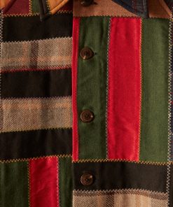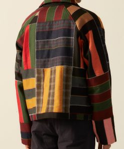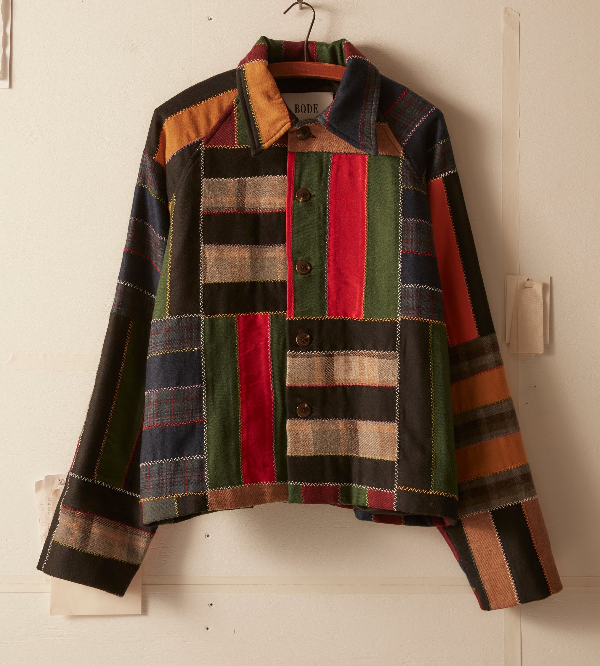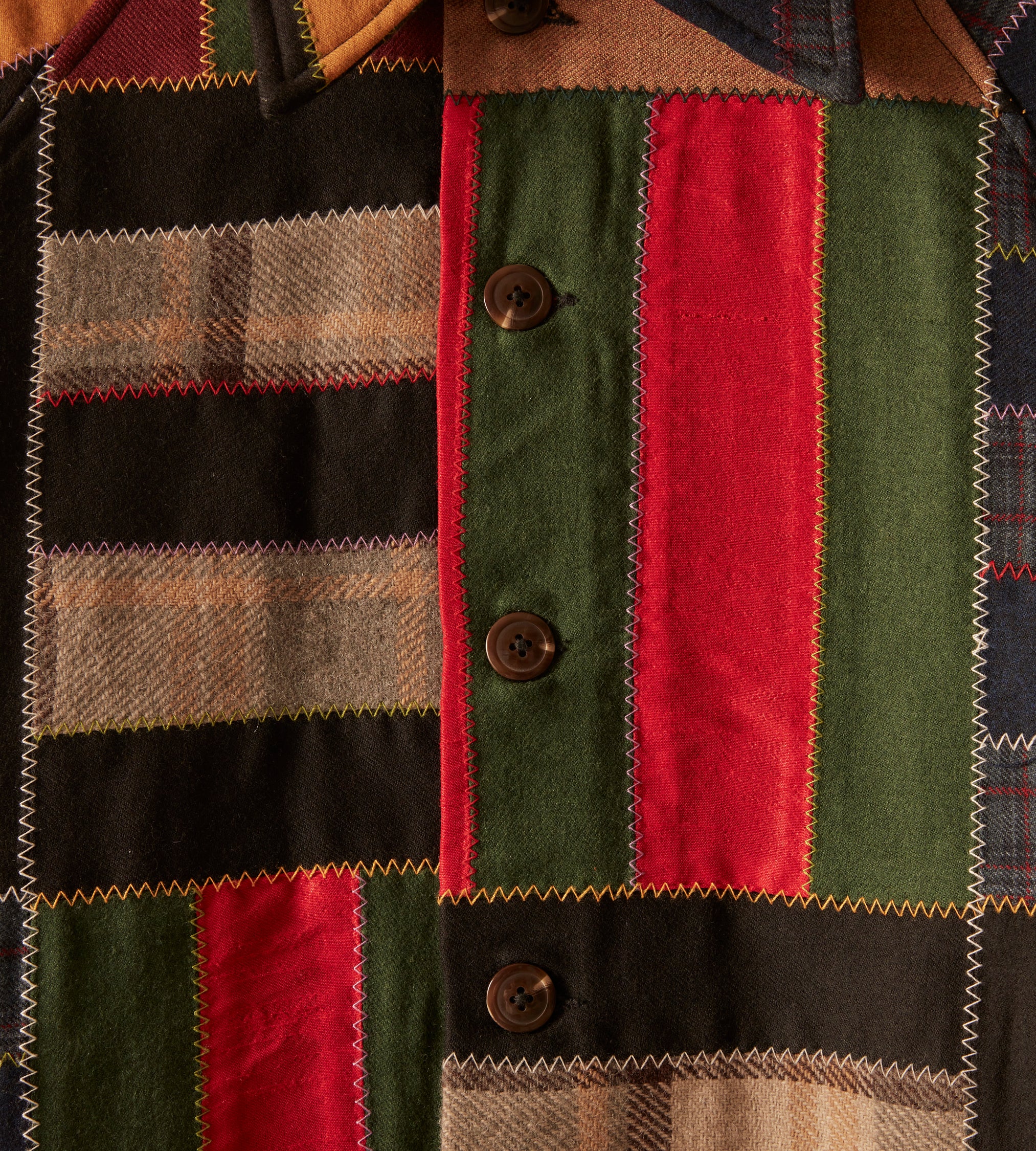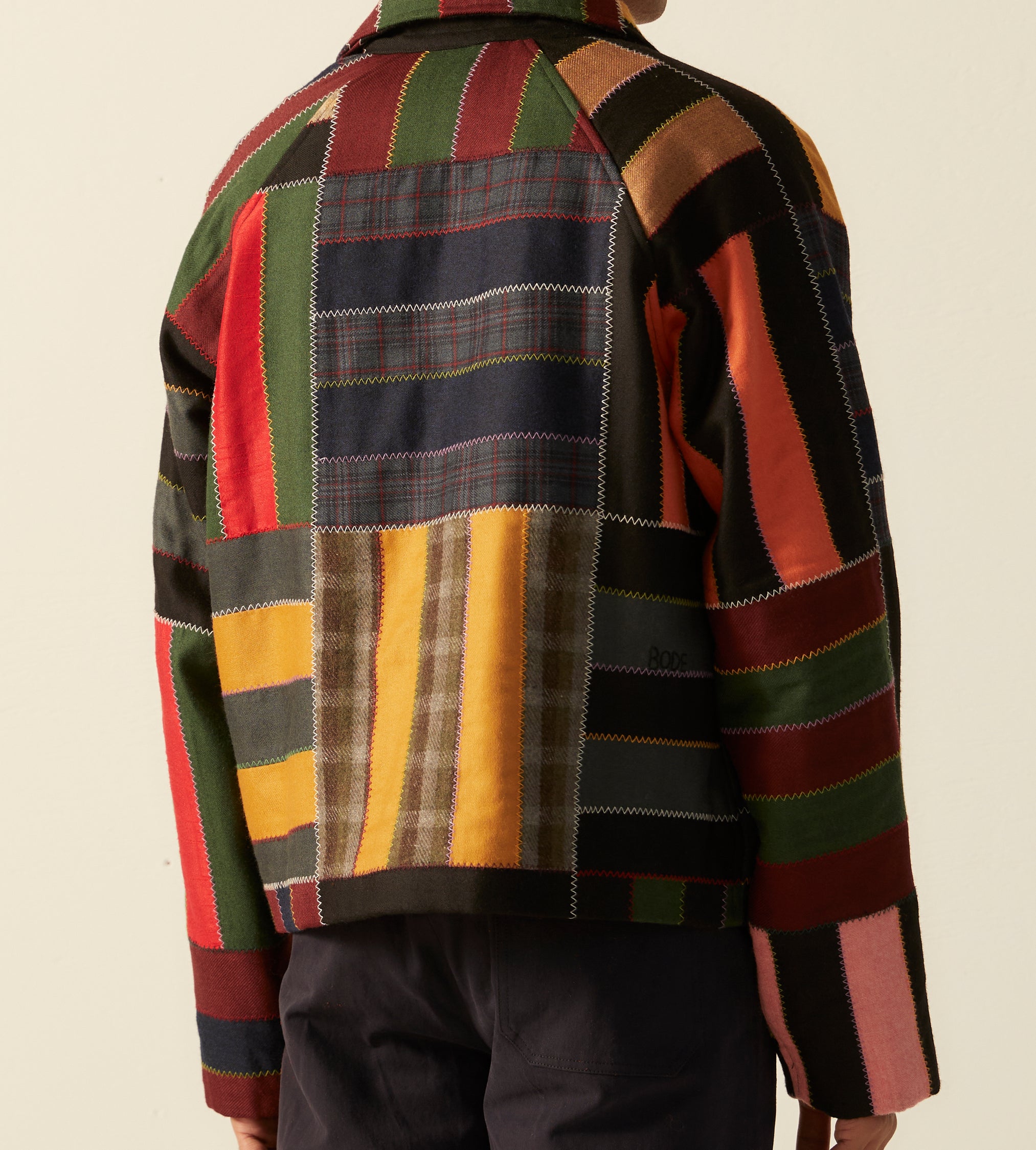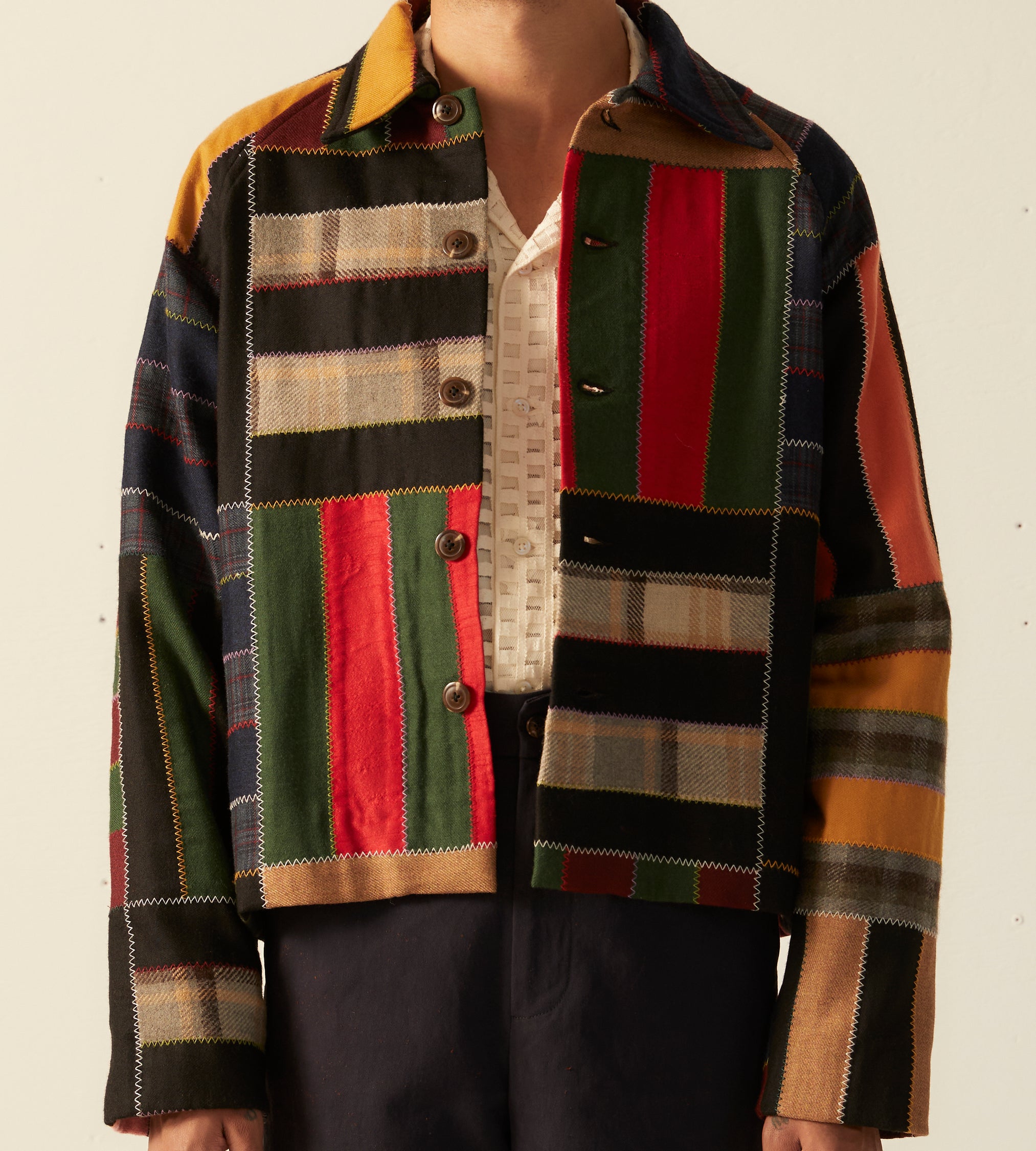 This jacket is inspired by a 1940s quilt. It features a faithful reproduction of a bar-style quilt made from wool suiting fabric sewn together in colorful zig-zag stitches.