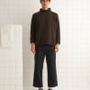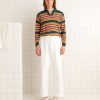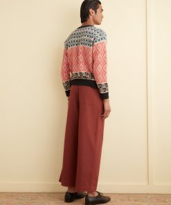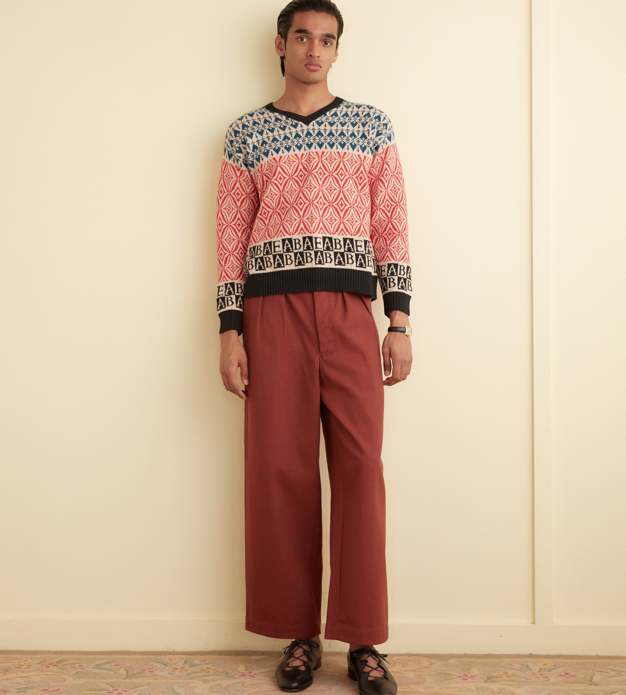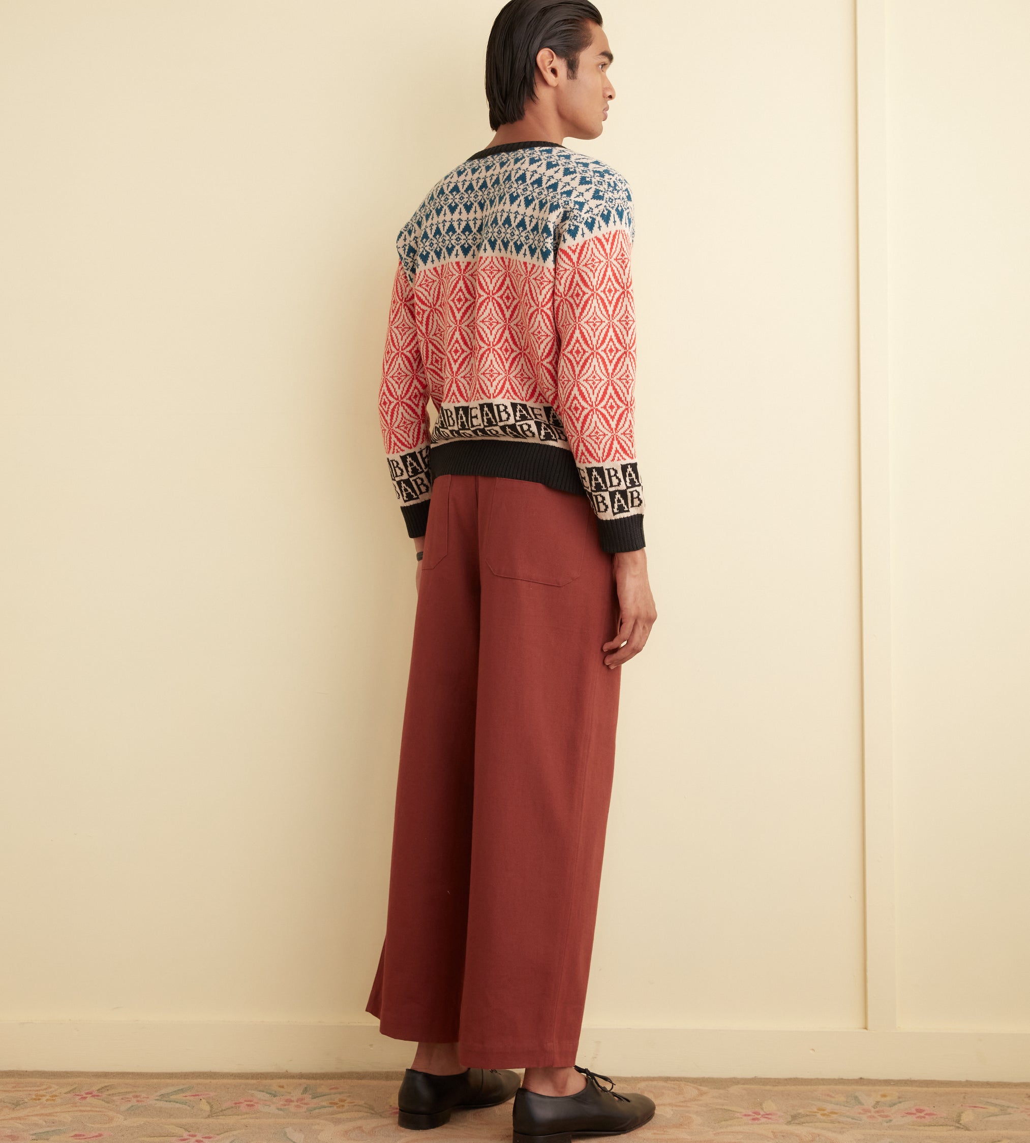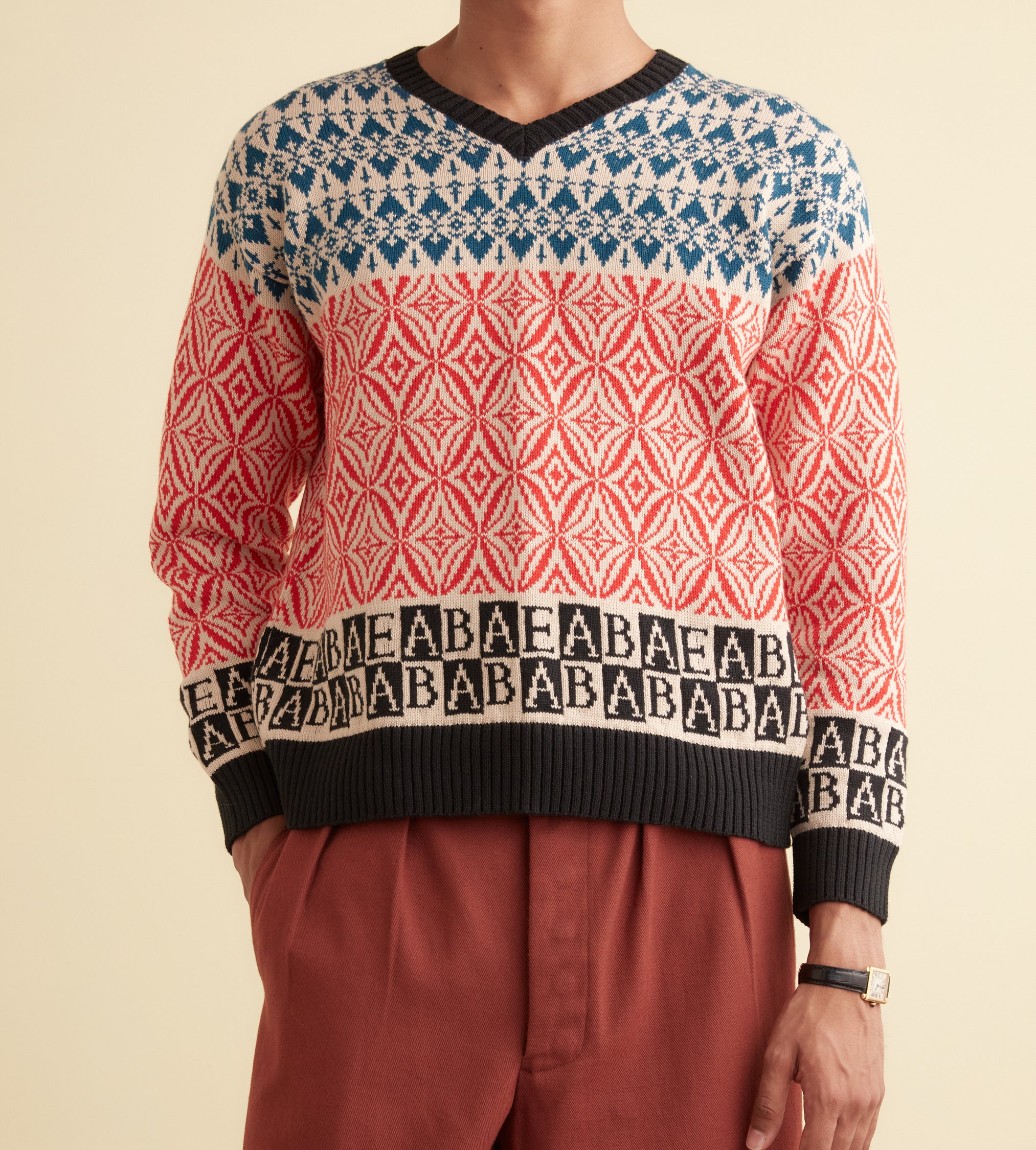 This pullover is inspired by a 1960s-1970s vest, which featured alphabet letters knit around the hem. We reproduced the banded geometric patterns for this style, substituting the letters for Emily’s initials, E.A.B.A.