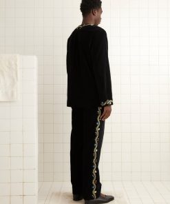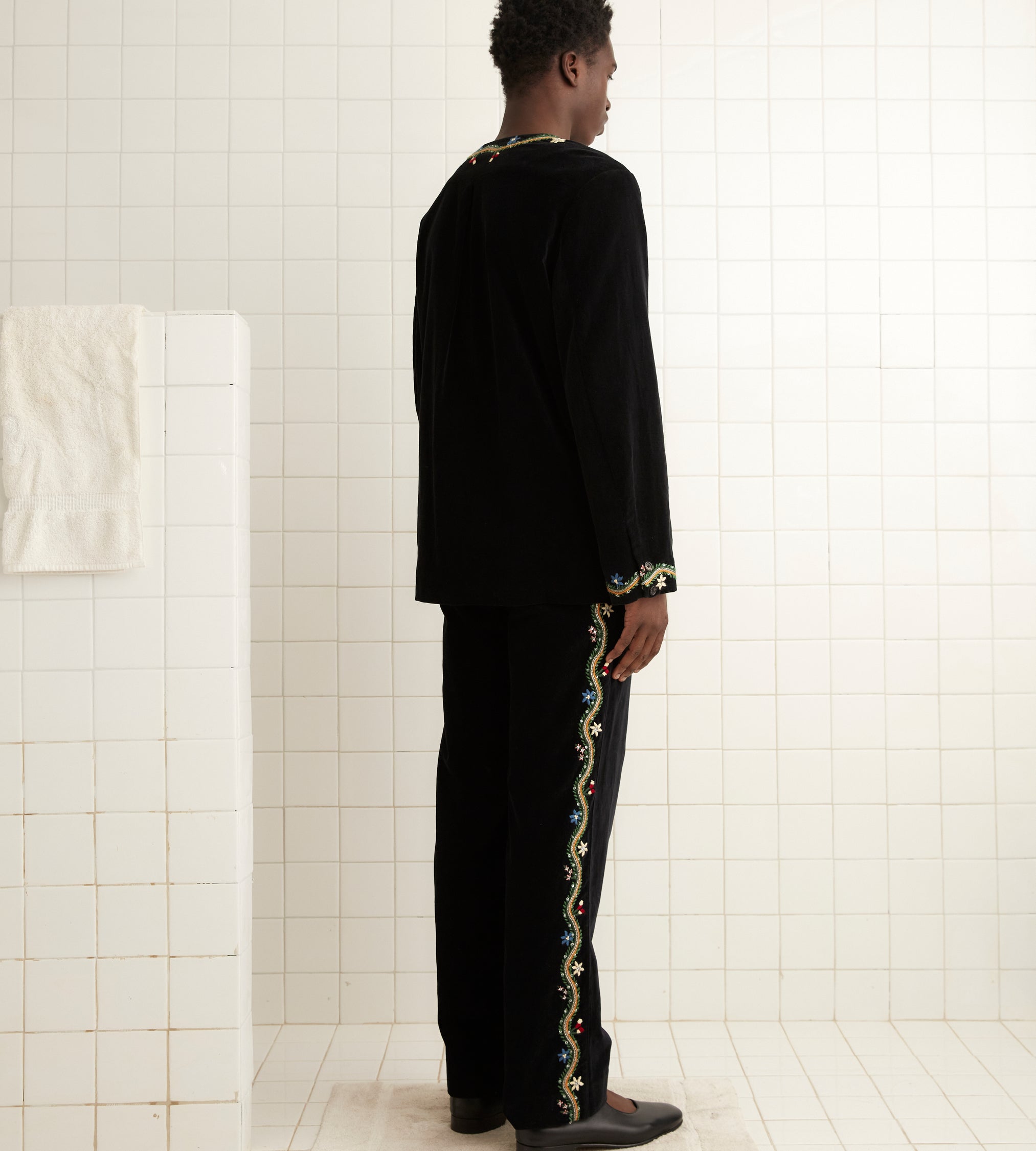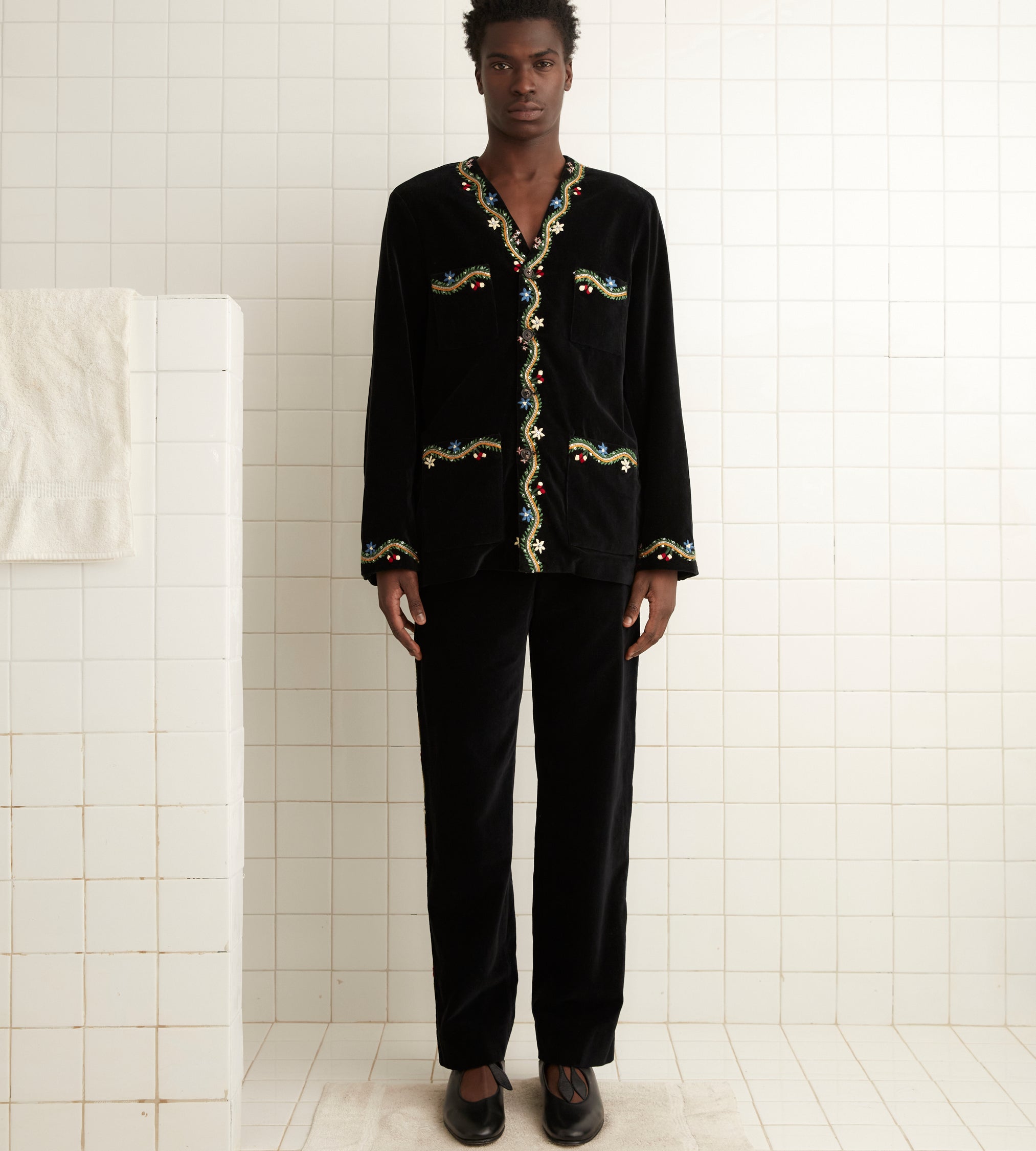 This jacket is inspired by an Austrian straw hat, circa 1930s. The hat brim was embroidered with this twining wildflower-and-vine pattern. We reproduced the floral embroidery along the pockets, placket, and cuffs of this piece. The embroidery is worked in colorful yarn and metallic bullion braid, with silver sequins studded throughout.