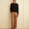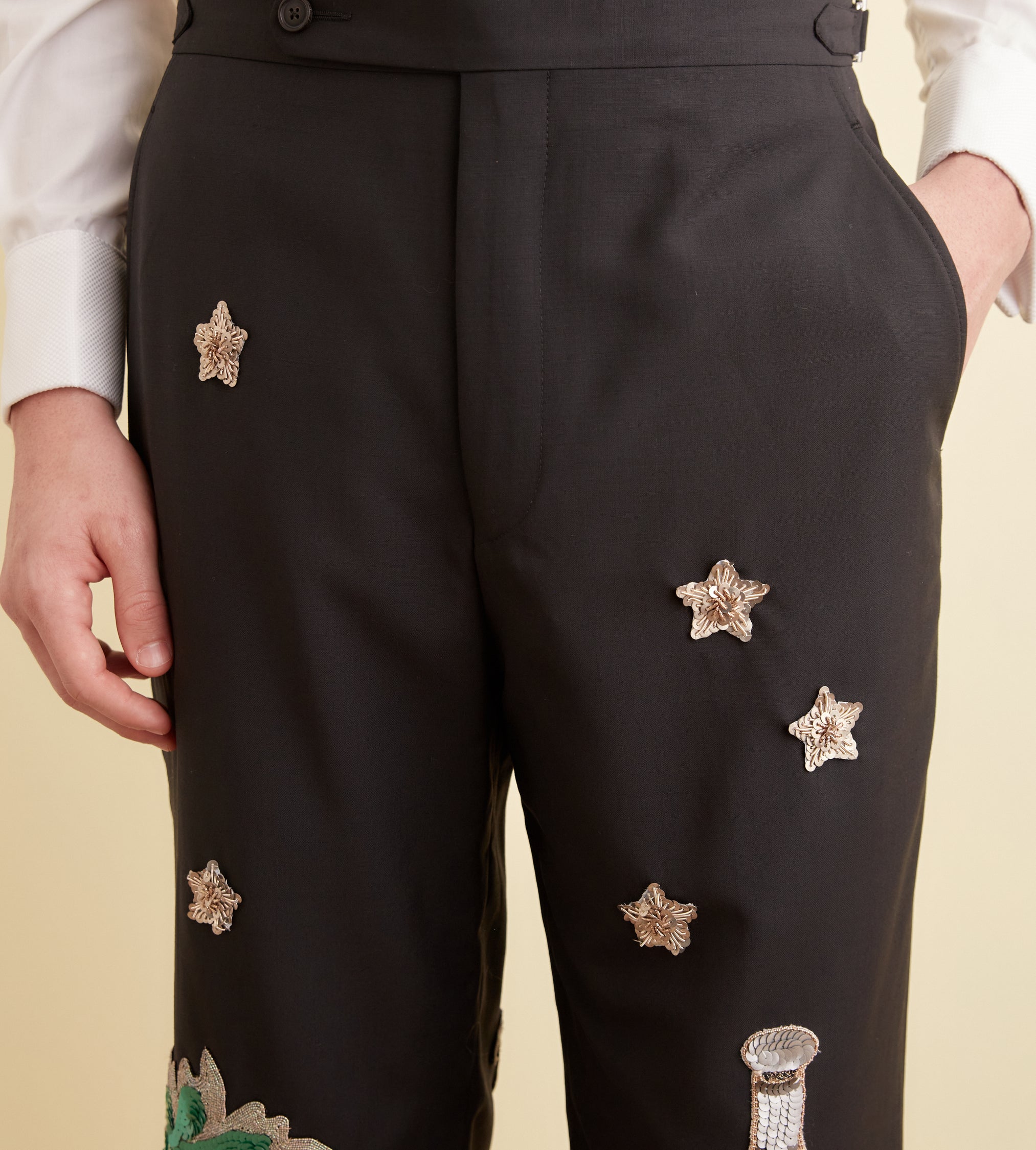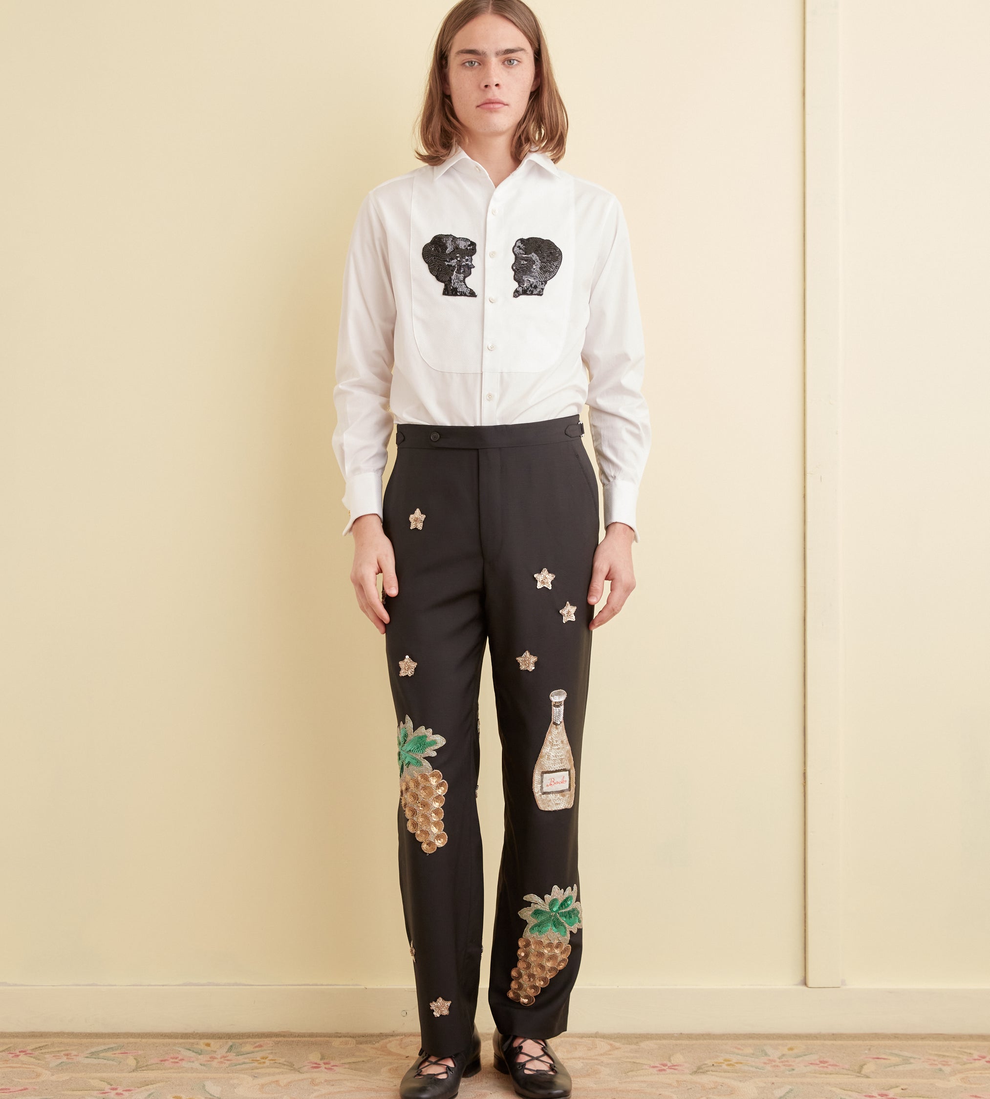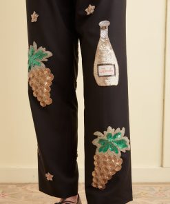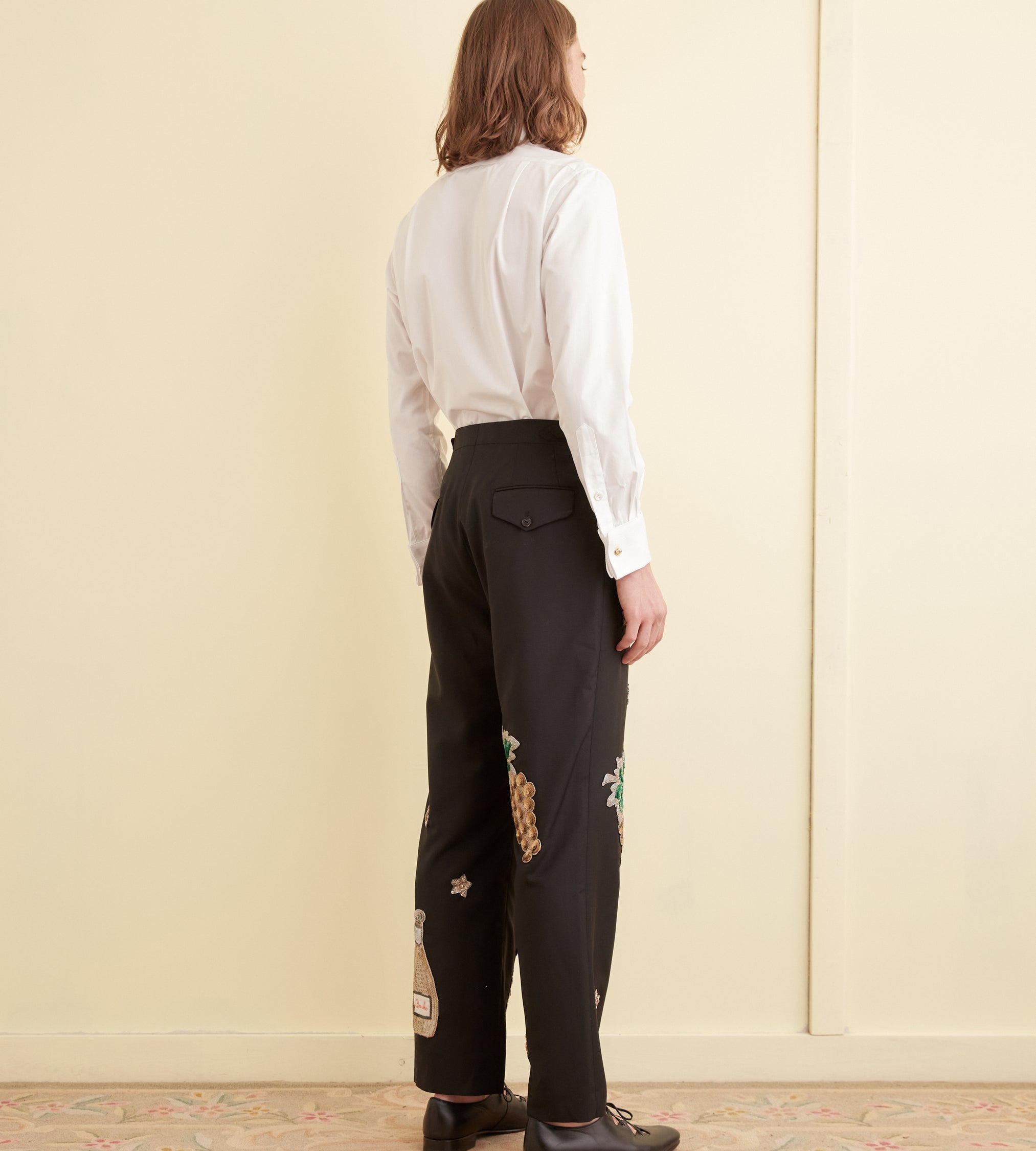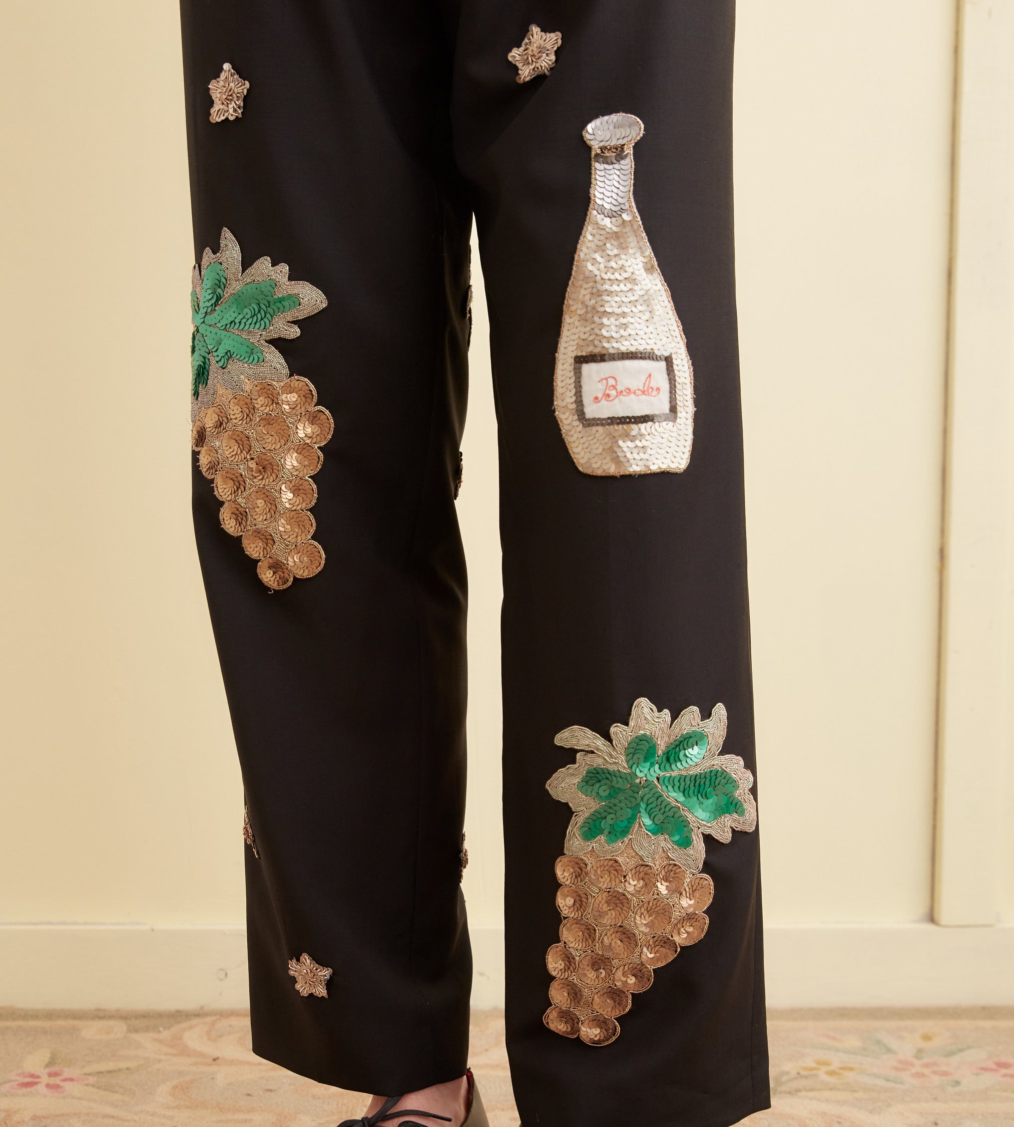 These trousers are inspired by sequined costume embellishments from the 1920s-1930s. We reproduced the original patches for this style: a champagne bottle, stars, and golden grape bunches. They are appliquéd onto a pair of black wool trousers cut in a classic mid-rise, straight-leg silhouette.