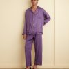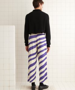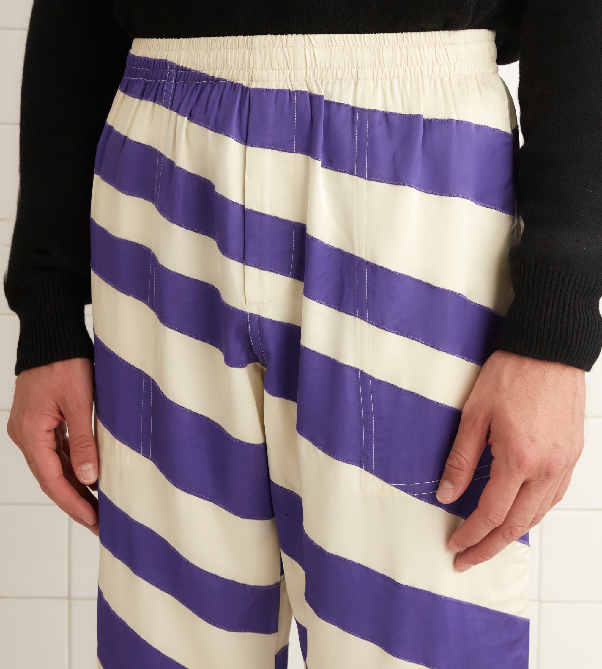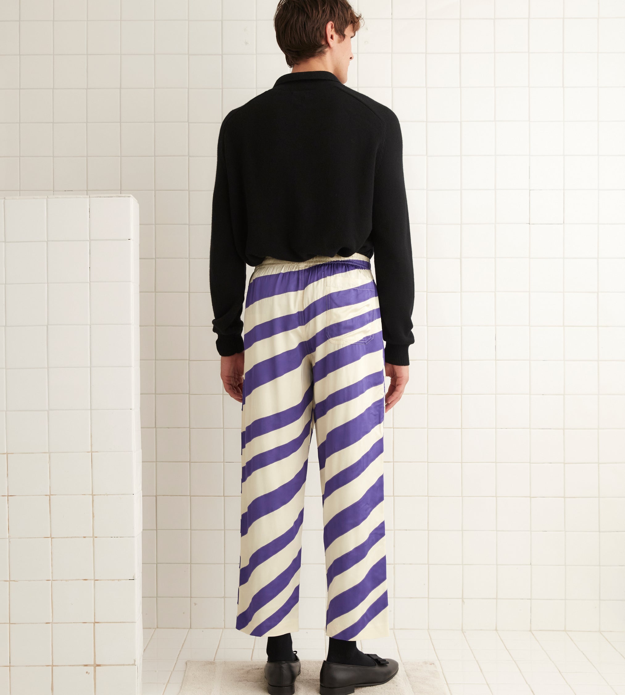 These trousers are inspired by an auto shop jacket from the 1940s-1950s. They feature irregular purple and ivory stripes and are cut in a classic trouser silhouette, with a mid-rise and a straight leg.
