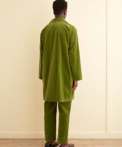 This coat is inspired by a midcentury French workwear jacket. We reproduced the silhouette in apple-green velvet.