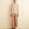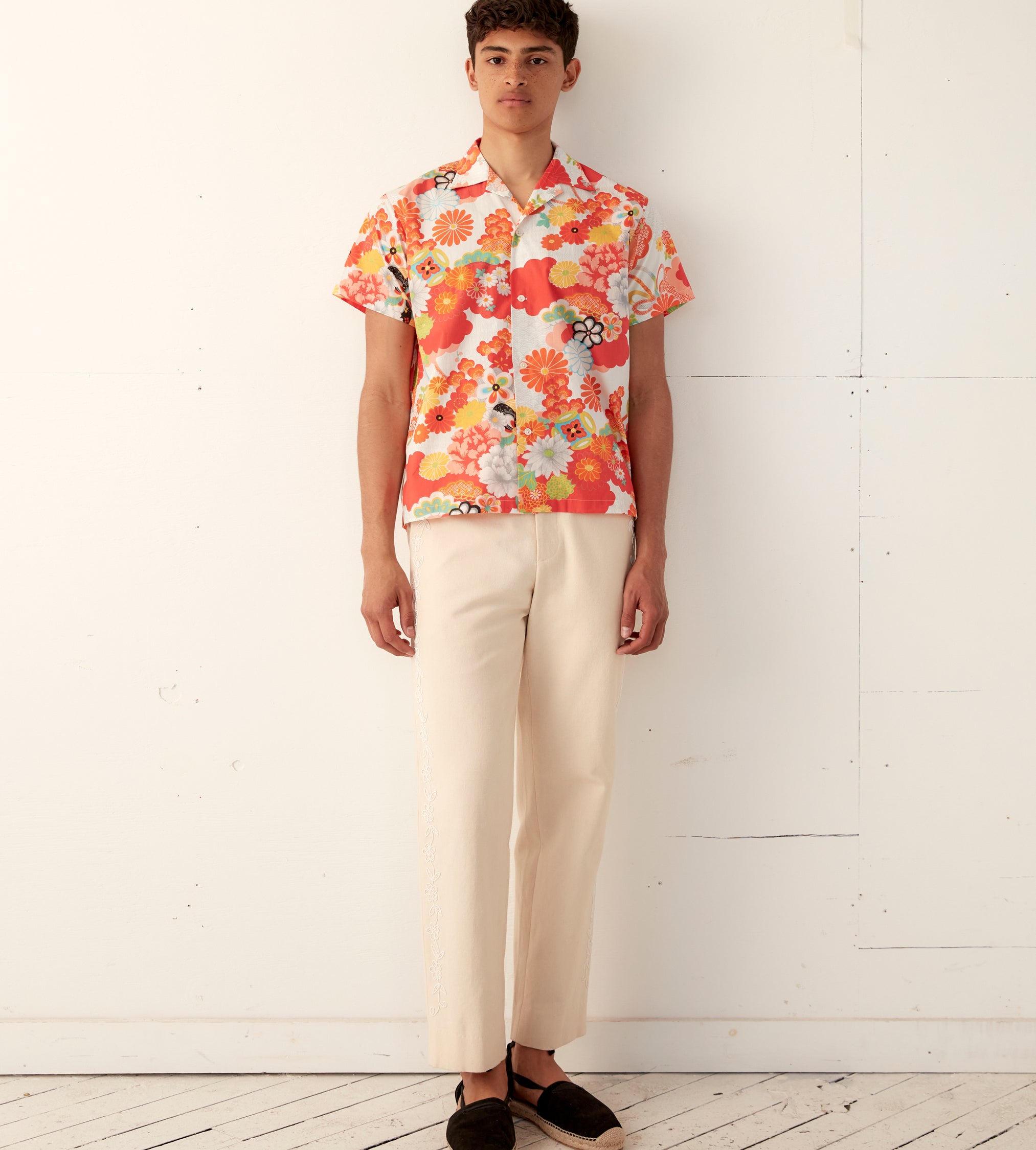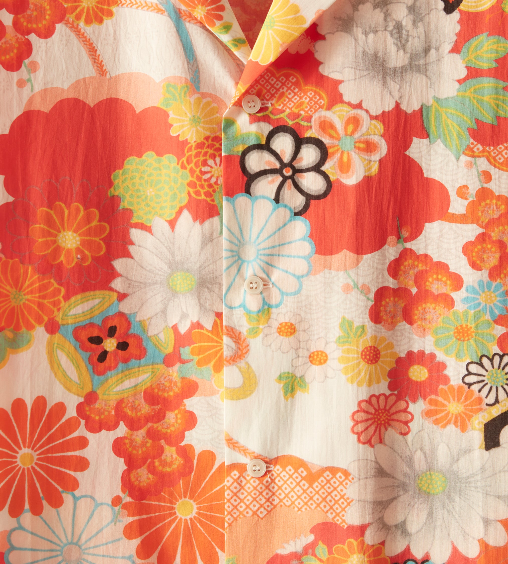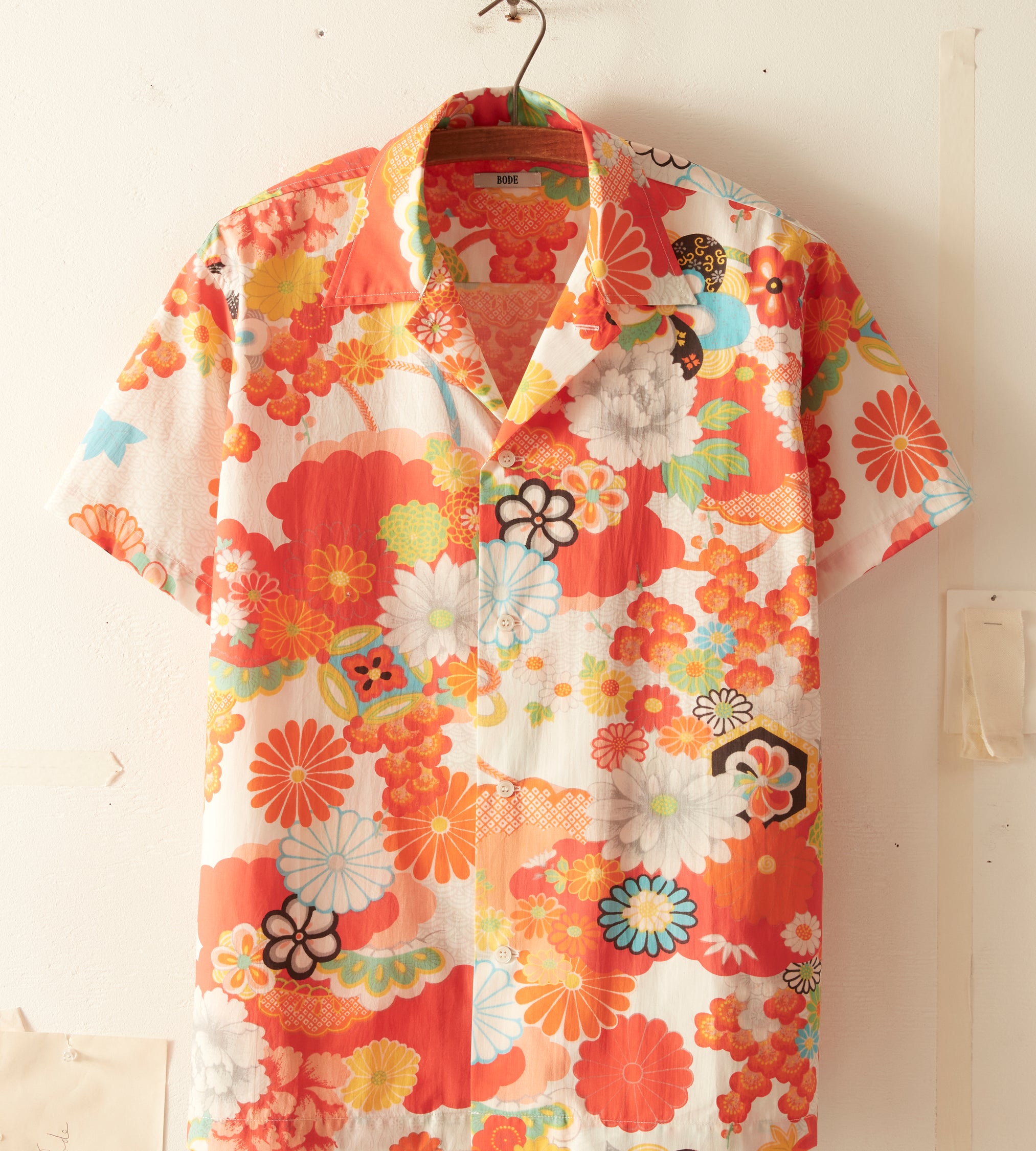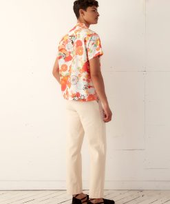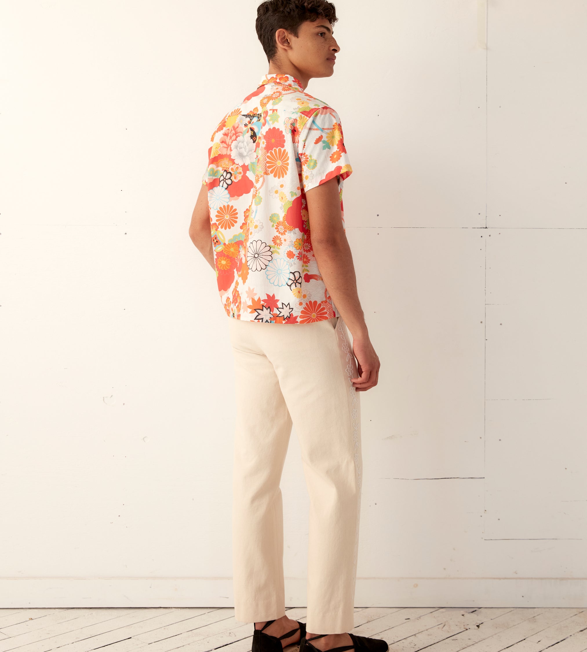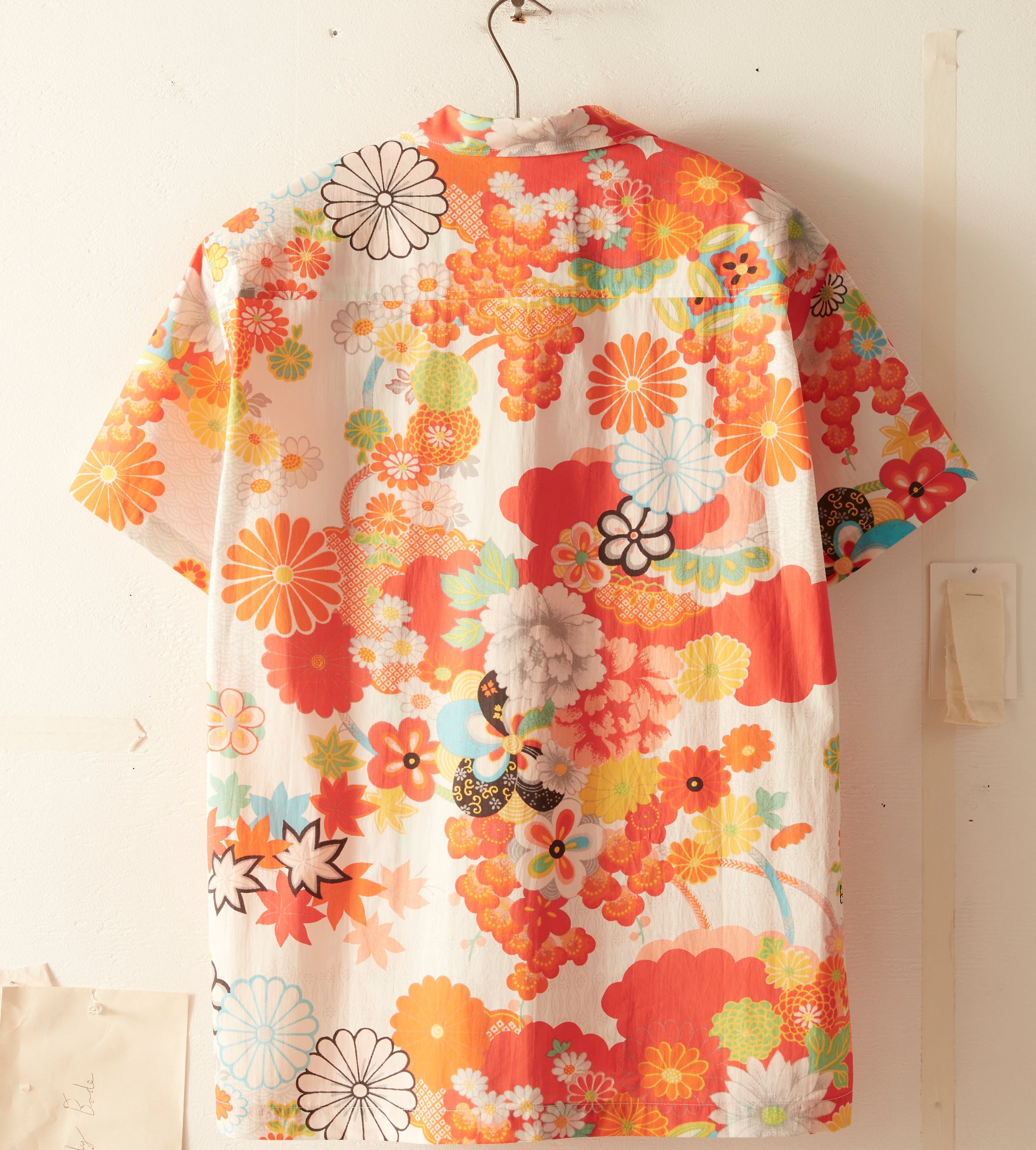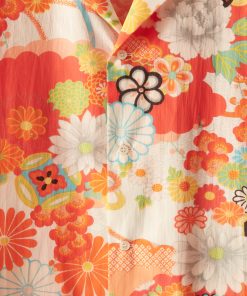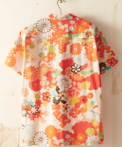 This shirt is inspired by bed sheets from the 1960s-1970s. We reproduced the original print—a pop art floral—for this shirt, which features a camp collar and a straight hem.