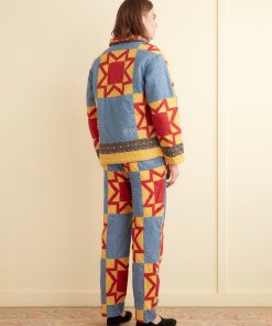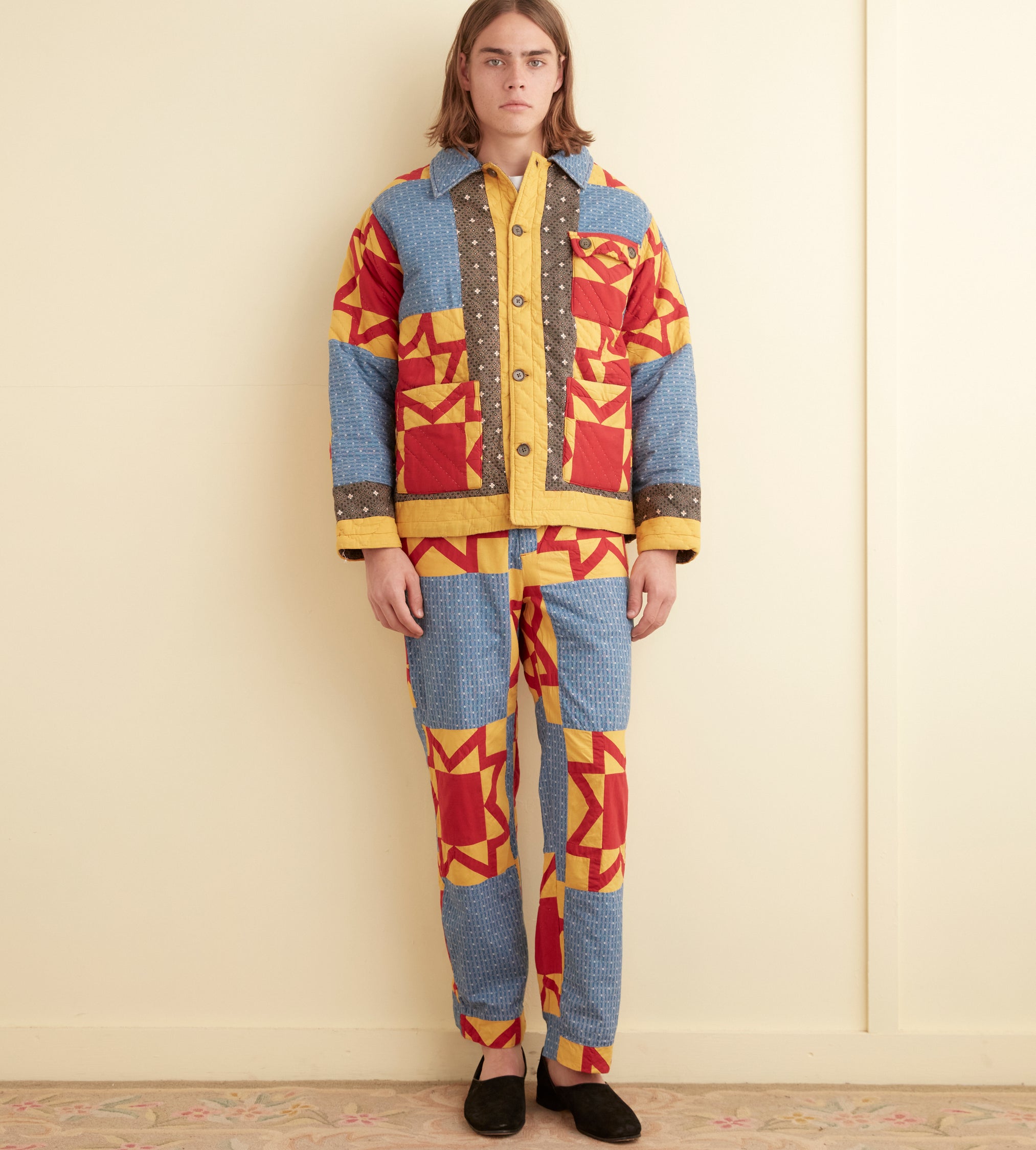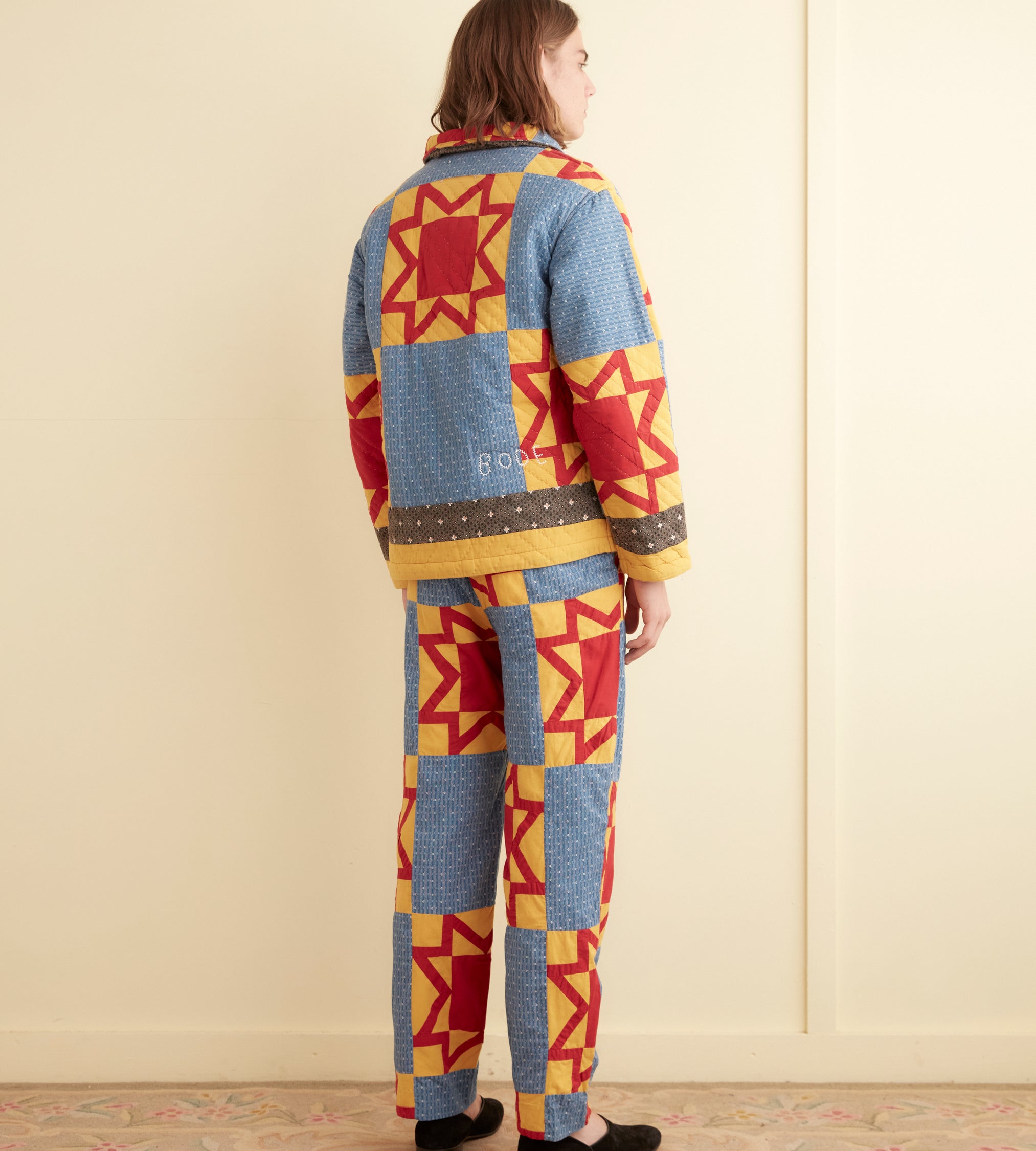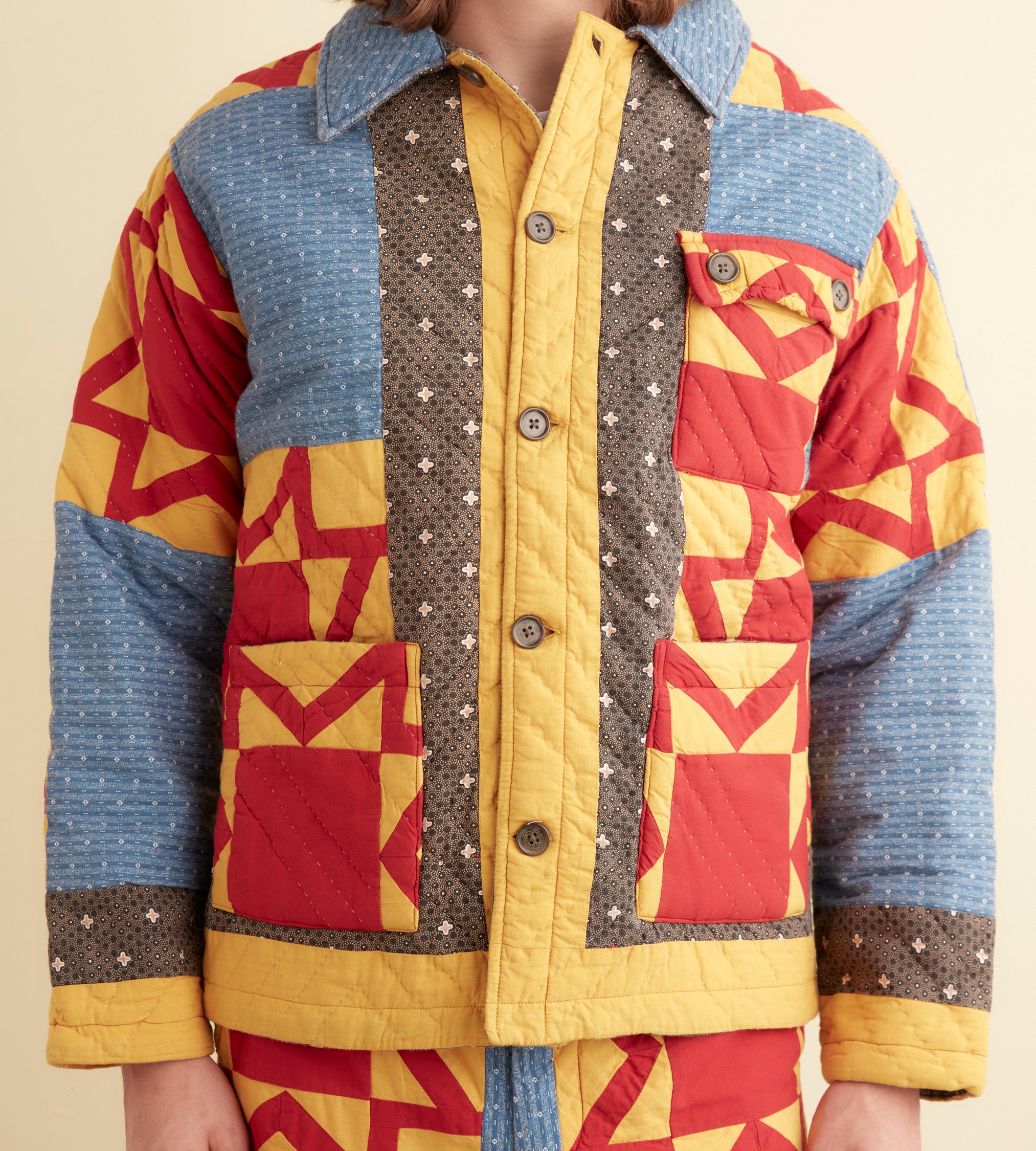 This jacket is inspired by an 1890s sawtooth block quilt. It features a faithful reproduction of a variation of a sawtooth star quilt with Turkey red and yellow blocks surrounded by printed calico fabric.
