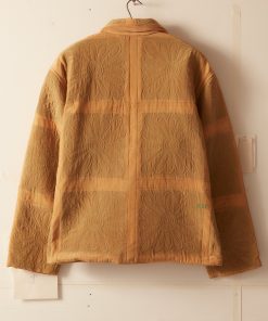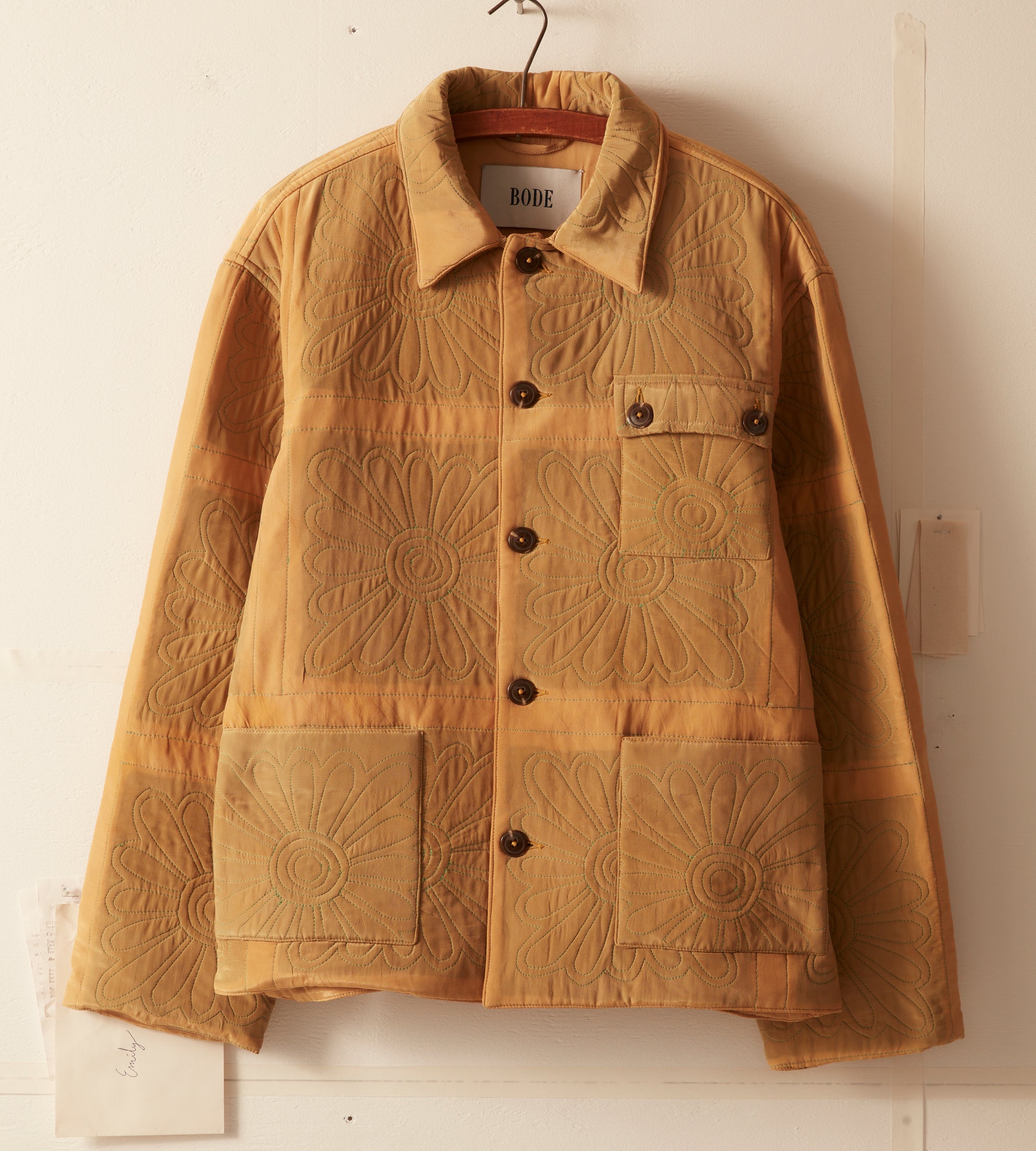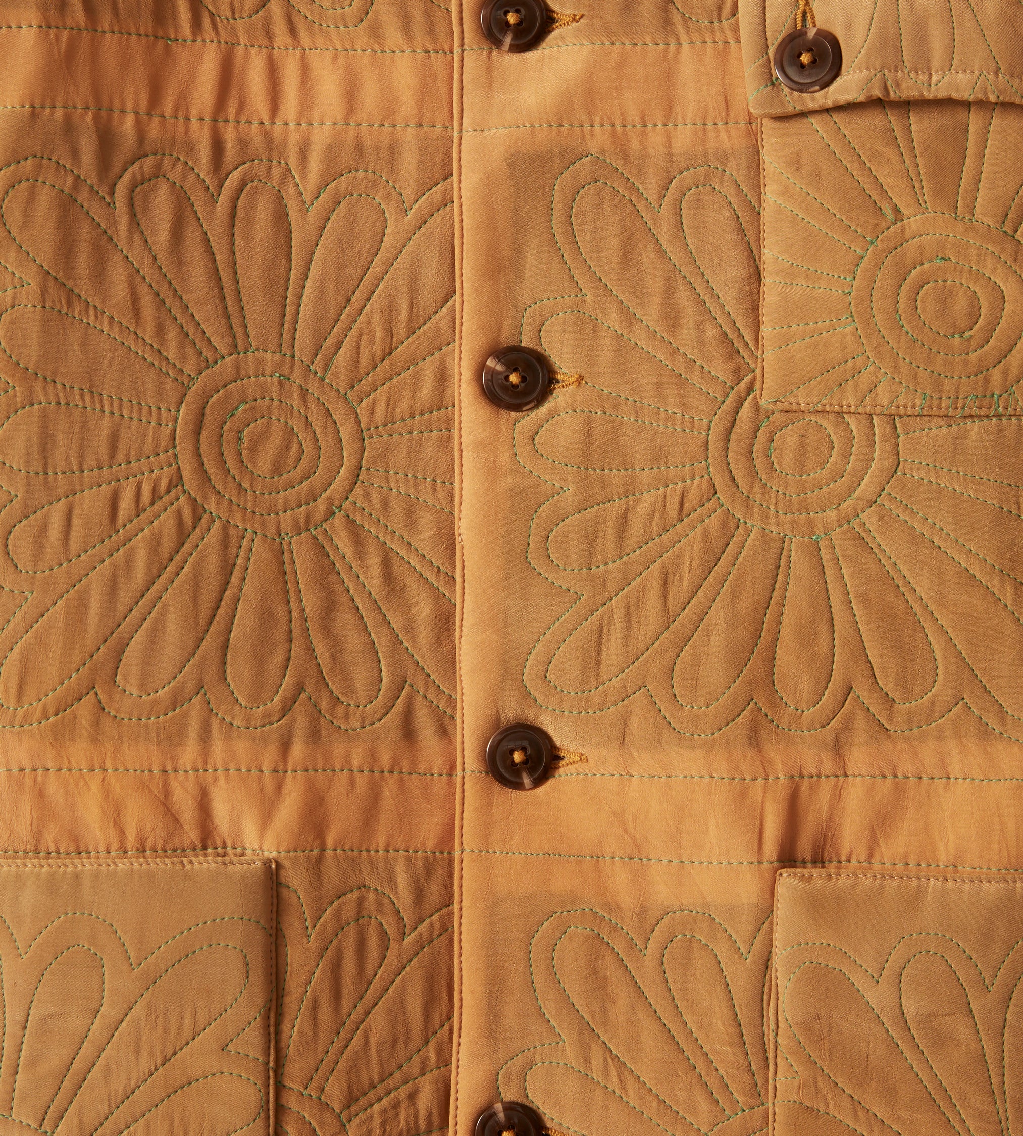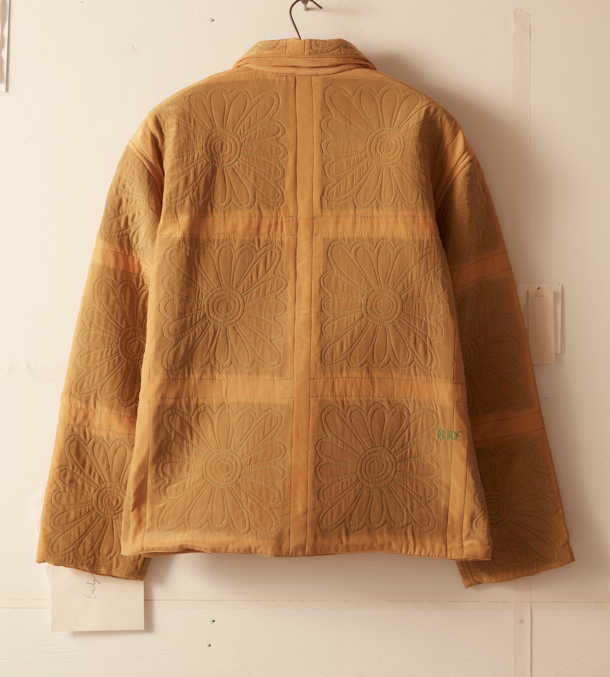 This jacket is inspired by a 1930s quilt. The jacket is a reproduction of a Hollywood Regency-style shadow quilt, which uses dark wadding with light sheer outer fabrics creating the shadow effect.