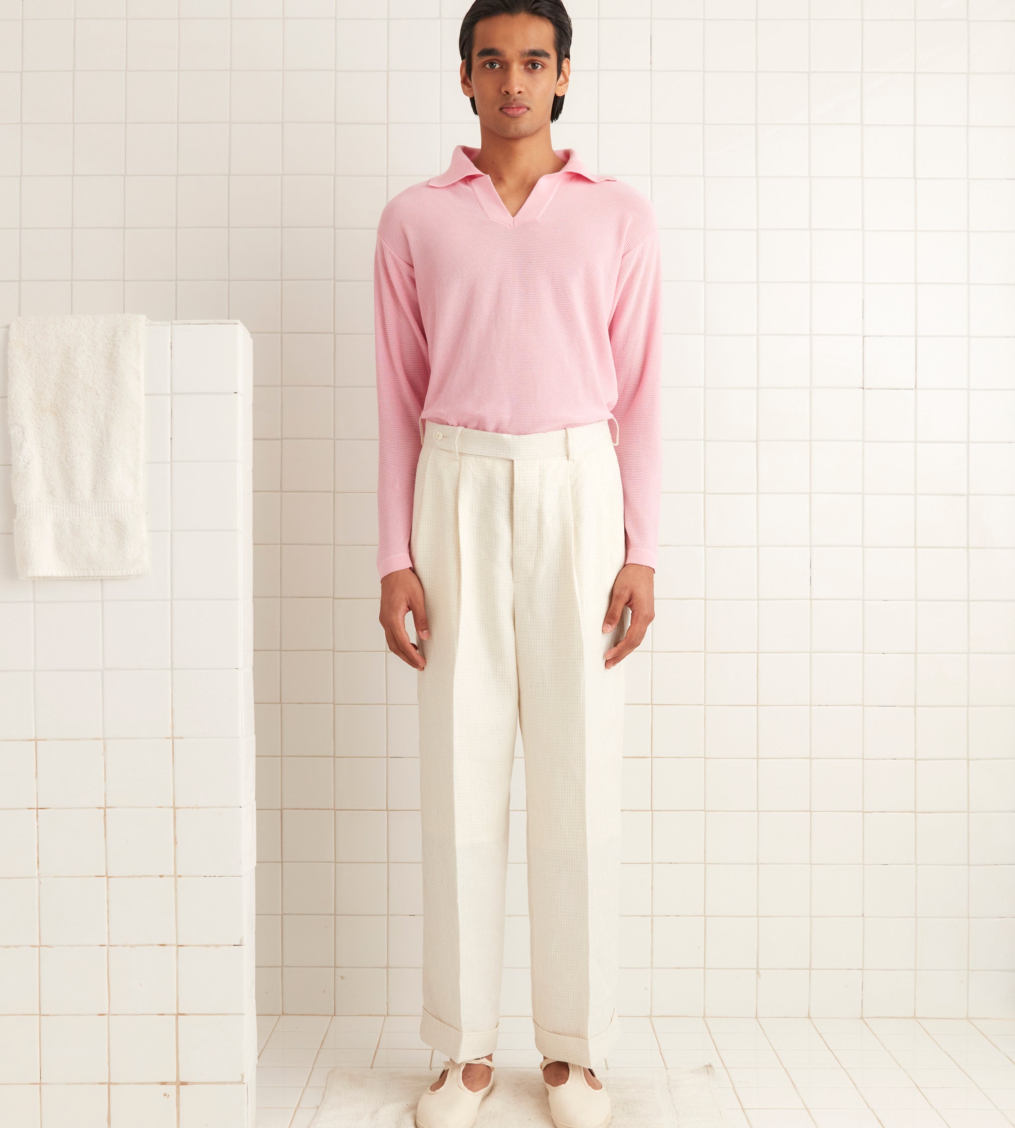 This knit is inspired by a polo from the 1970s. We imitated the boxy silhouette of the original for this shirt, which is knit from a dry crepe yarn.