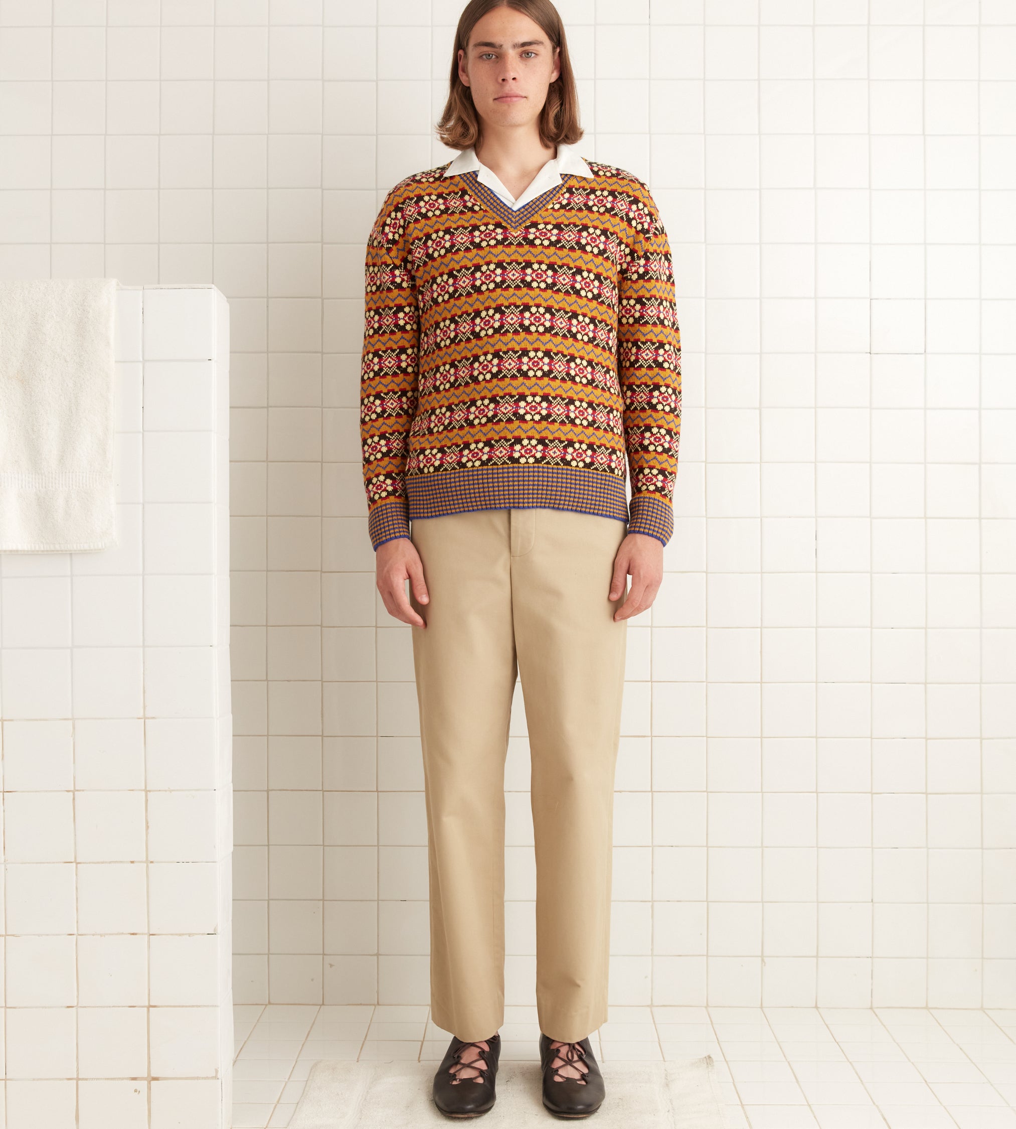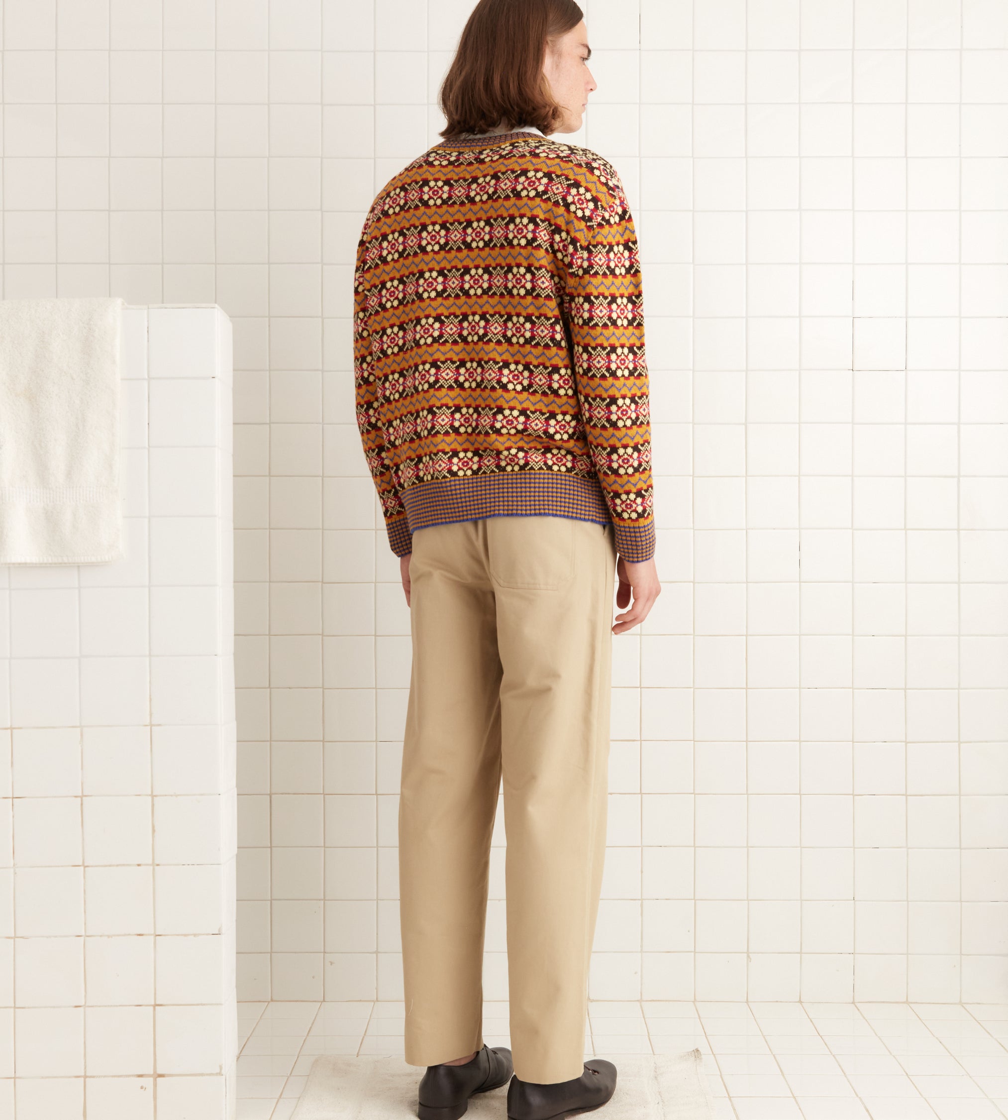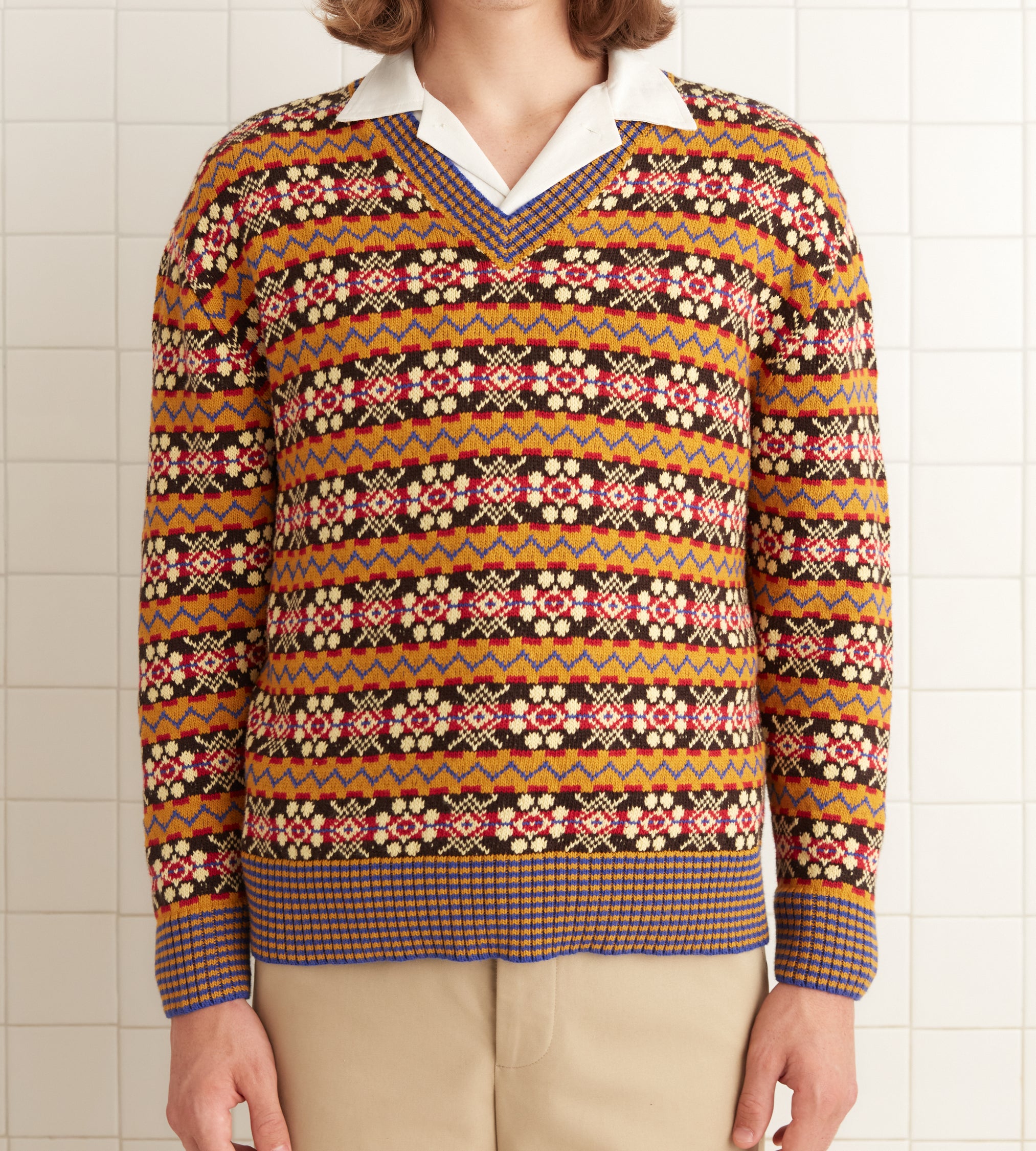 This sweater is inspired by Fair Isle knitting patterns from the 1970s-1980s. We reproduced this pattern in soft red, blue, mustard, and brown yarn.