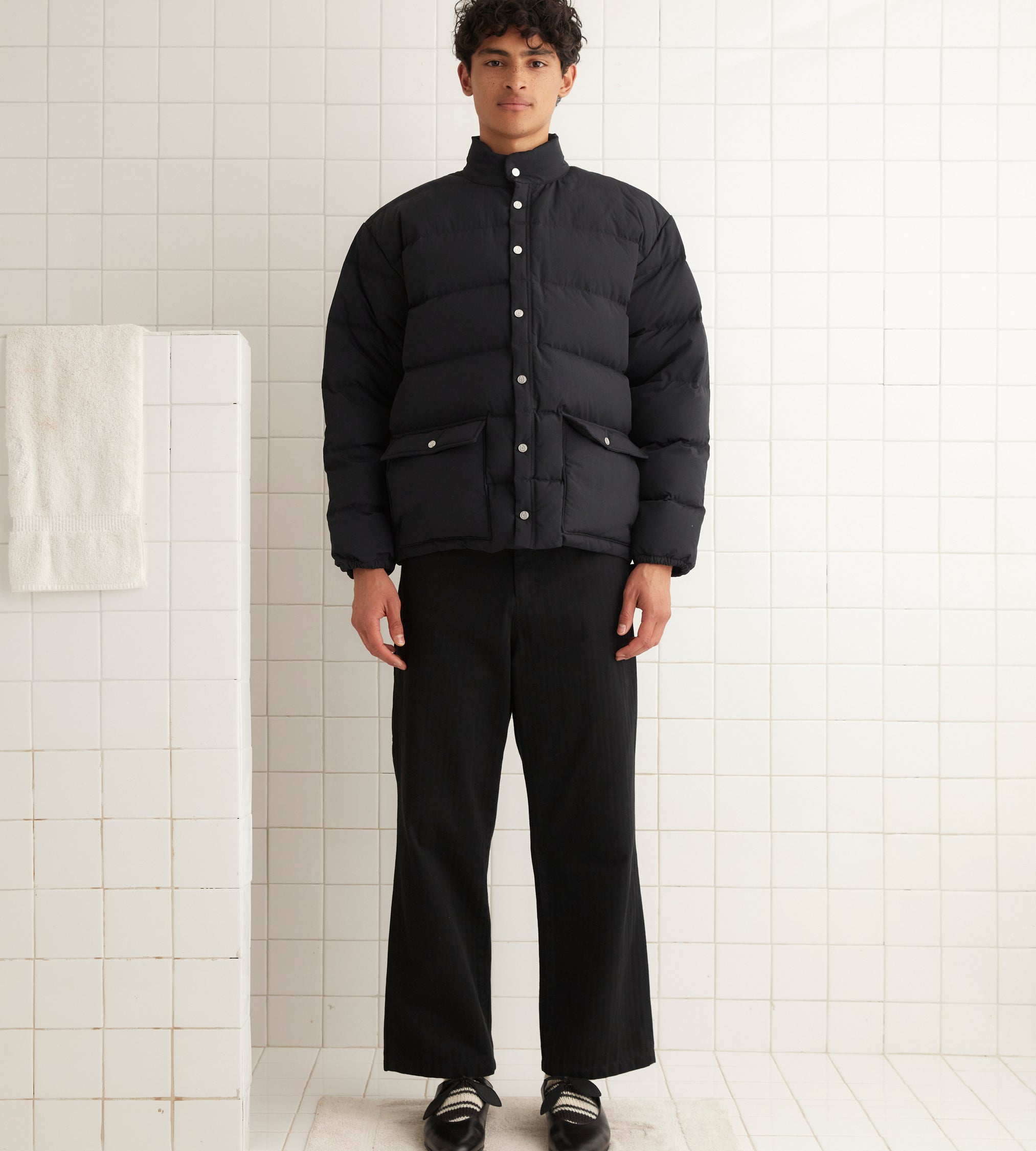 This style is inspired by vintage jackets worn by Emily’s parents, who wore the original puffers to hike to Everest Base Camp. The jacket is made in the United States at a factory which produces Olympic uniforms. It closes with snap buttons featuring a horseshoe and star motif.
