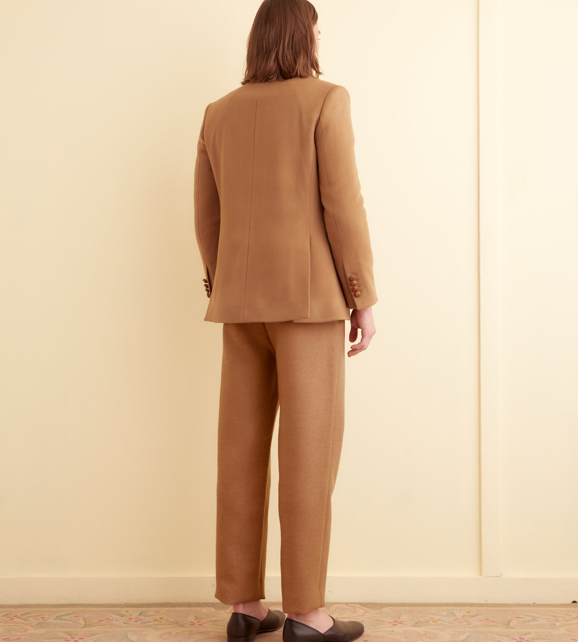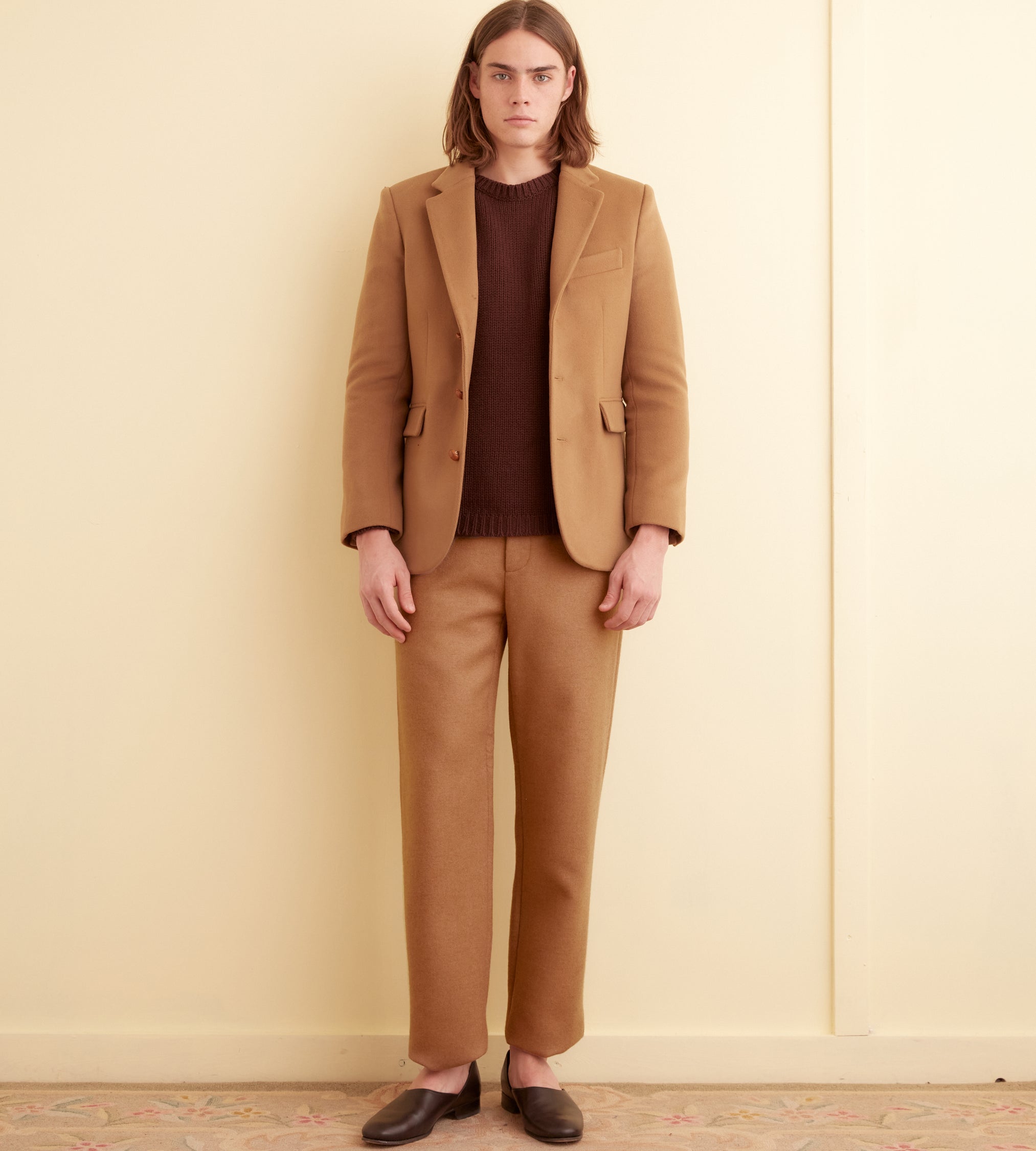 This jacket is inspired by men’s suiting from the midcentury. We reproduced the silhouette in camel-colored wool with woven leather buttons.