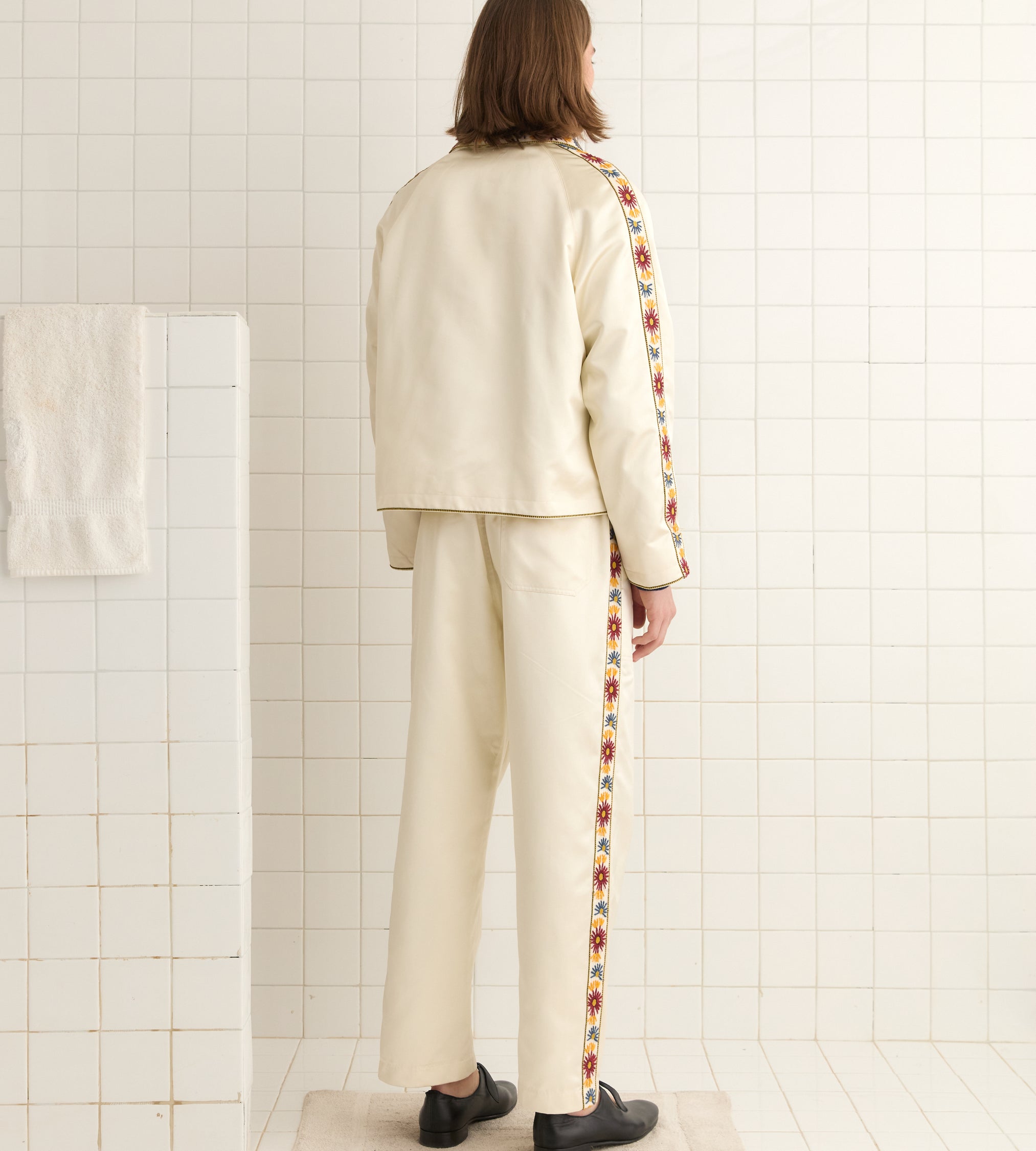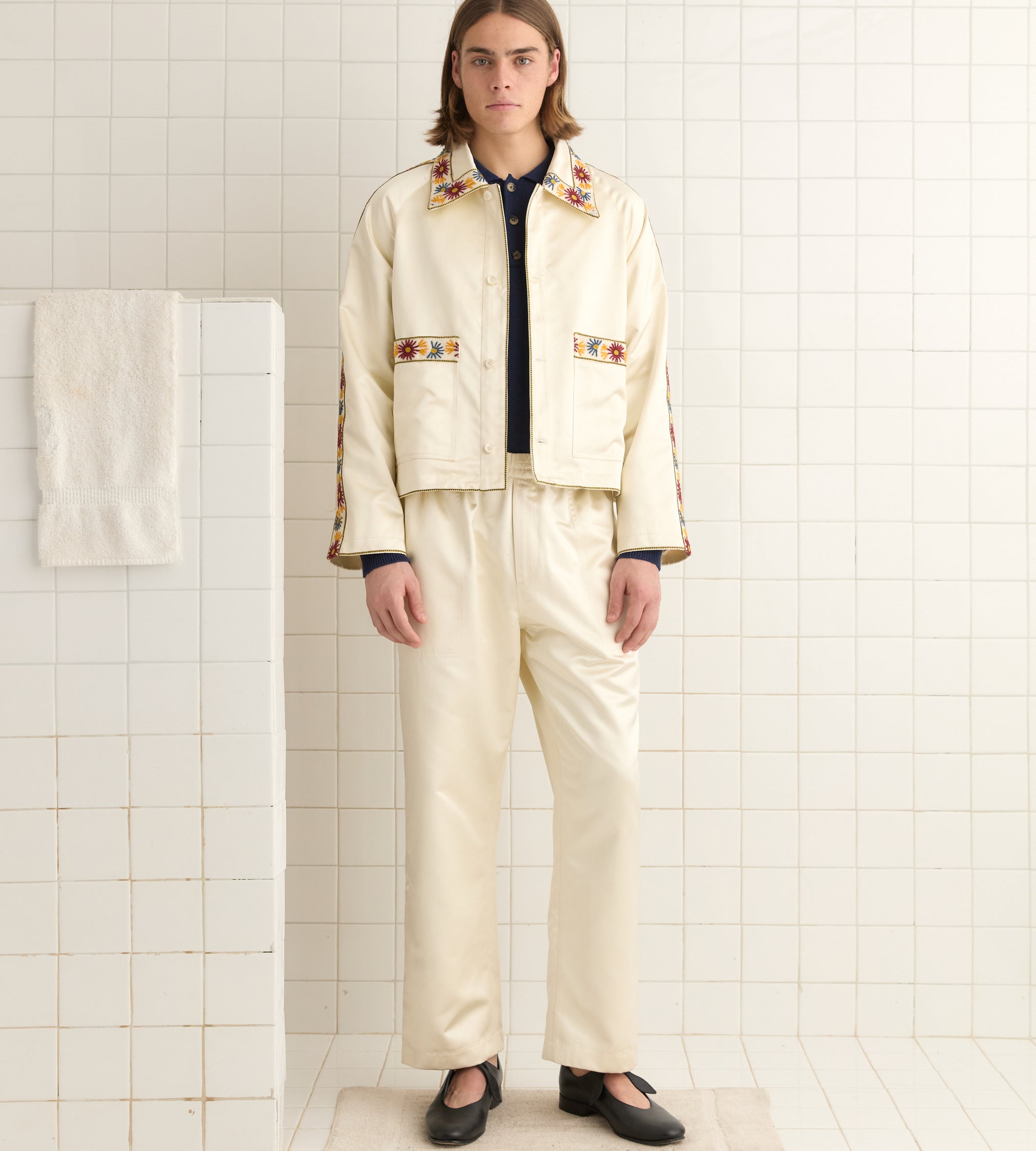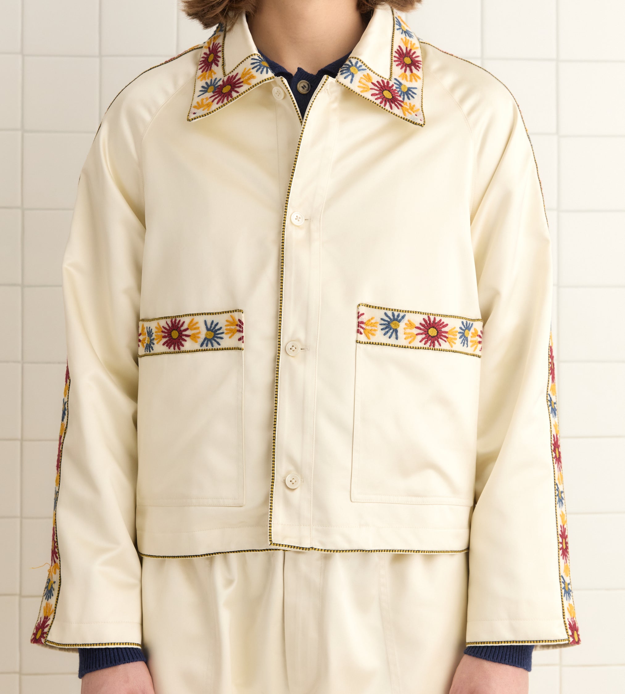 This jacket is inspired by an organza collar from the 1960s, which featured colorful yarn embroidery. We reproduced the embroidered floral trim for this style, appliquéd around the collar, sleeves, and pockets.