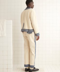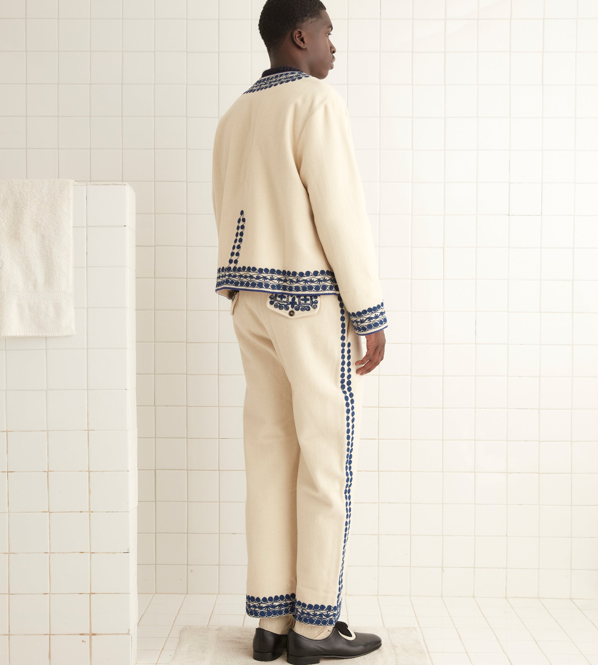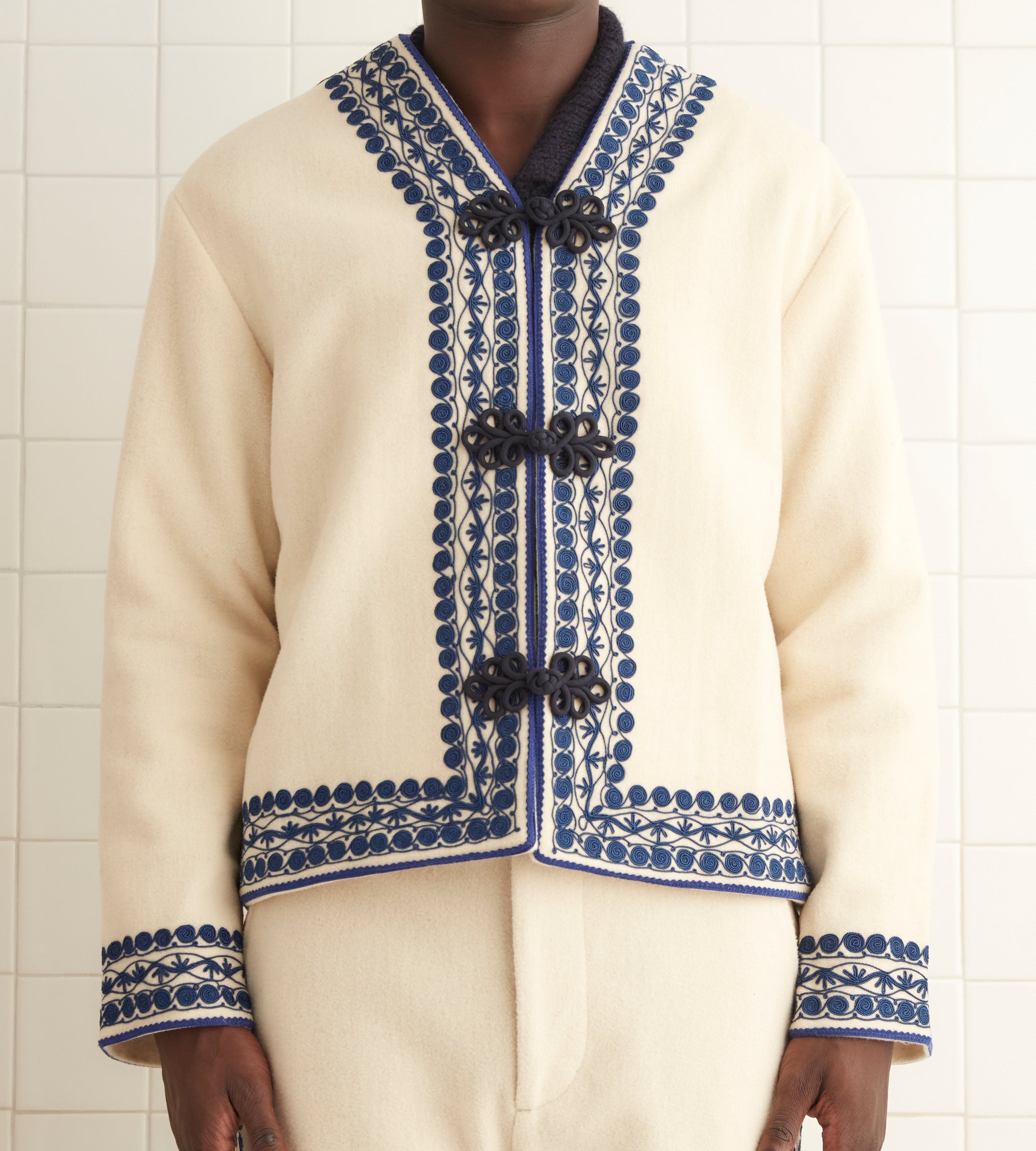 This jacket is inspired by an embroidered waistcoat from Morocco. The original piece dates to the early 20th century and was embroidered with this blue swirl pattern. The jacket is made of undyed cream wool, which has some flecks of color variation due to the nature of the fibers.