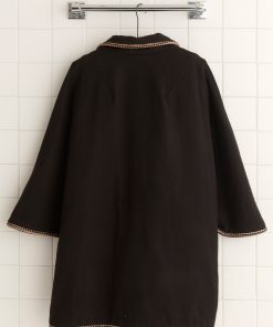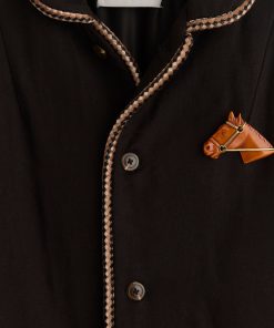 This cape is inspired by an Edwardian Revival jacket, circa 1960s. It features crochet trim and a removable horse-head brooch.
