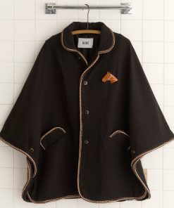 This cape is inspired by an Edwardian Revival jacket, circa 1960s. It features crochet trim and a removable horse-head brooch.