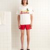 These shorts are inspired by a jockey jacket from the 1950s, which was colorblocked with sections of pink, blue, and gold. We reproduced the colorblocking for this style, which has a short inseam and a wide leg opening.