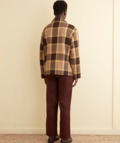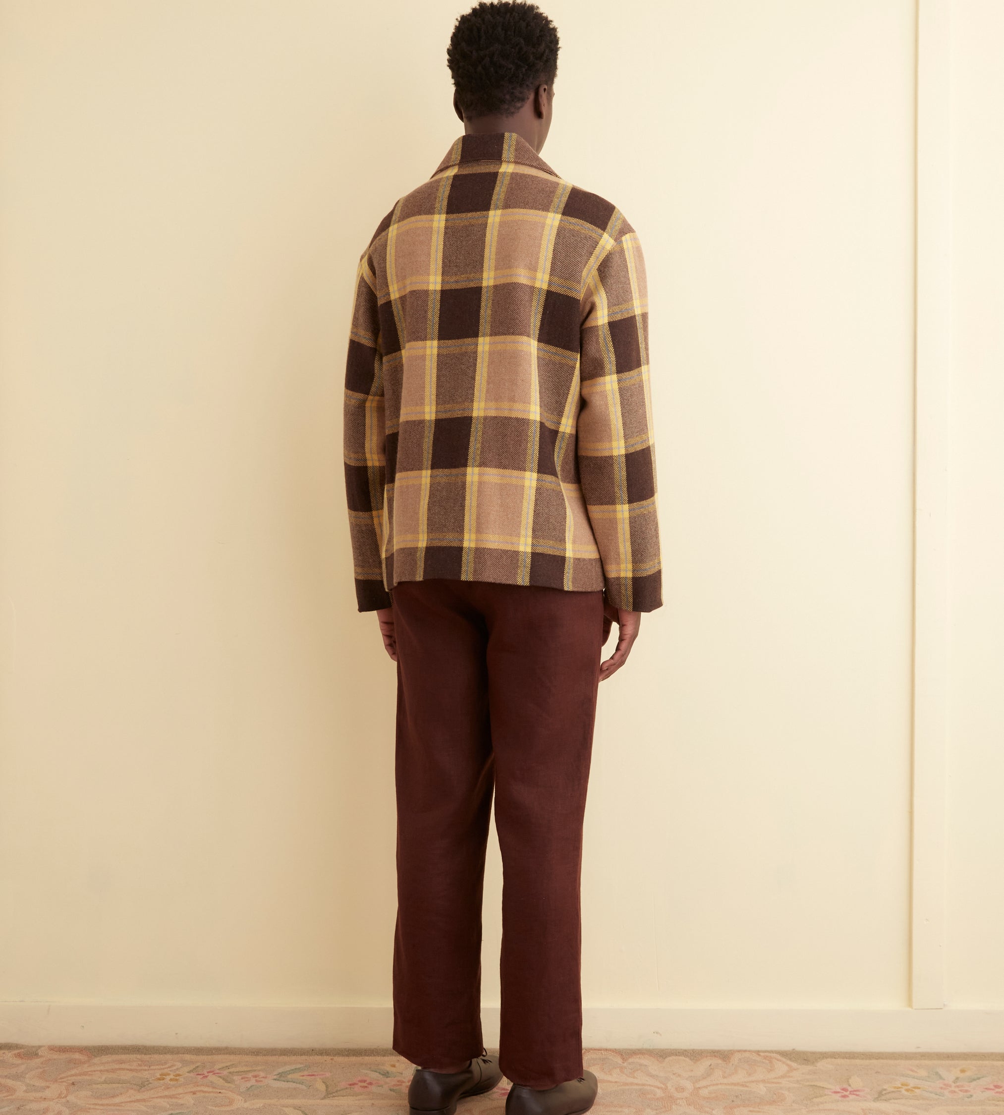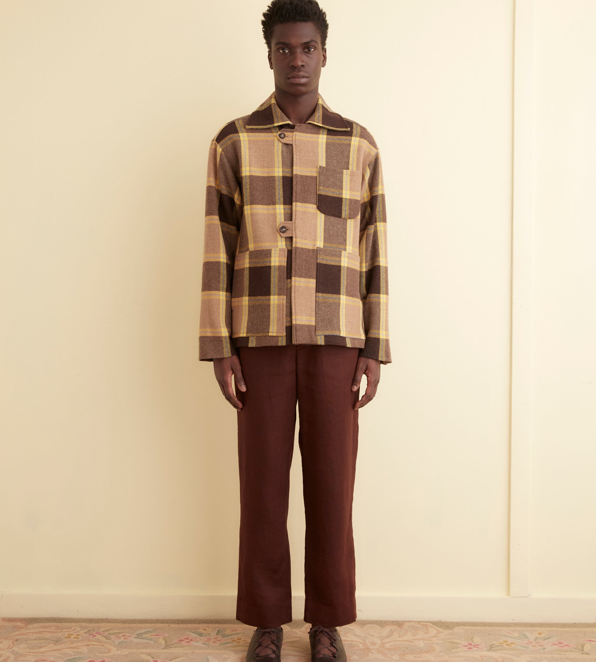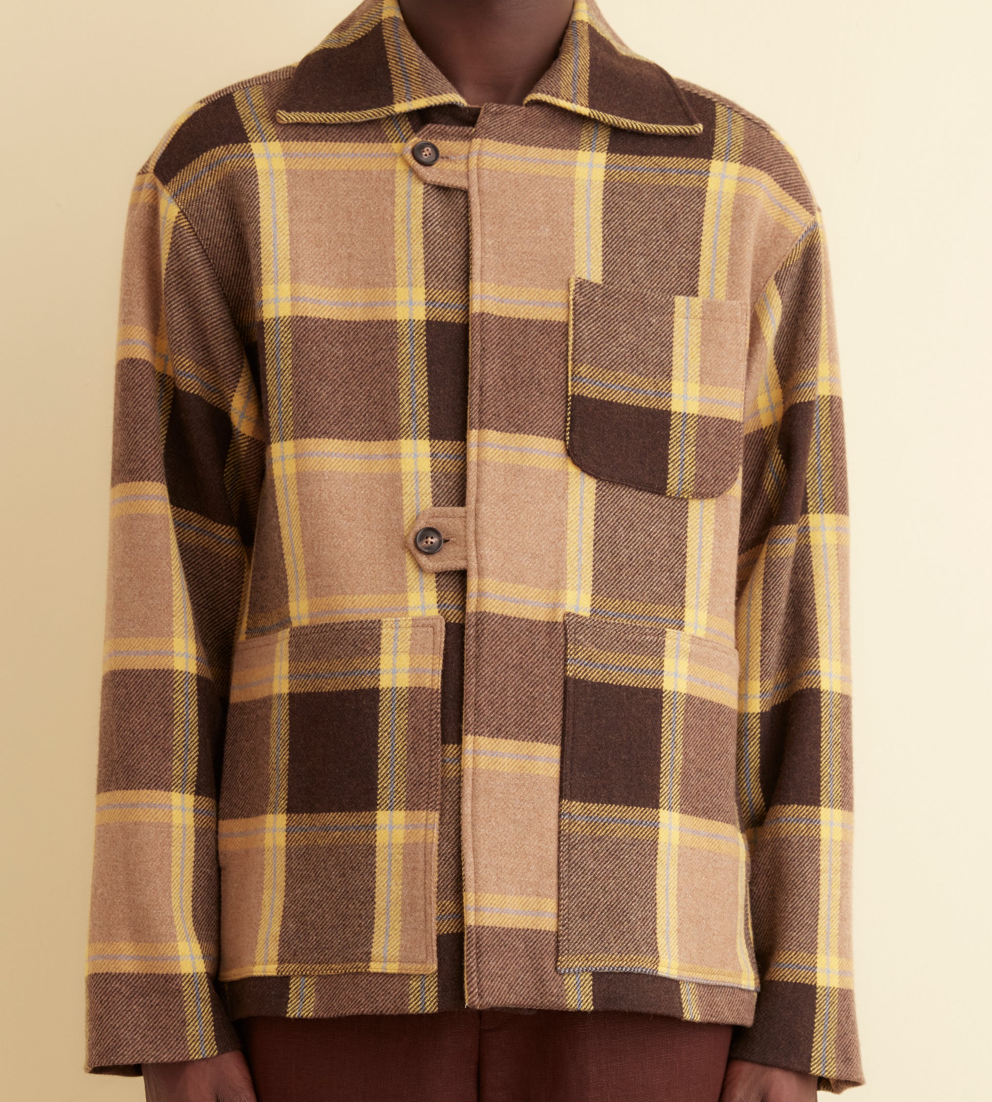 This jacket is inspired by workwear from the midcentury. We reproduced the silhouette in brown plaid fabric inspired by a wool blanket from the 1950s.