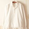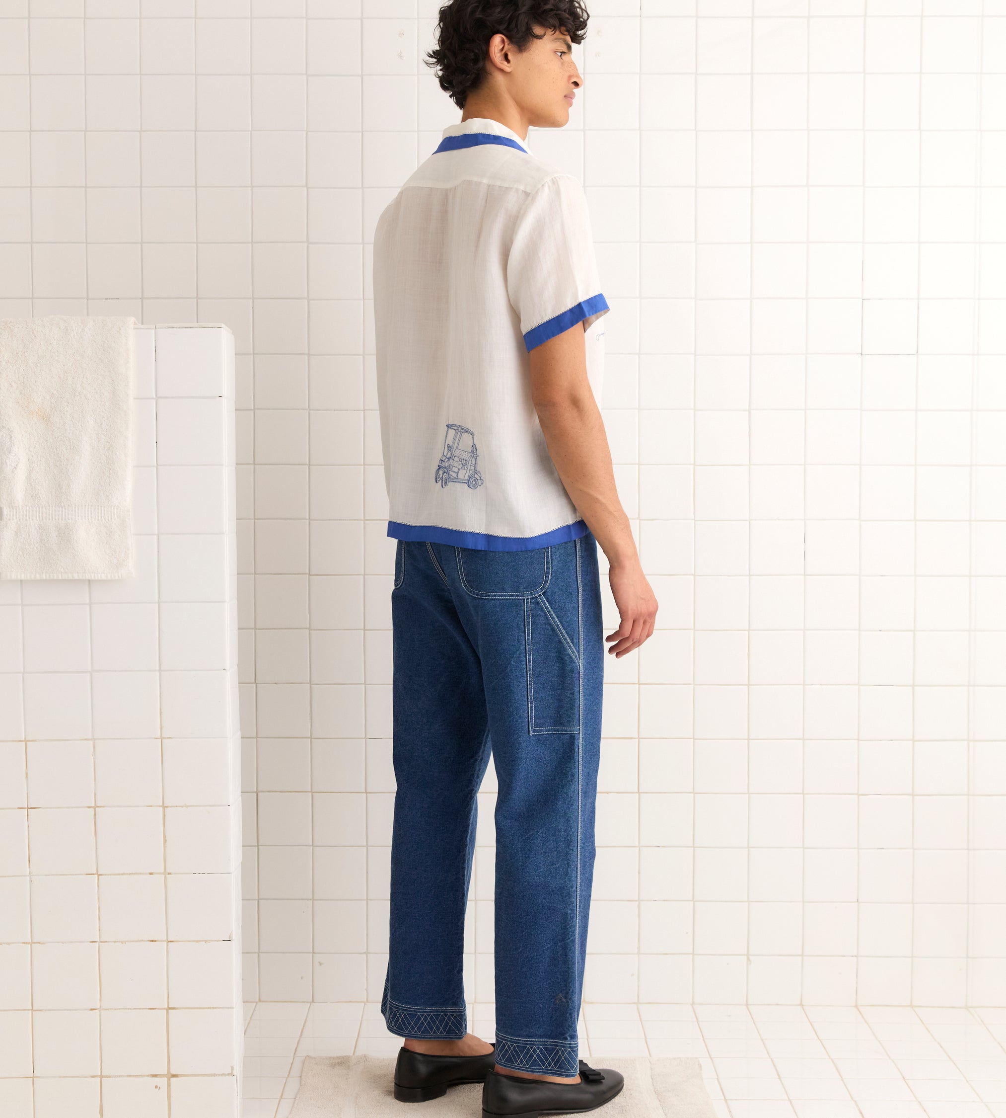 This shirt is inspired by a printed golf tablecloth from the 1980s. We reproduced motifs from the original pattern—a player, a hole, and a golf cart—for this style, embroidered in a delicate single-thread style. The shirt features appliquéd trim around the collar, hem, and cuffs.