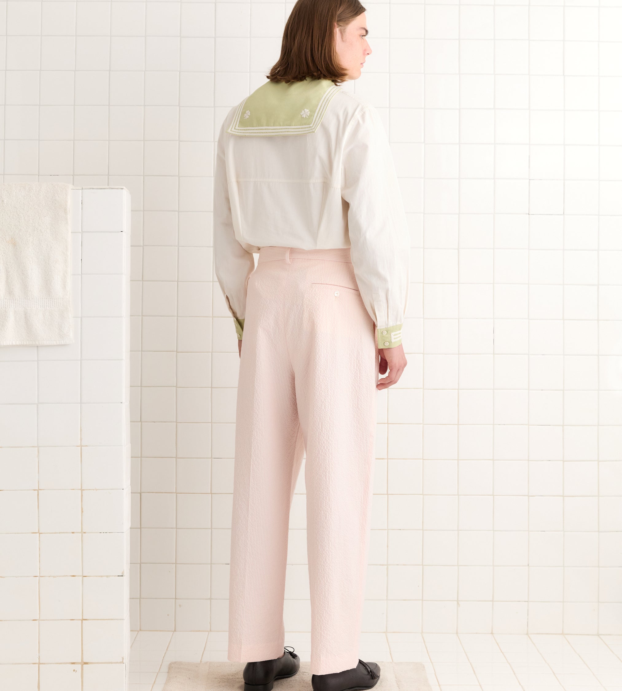These trousers are inspired by men’s suiting from the 1950s-1960s. We reproduced the silhouette in pink seersucker. The trousers have a high rise and a wide leg.