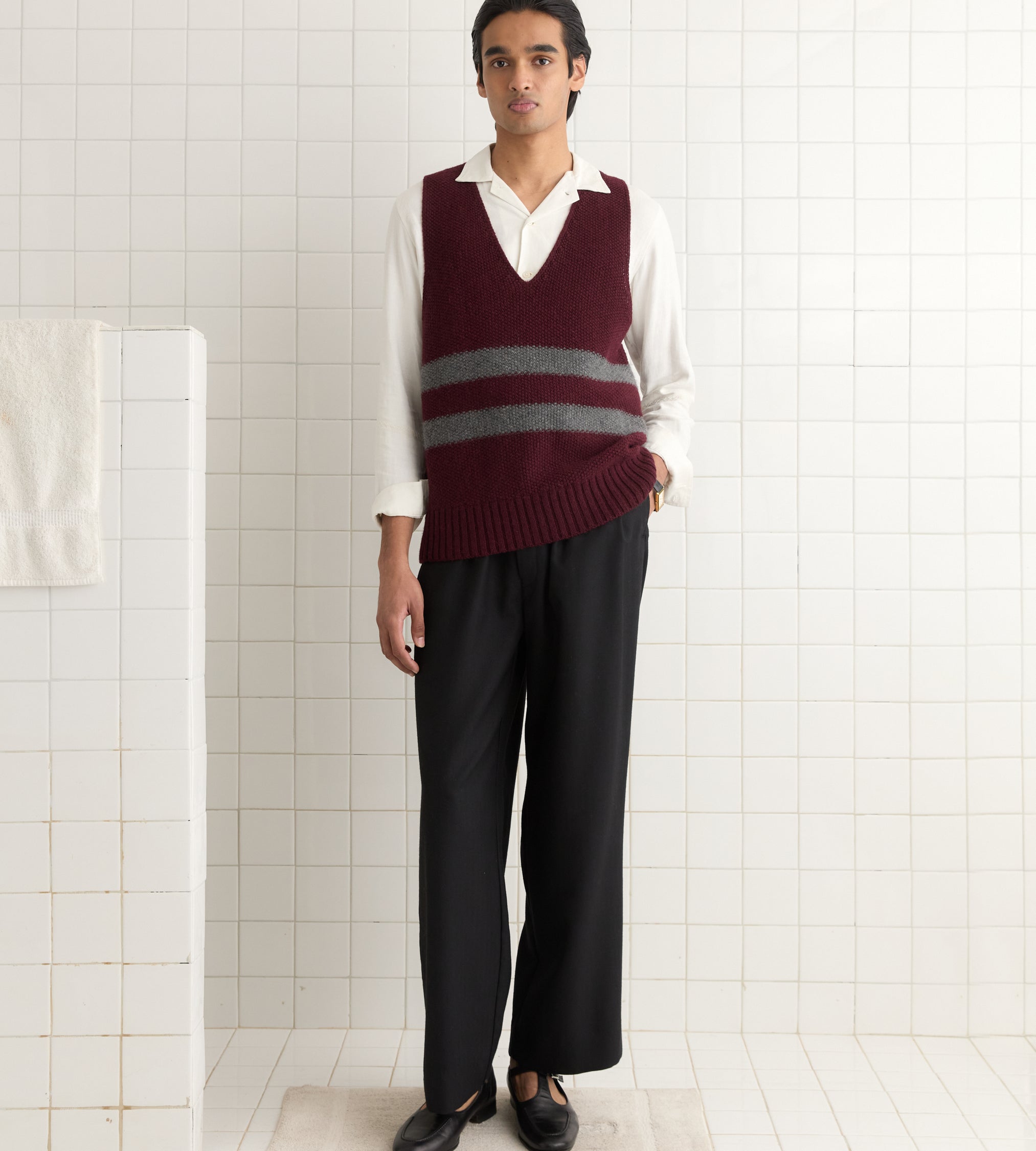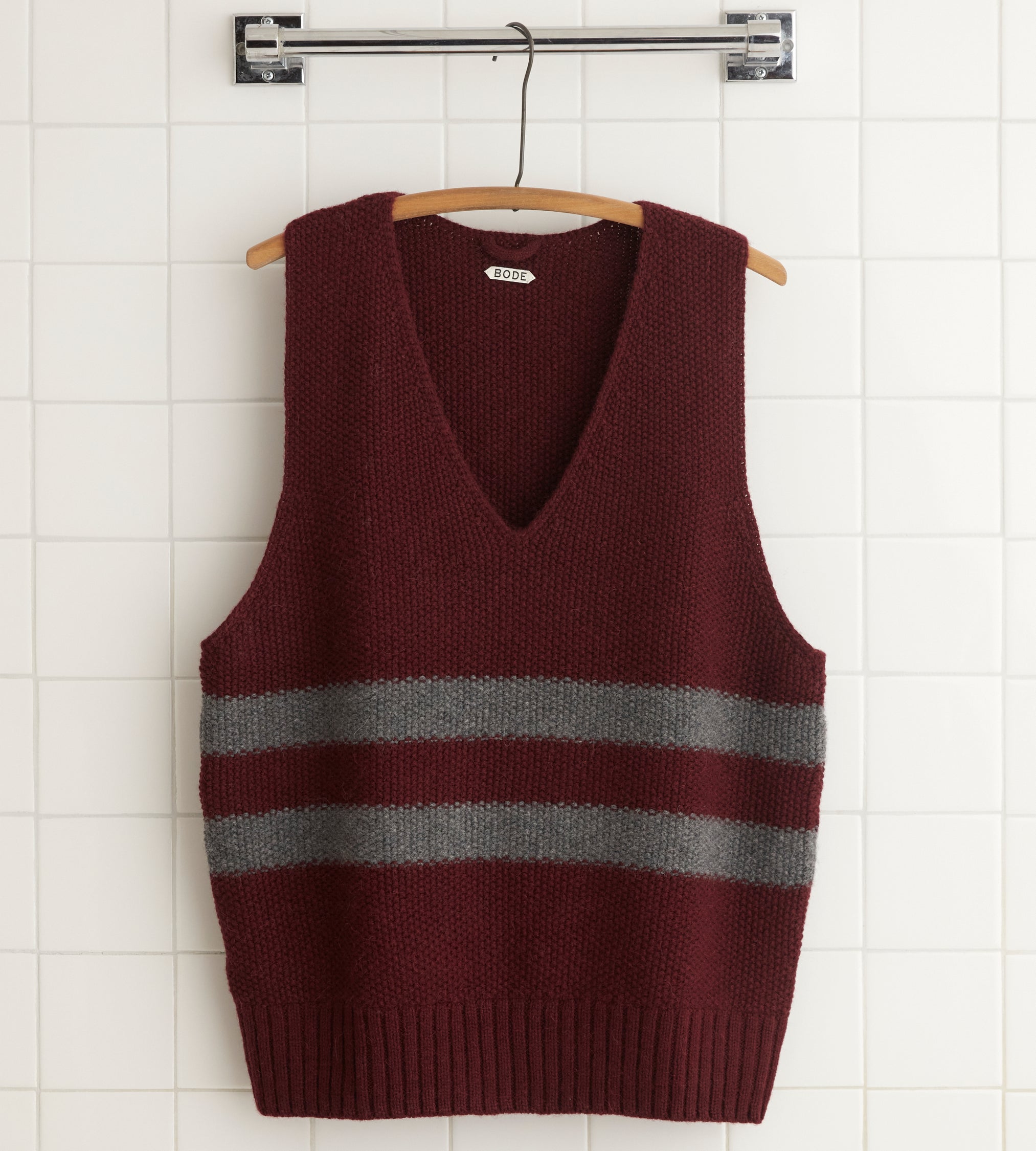 This sweater vest is a historical reproduction of a homemade vest from the 1950s. It is knit in a textured seed stitch and has two grey stripes on a burgundy ground.