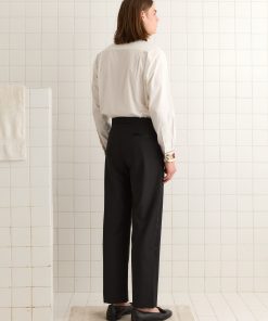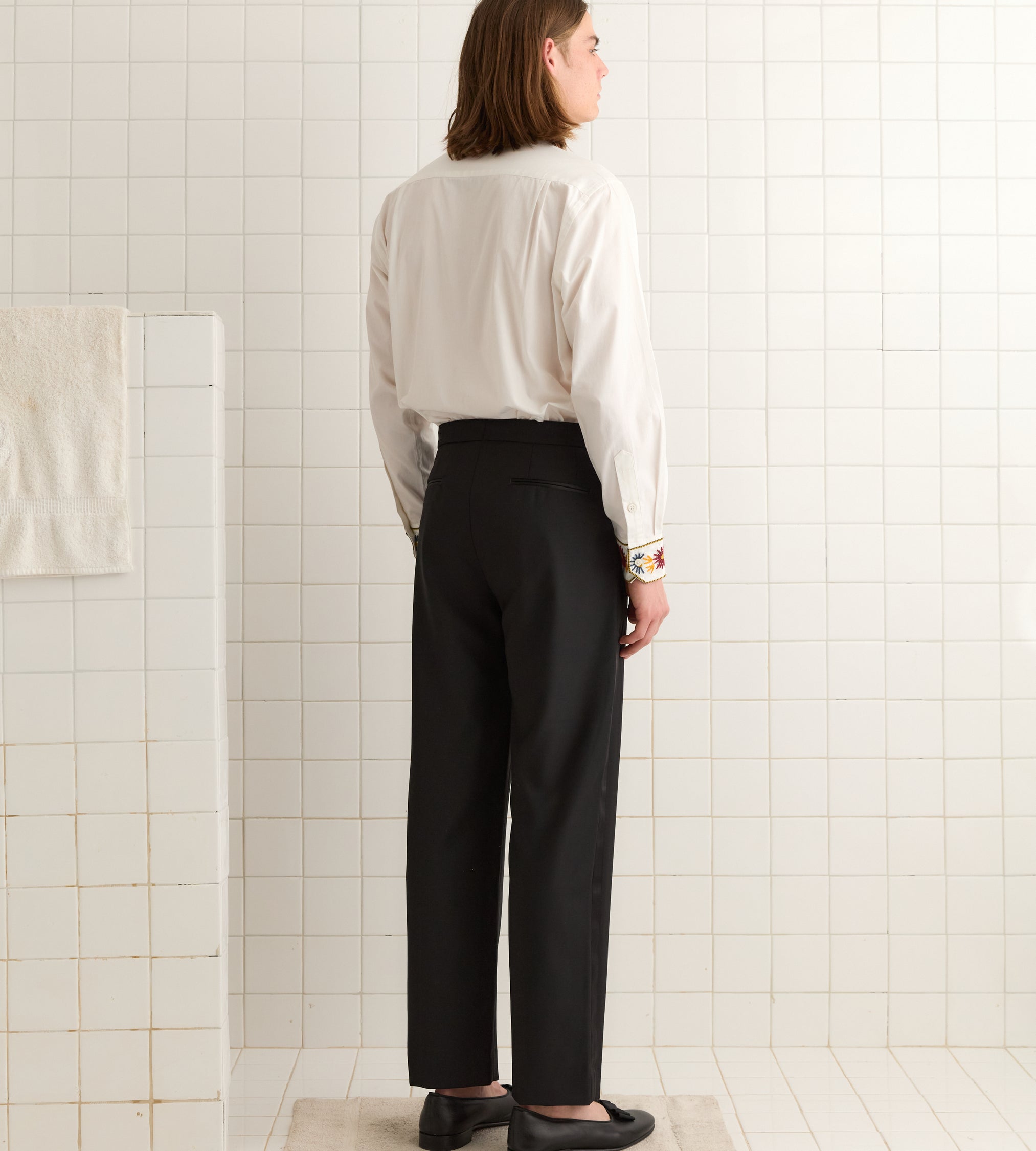 These trousers are inspired by men’s tuxedo pants from the 1950s-1960s. We reproduced the silhouette in fine black wool with a satin side stripe.