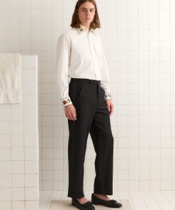 These trousers are inspired by men’s tuxedo pants from the 1950s-1960s. We reproduced the silhouette in fine black wool with a satin side stripe.