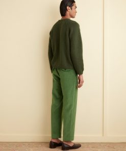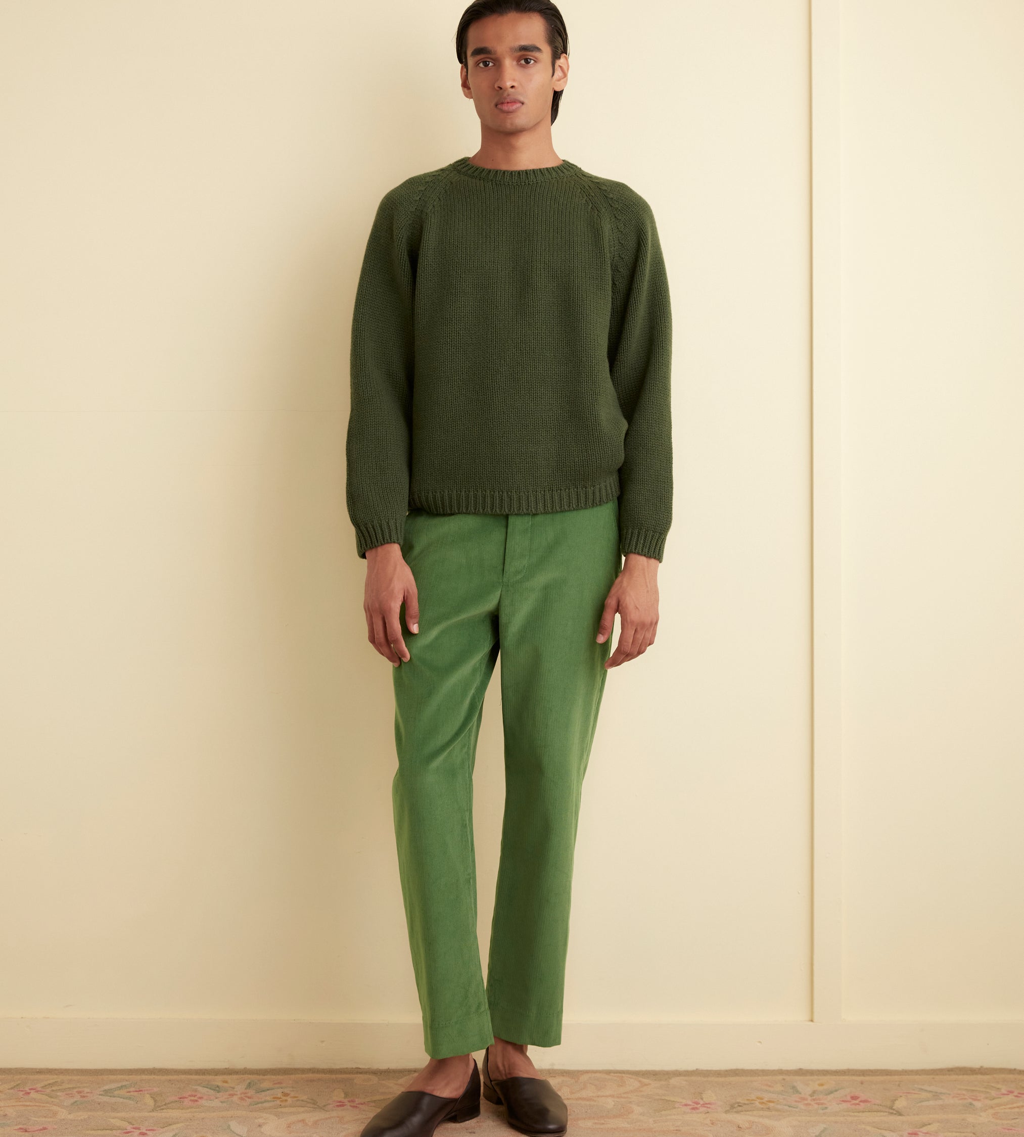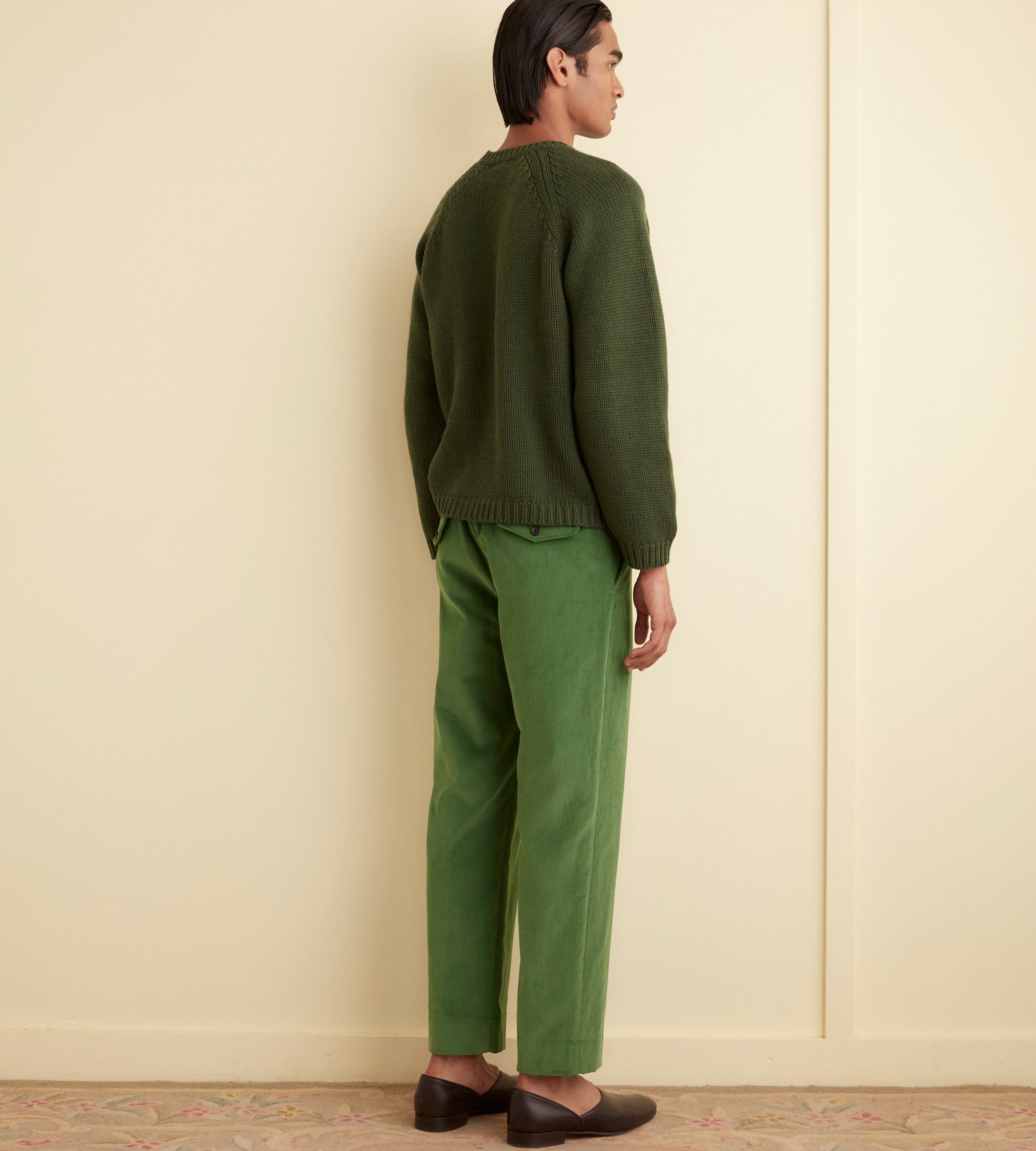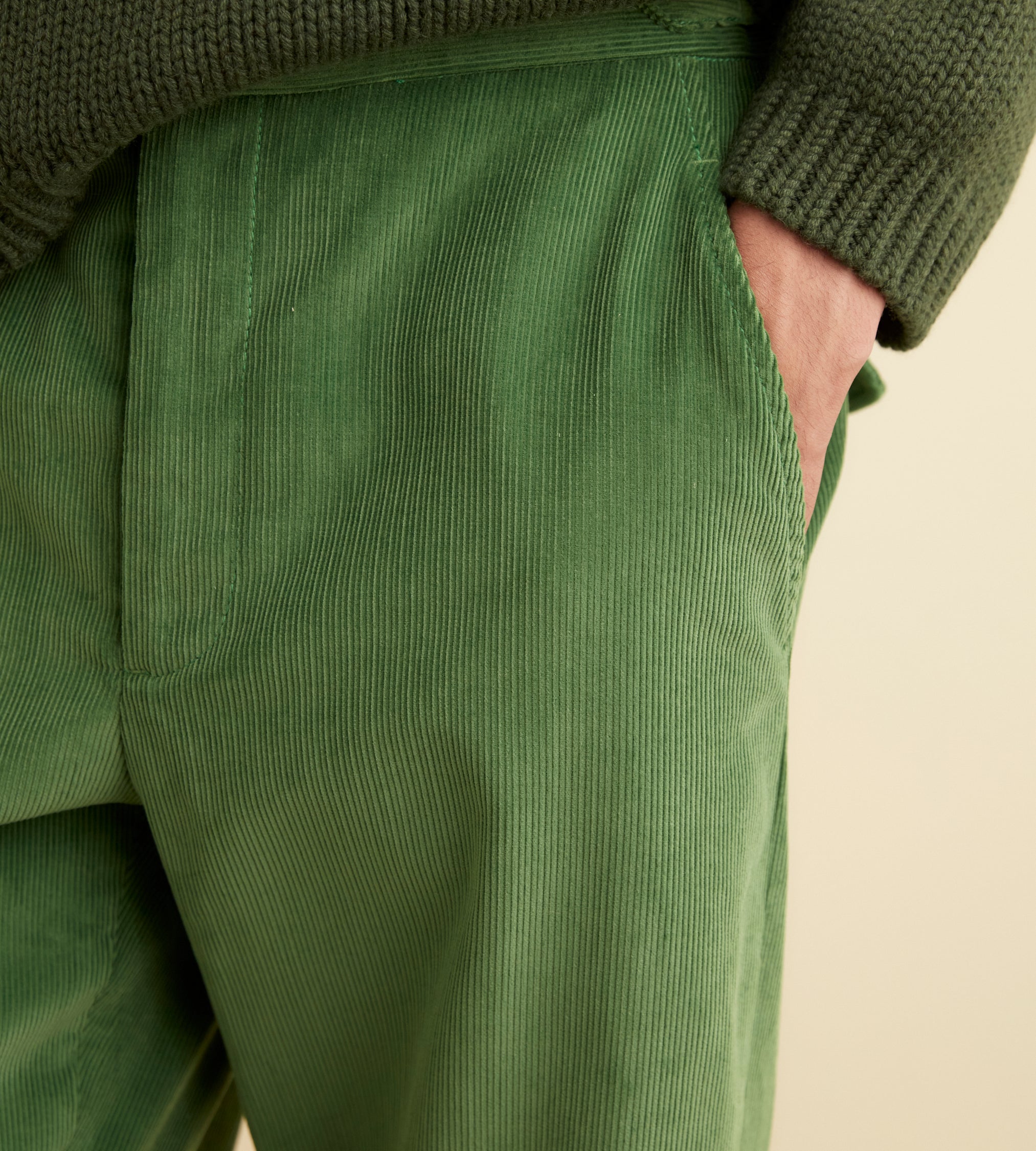These double-button trousers are inspired by midcentury suiting trousers. They are cut from green corduroy and have a mid-rise, straight-leg silhouette.
