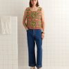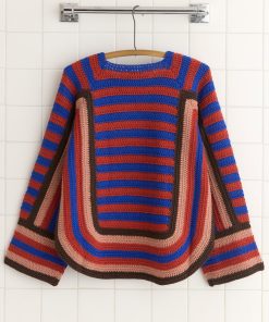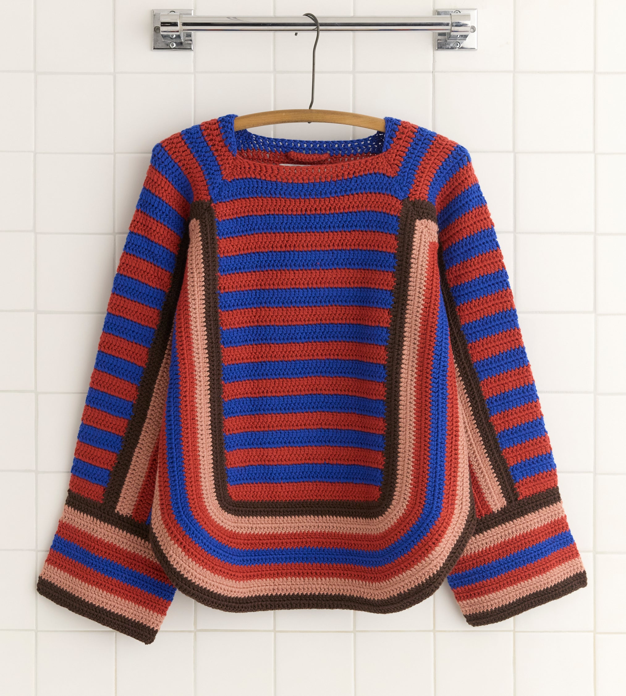 This pullover is inspired by a handmade sweater, circa 1970s. It features a curved hemline, wide sleeves, an open neck, and a stripe pattern in red, blue, brown, and peach.