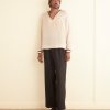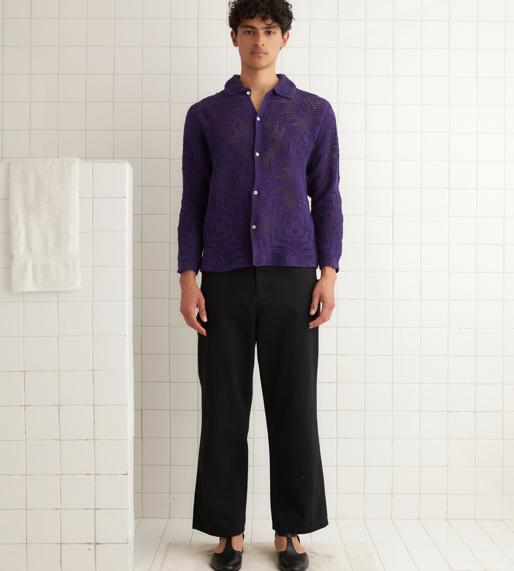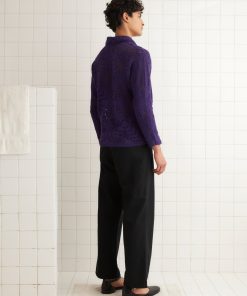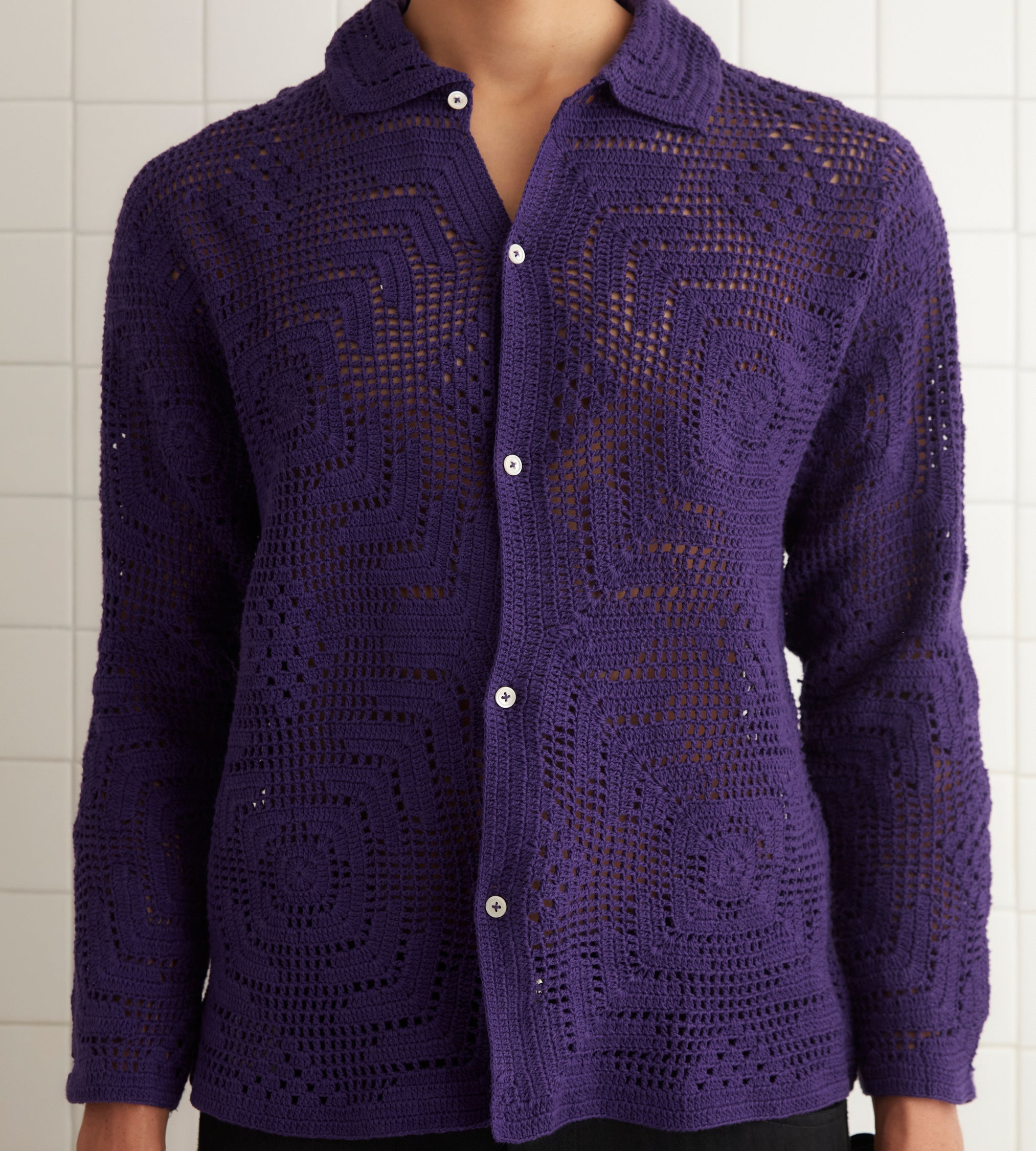 This overshirt is inspired by crochet tablecloths widely common thorughout the 1930s-1940s. We reproduced a crochet pattern in deep purple yarn for this style.