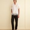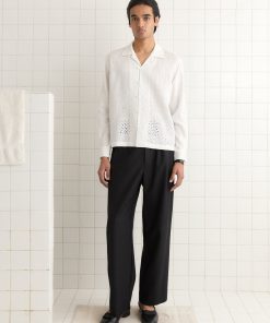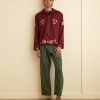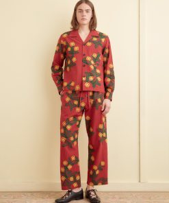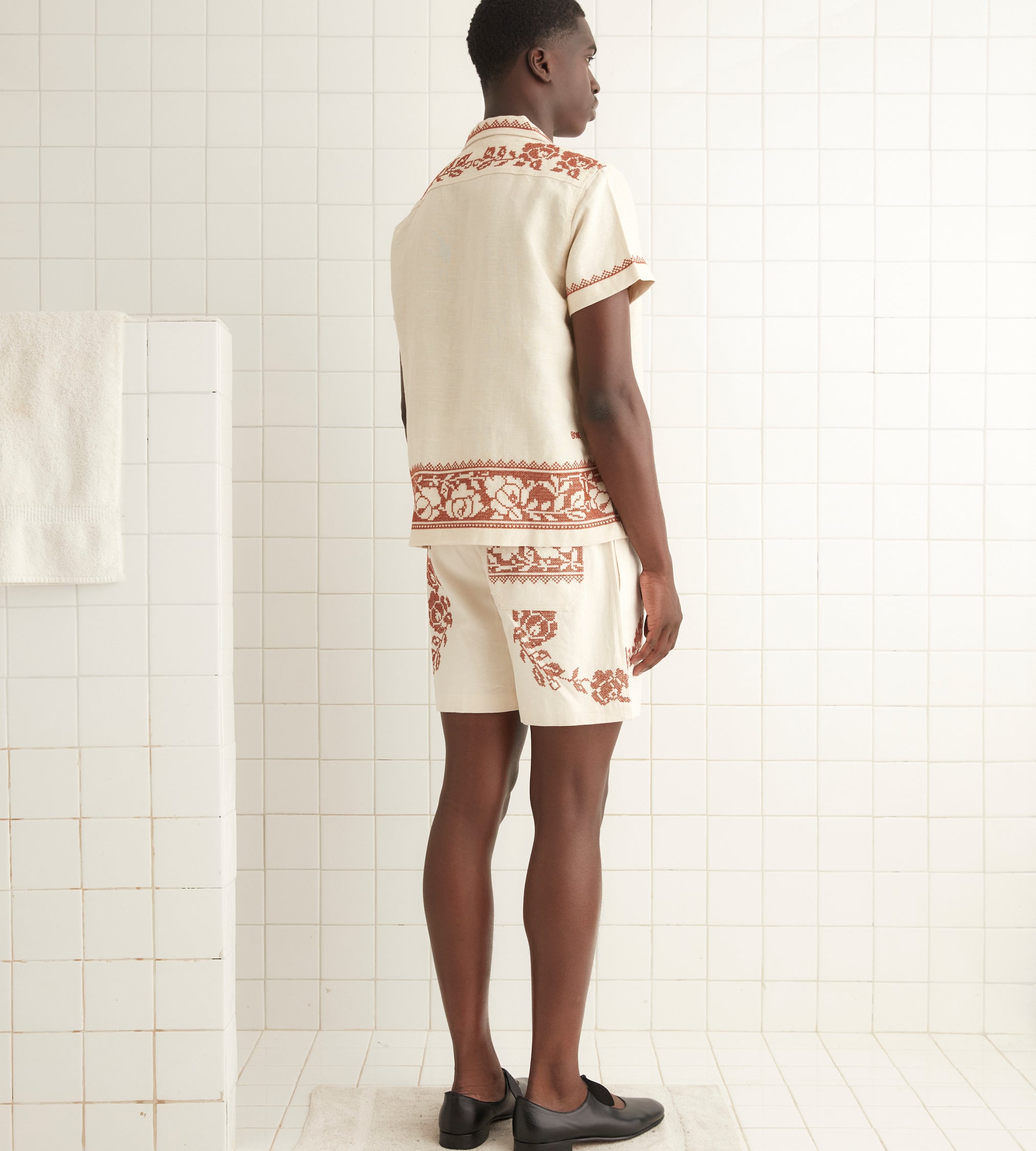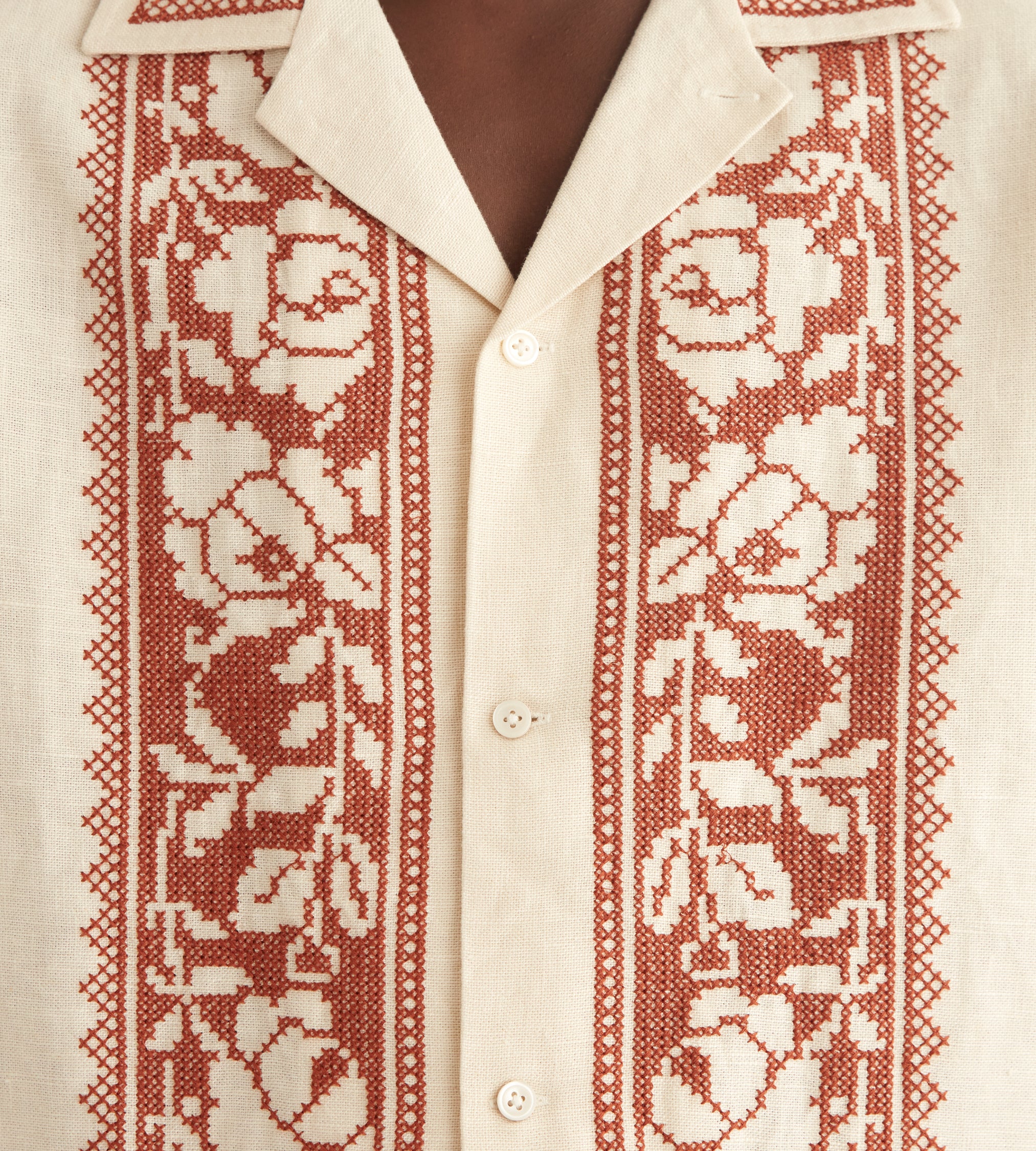 This shirt is inspired by a tablecloth from the 1910s-1930s. We reproduced the embroidered rose border, worked in terracotta-colored cross-stitching, for this style. The shirt is embroidered with “Bode” on the back.