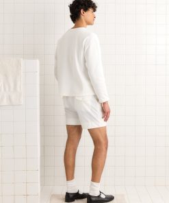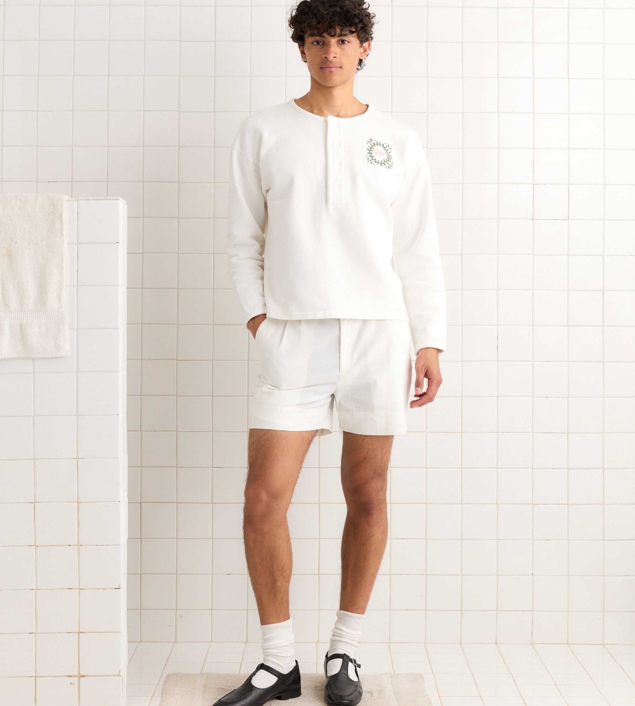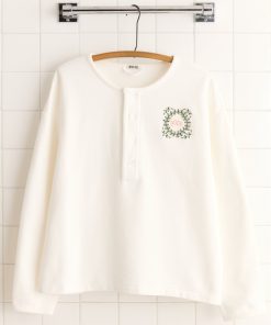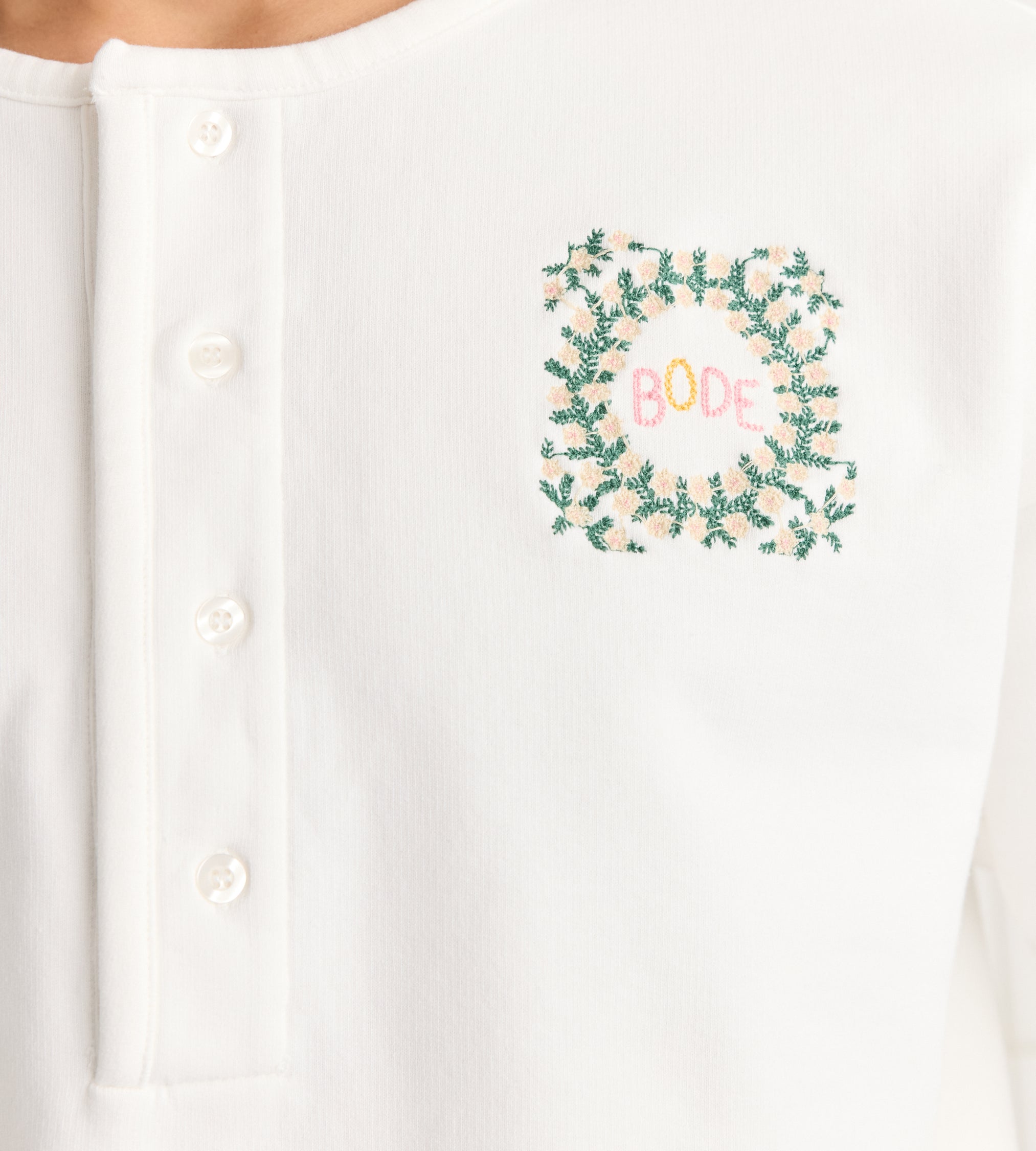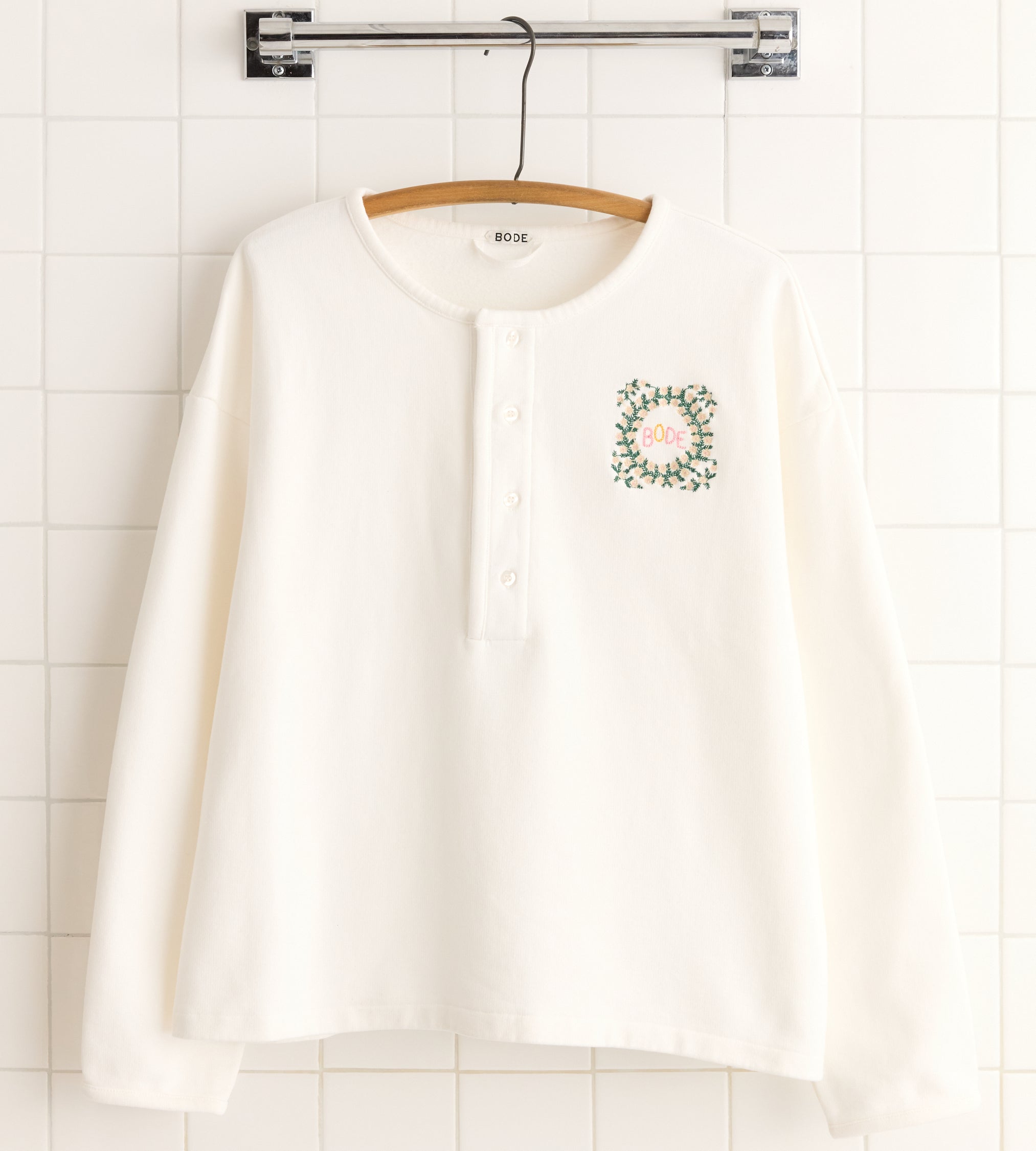 This sweatshirt is inspired by an embroidered henley from the late 20th century. We reproduced the silhouette with an embroidered “Bode” and a wreath of flowers.