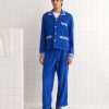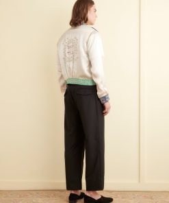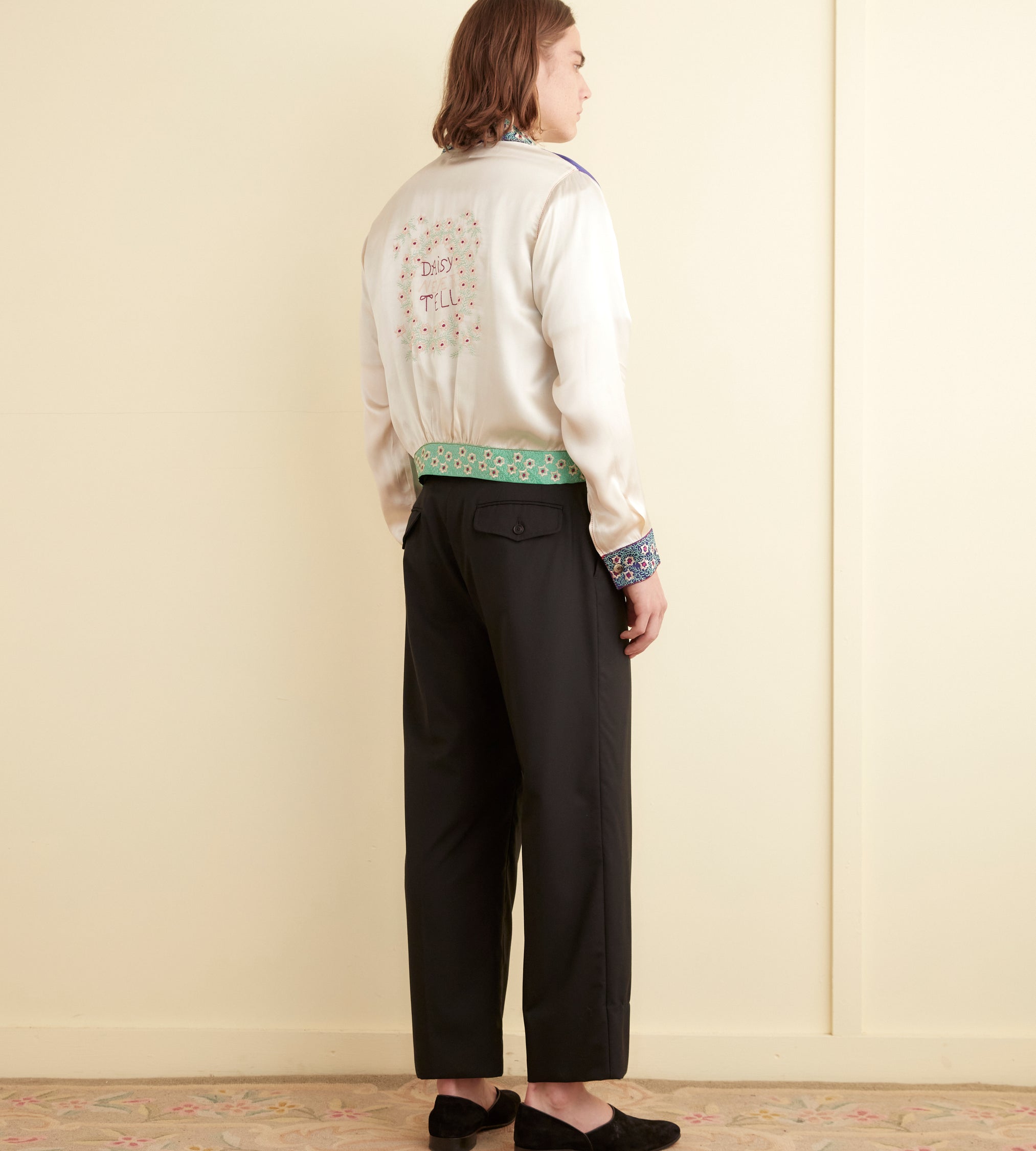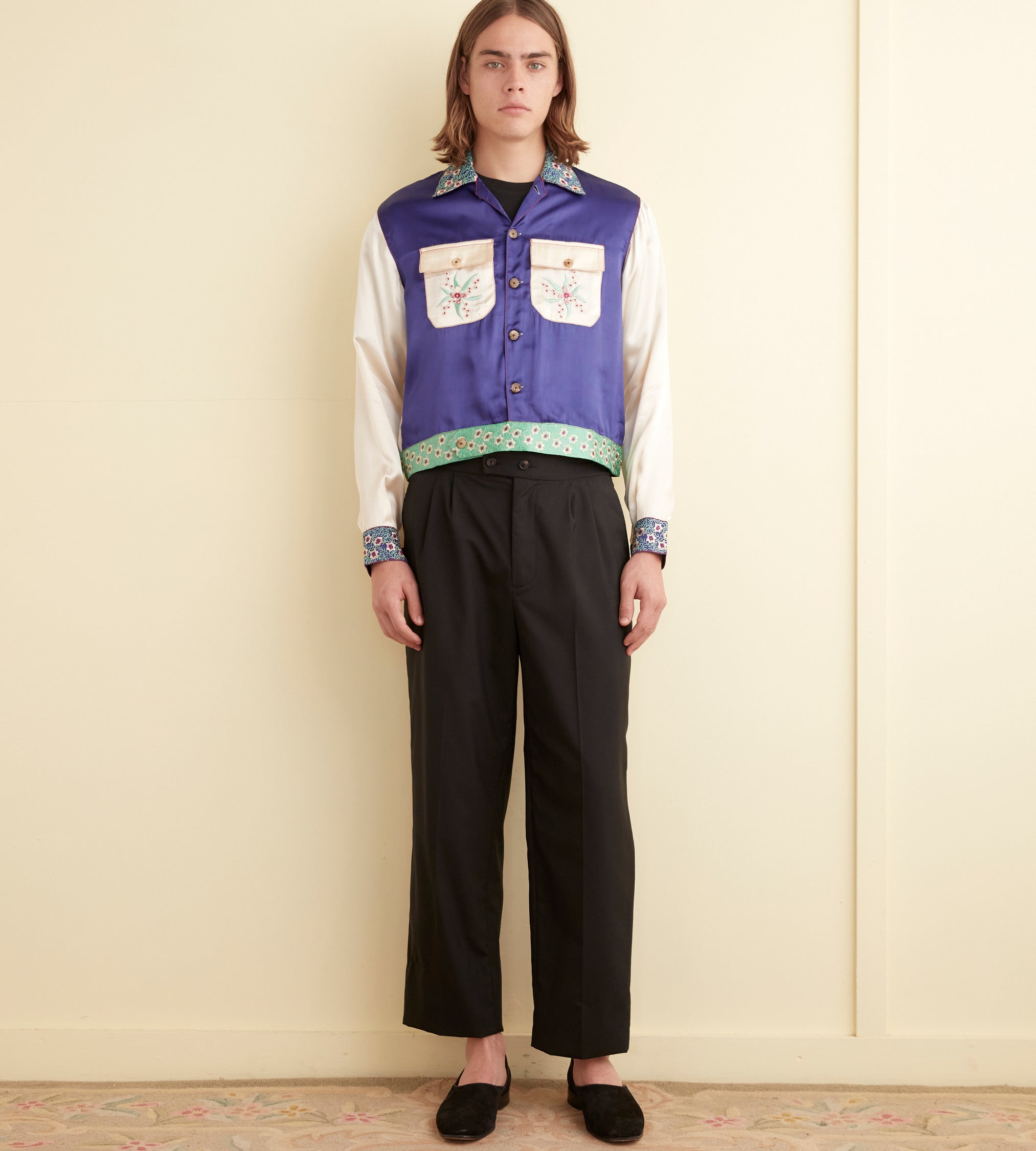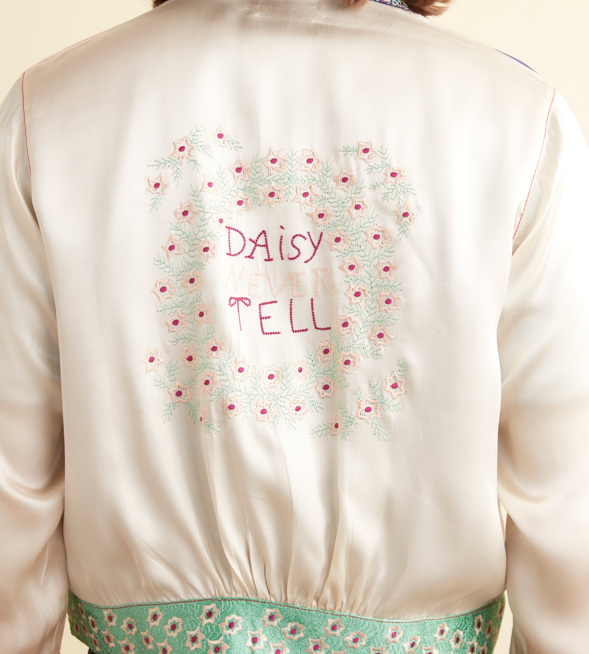 This style is inspired by a midcentury souvenir jacket. We reproduced the original silhouette, with its colorblocked purple and white details, on this jacket, which is embroidered with floral patterns inspired by a quilt from the 1890s-1910s.
