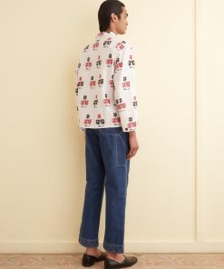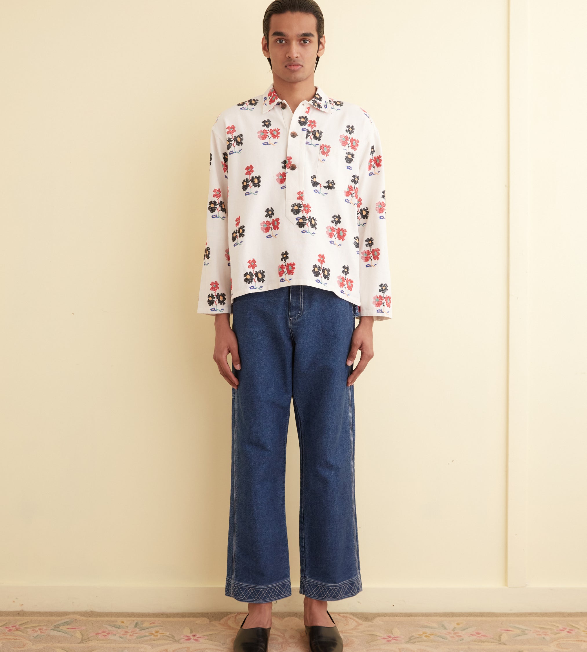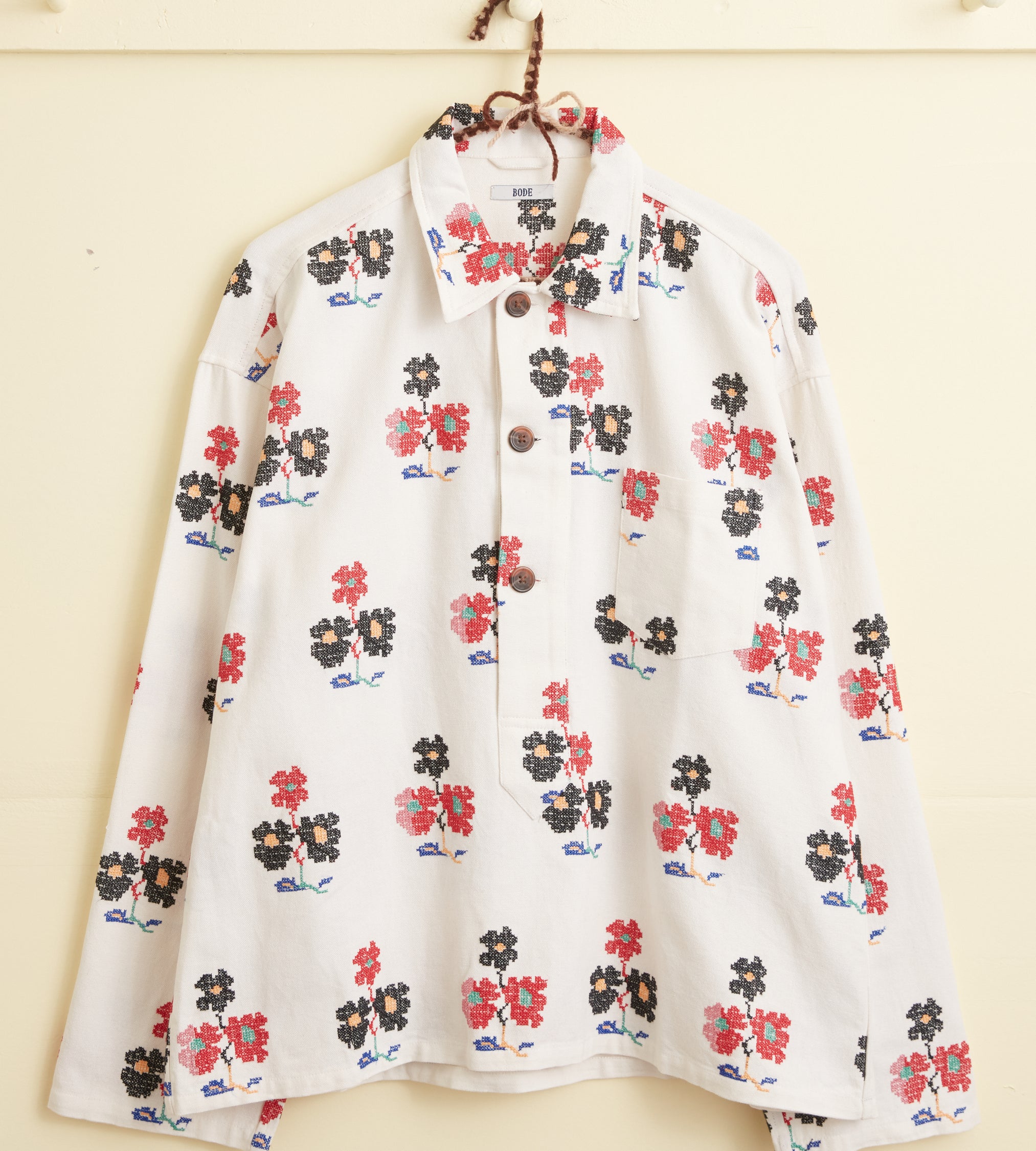 This pullover is inspired by Ukrainian folk embroidery from the early 20th century. We reproduced the red, blue, and black floral pattern for this style.