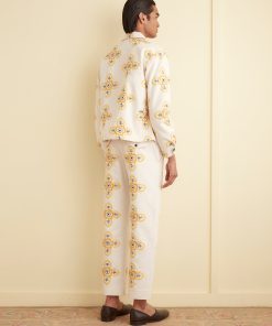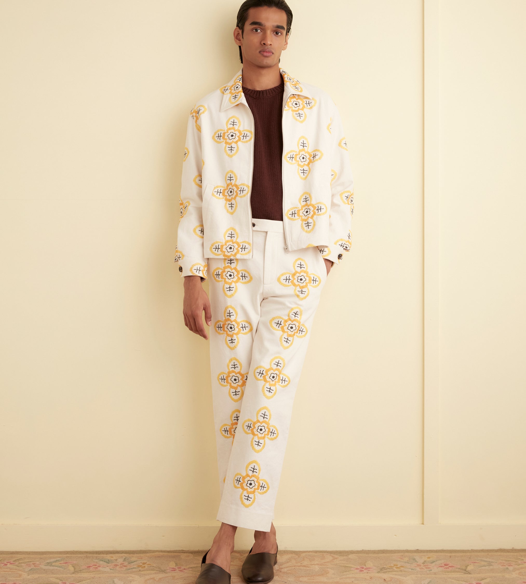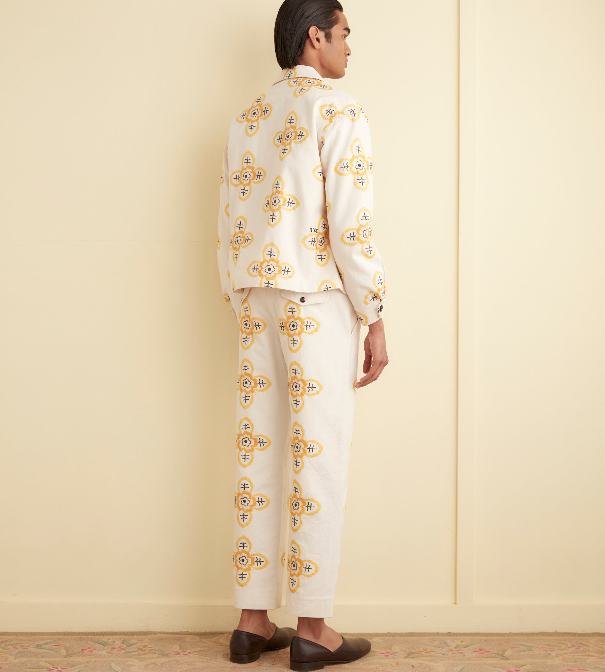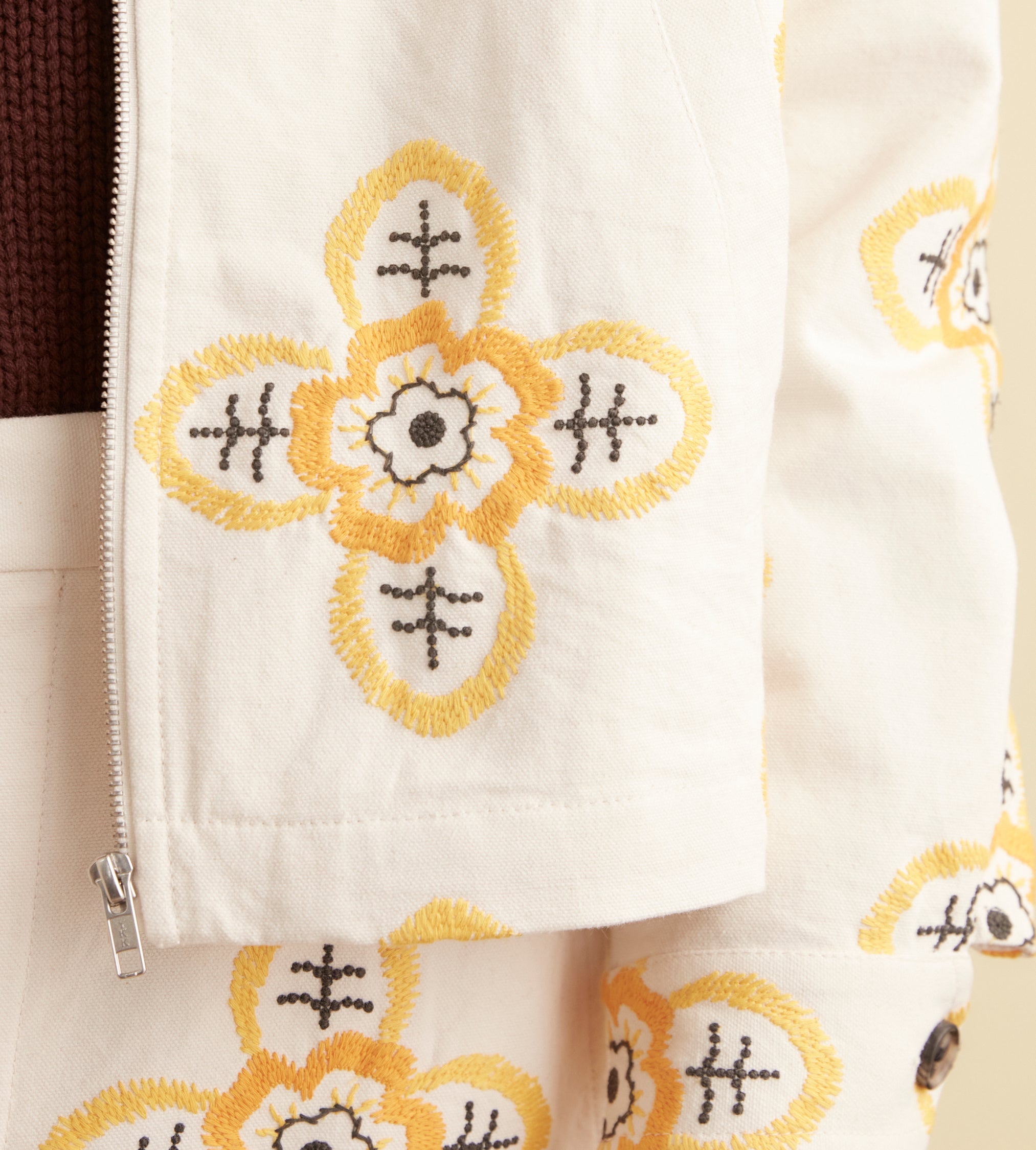 This jacket is inspired by an embroidered tablecloth from the 1930s-1940s. We reproduced the embroidery, a geometric flower motif, for this style.