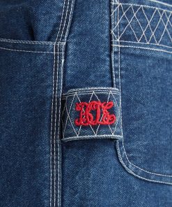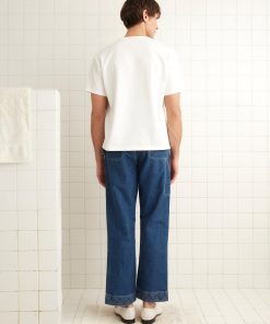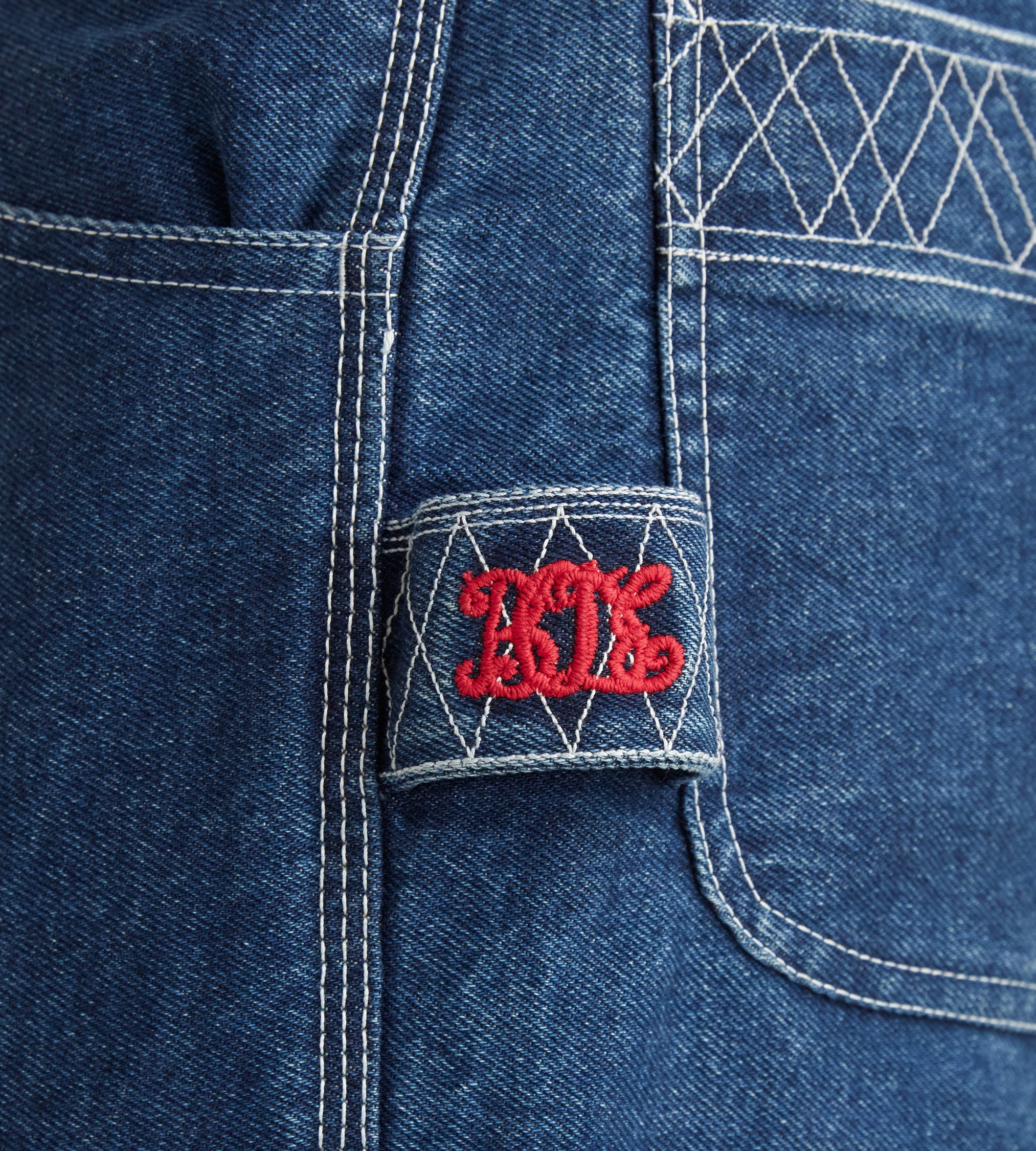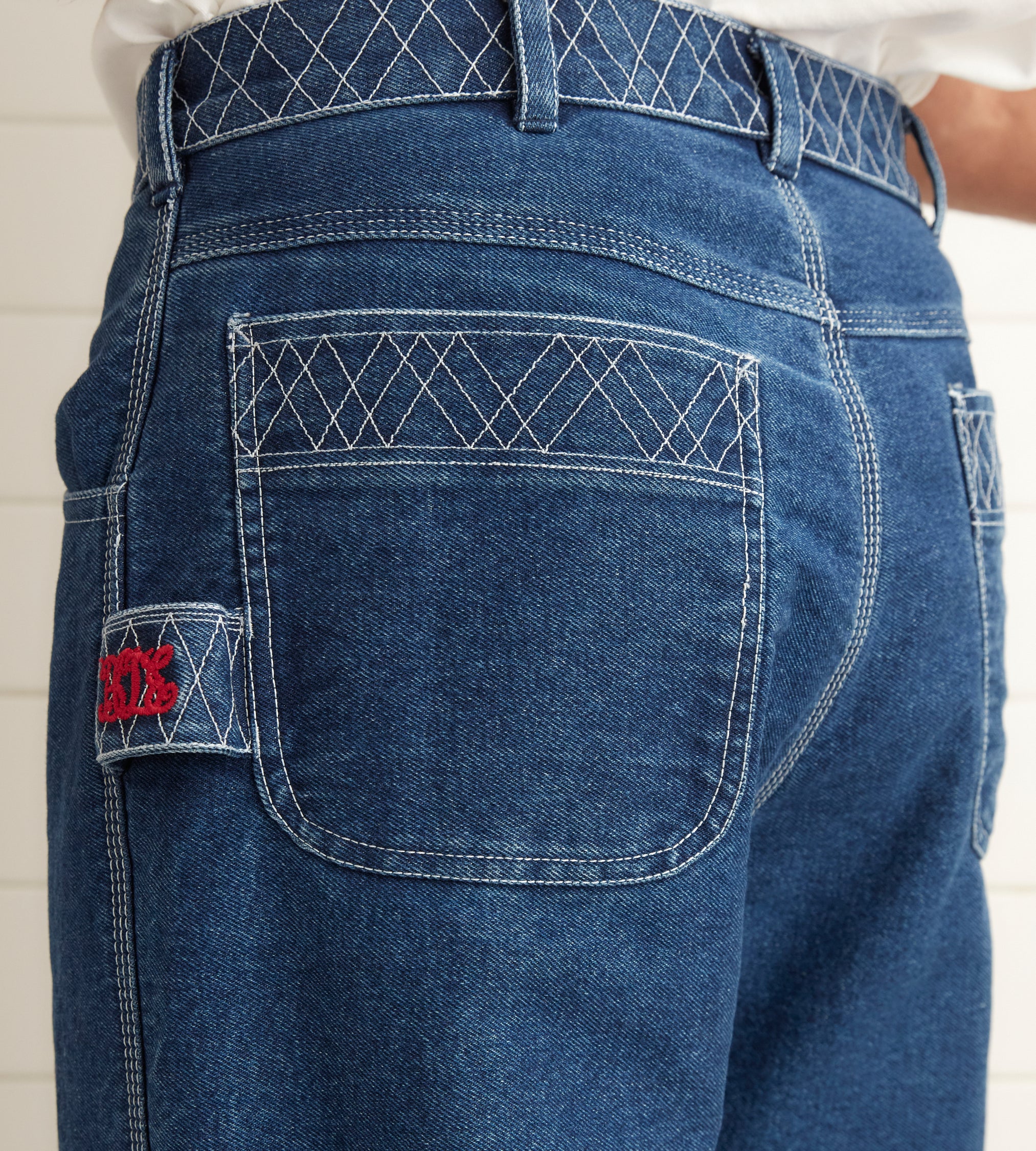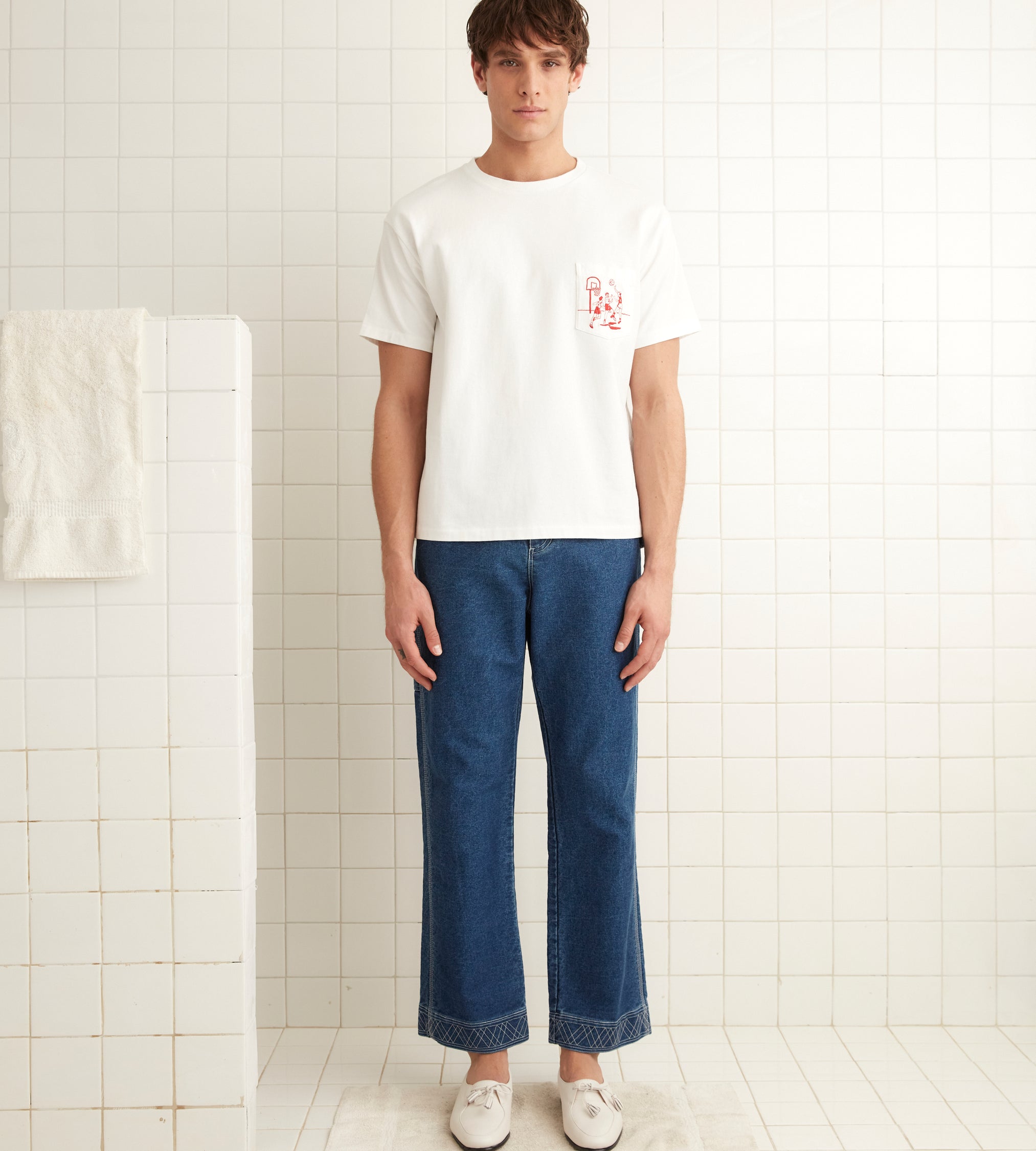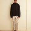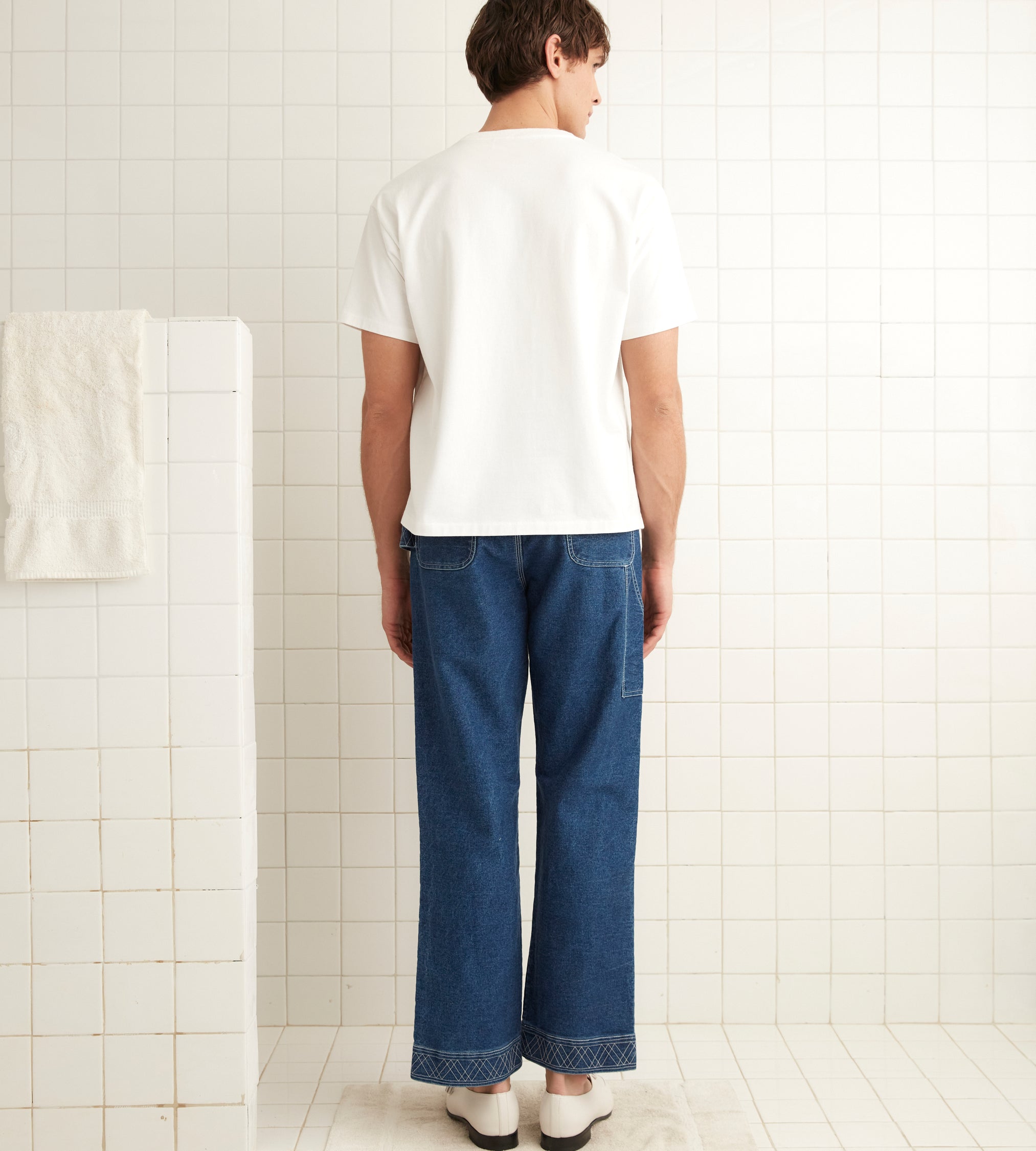 These trousers are based on a 20th-century European smock from Emily’s collection. The original smock was embroidered with a white geometric pattern and a red monogram. We reproduced the embroidery along the waistband and hem of these trousers. The trousers feature a “Knolly Brook, a Bode Product” label above the front right pocket.