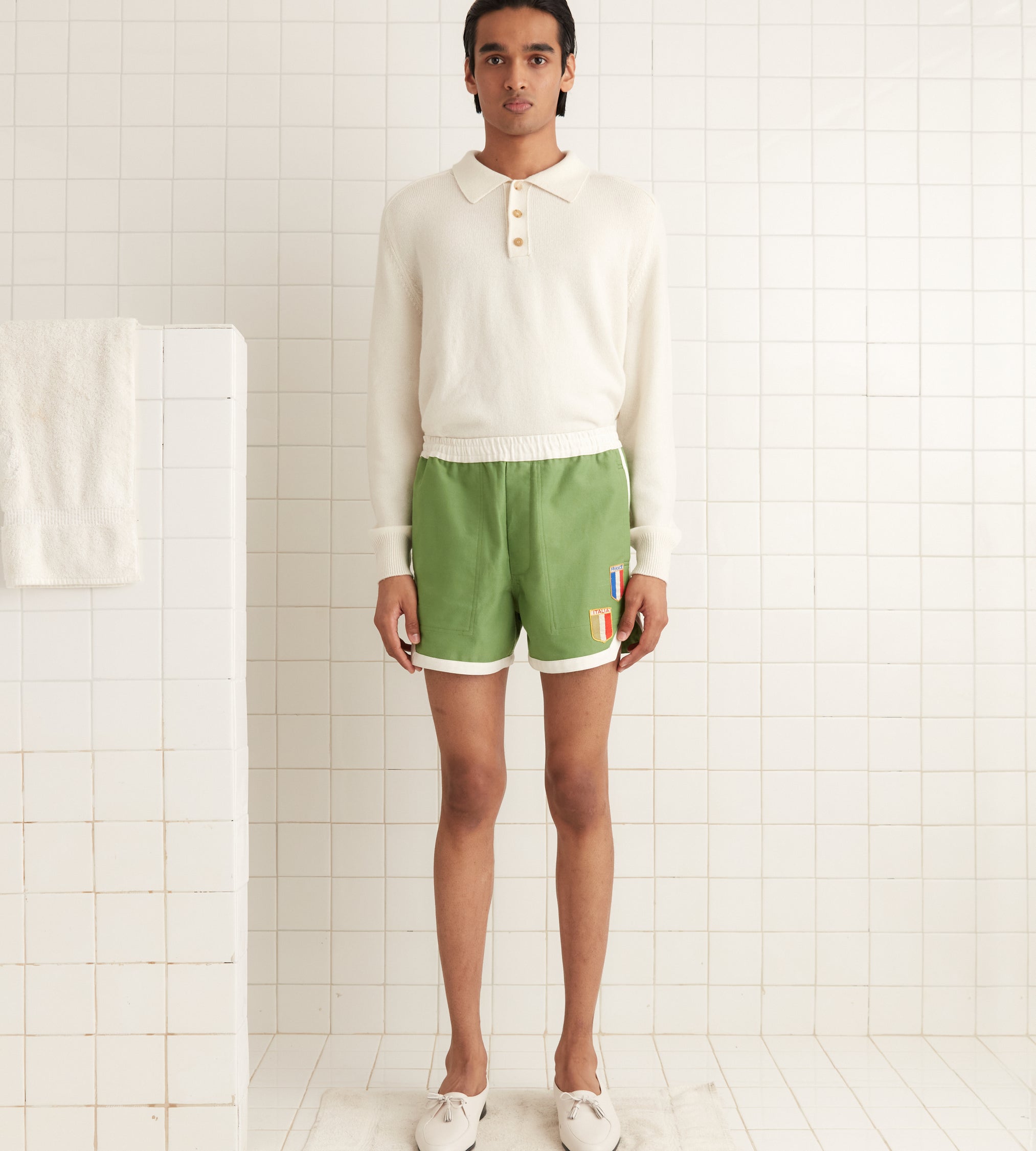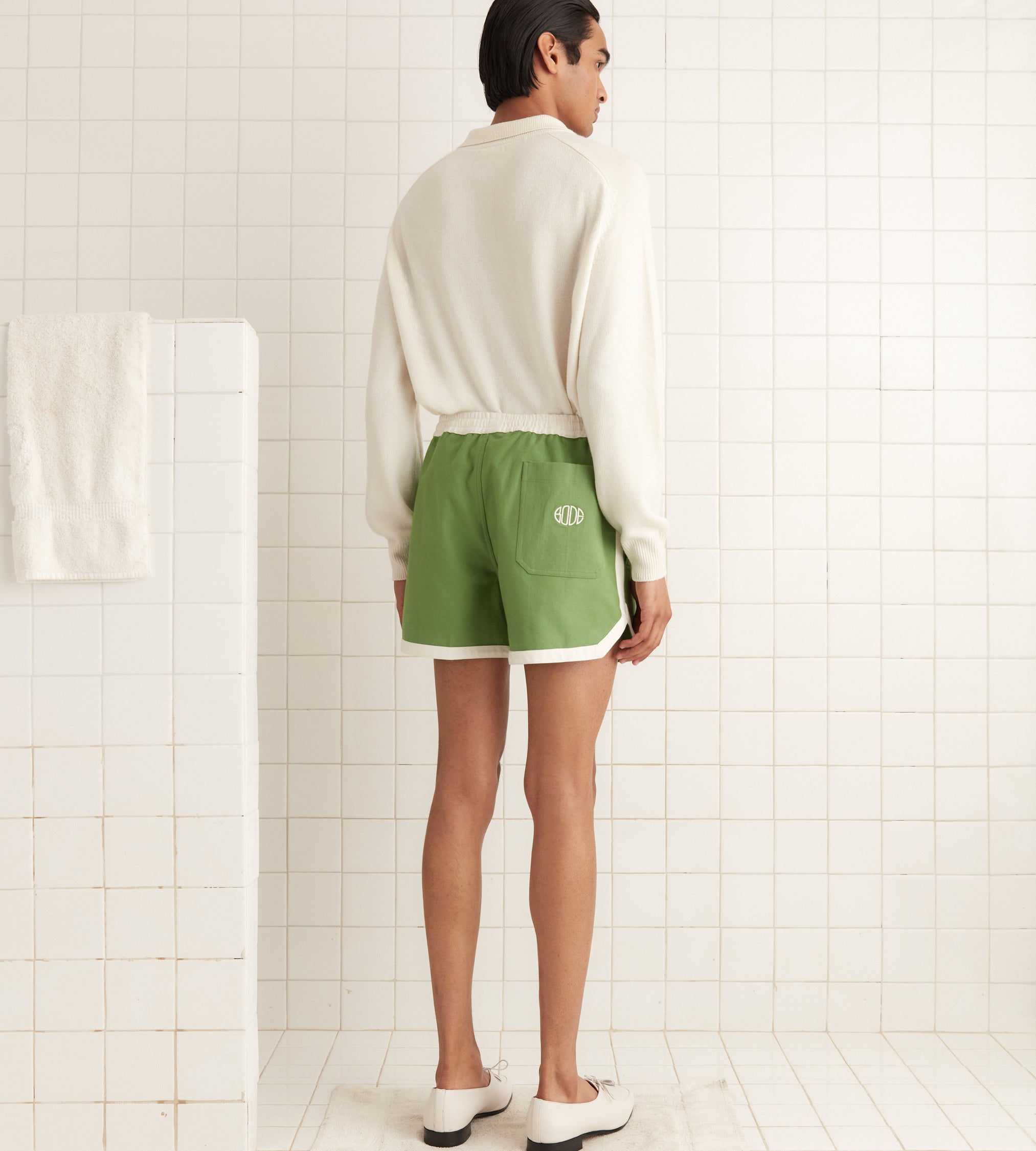 These shorts are inspired by a pair of rugby shorts from the 1980s. We reproduced the silhouette for this style, adding an appliquéd Italy patch near the hem and an embroidered “Bode” across the back pocket.
