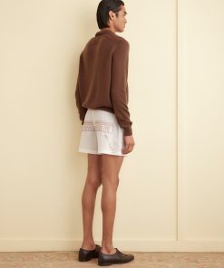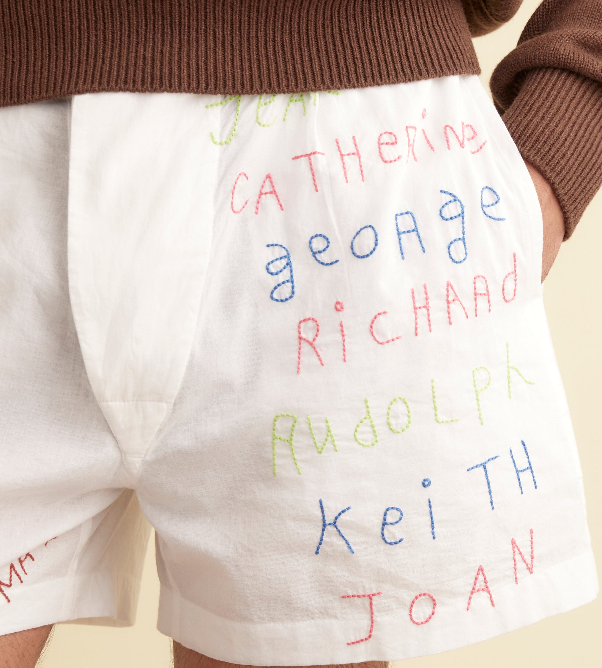 These boxers are inspired by an embroidered autograph apron from 1948. The apron was signed by all the students in a class and each signature was embroidered in different-colored thread. We reproduced the autographs for this style.