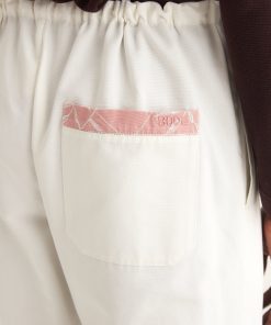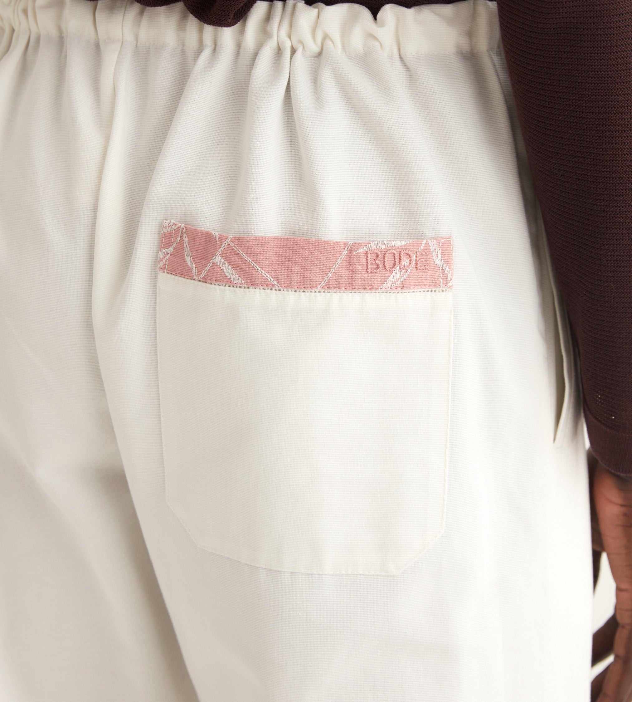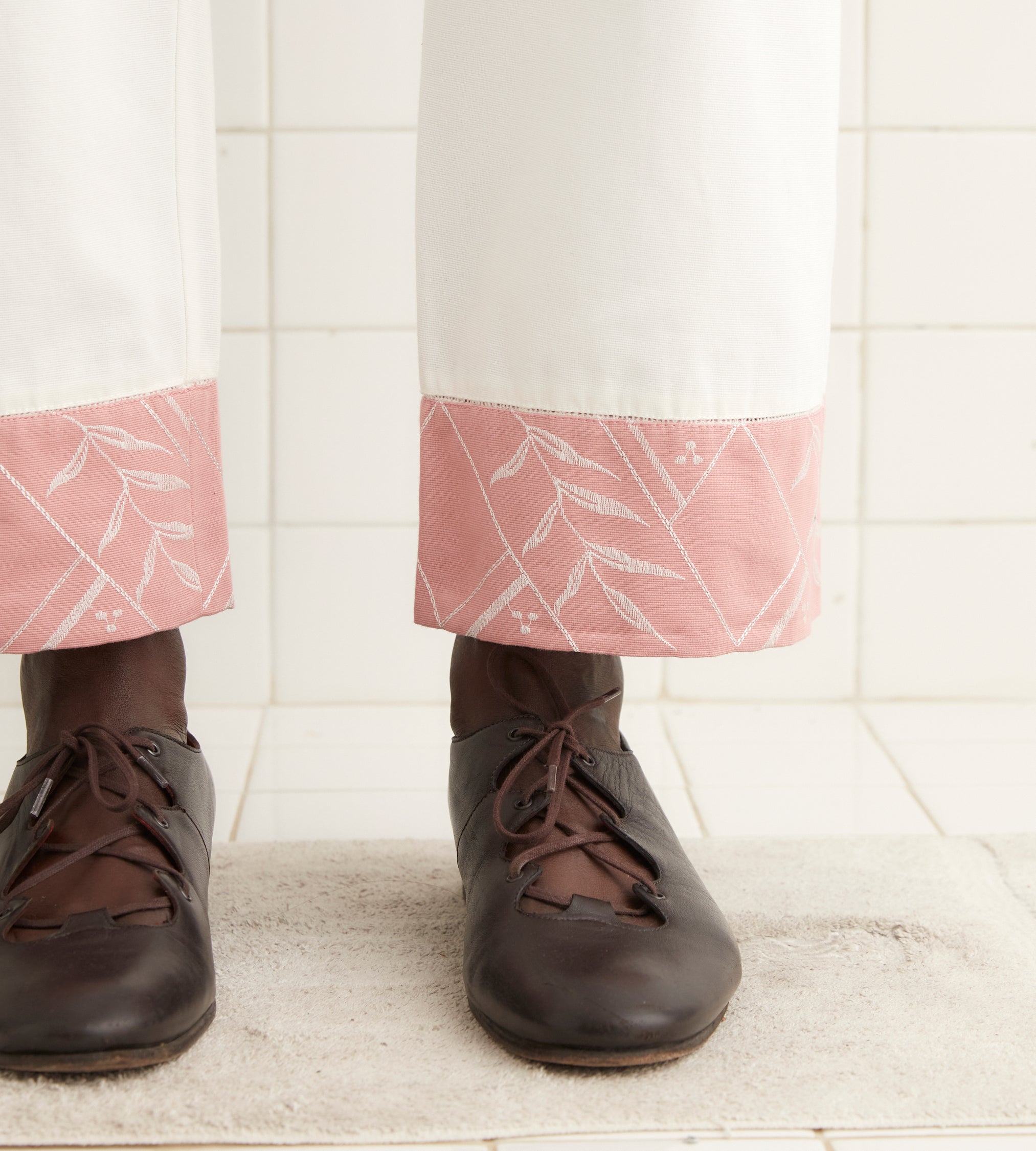 These trousers are inspired by a 1920s pillowcase. We reproduced the fabric, with its pink trim embroidered with a geometric fern pattern, for this style.