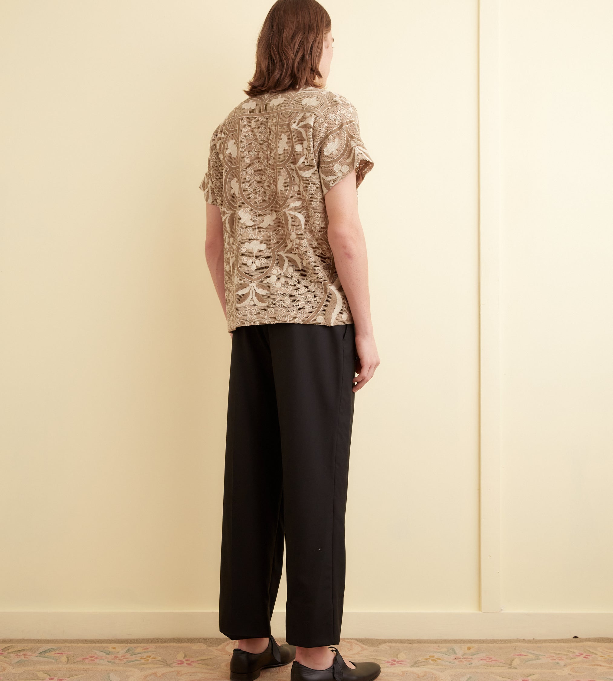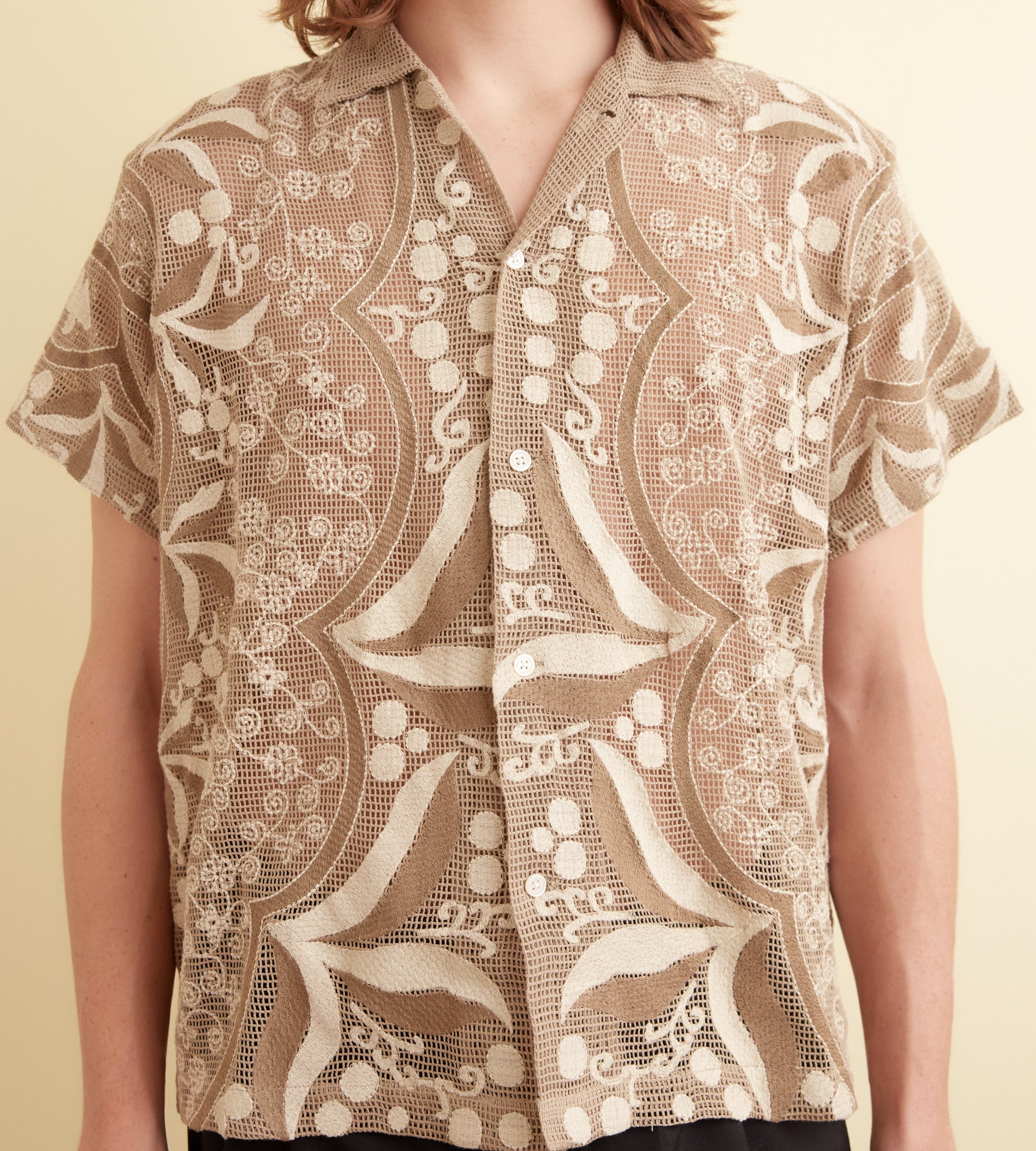 This shirt is inspired by a filet lace tablecloth from the early 20th century. Filet lace is a type of lace embroidered over a fine mesh fabric. The original pattern is reproduced here on brown netting in embroidery floss with a subtle sheen.