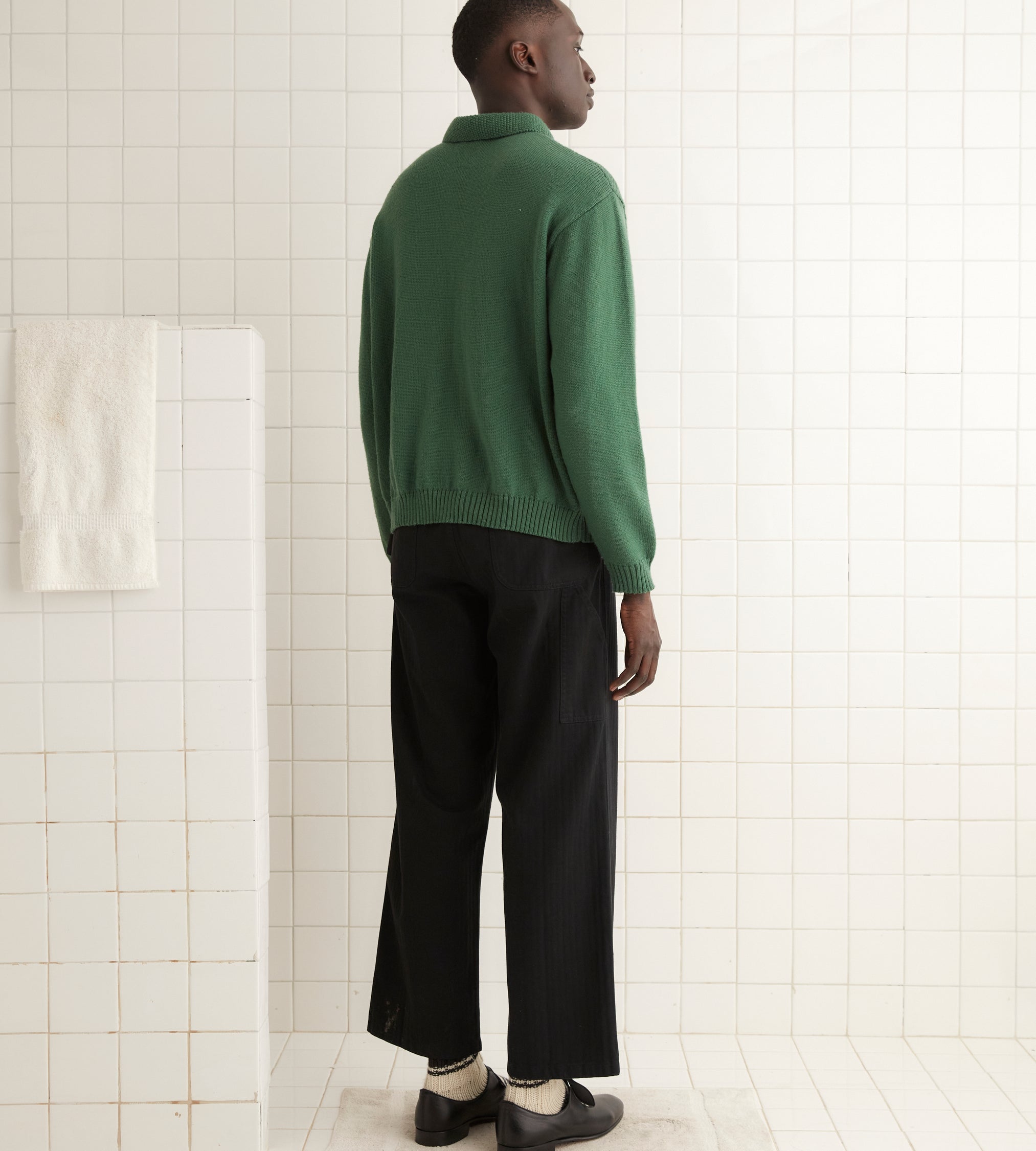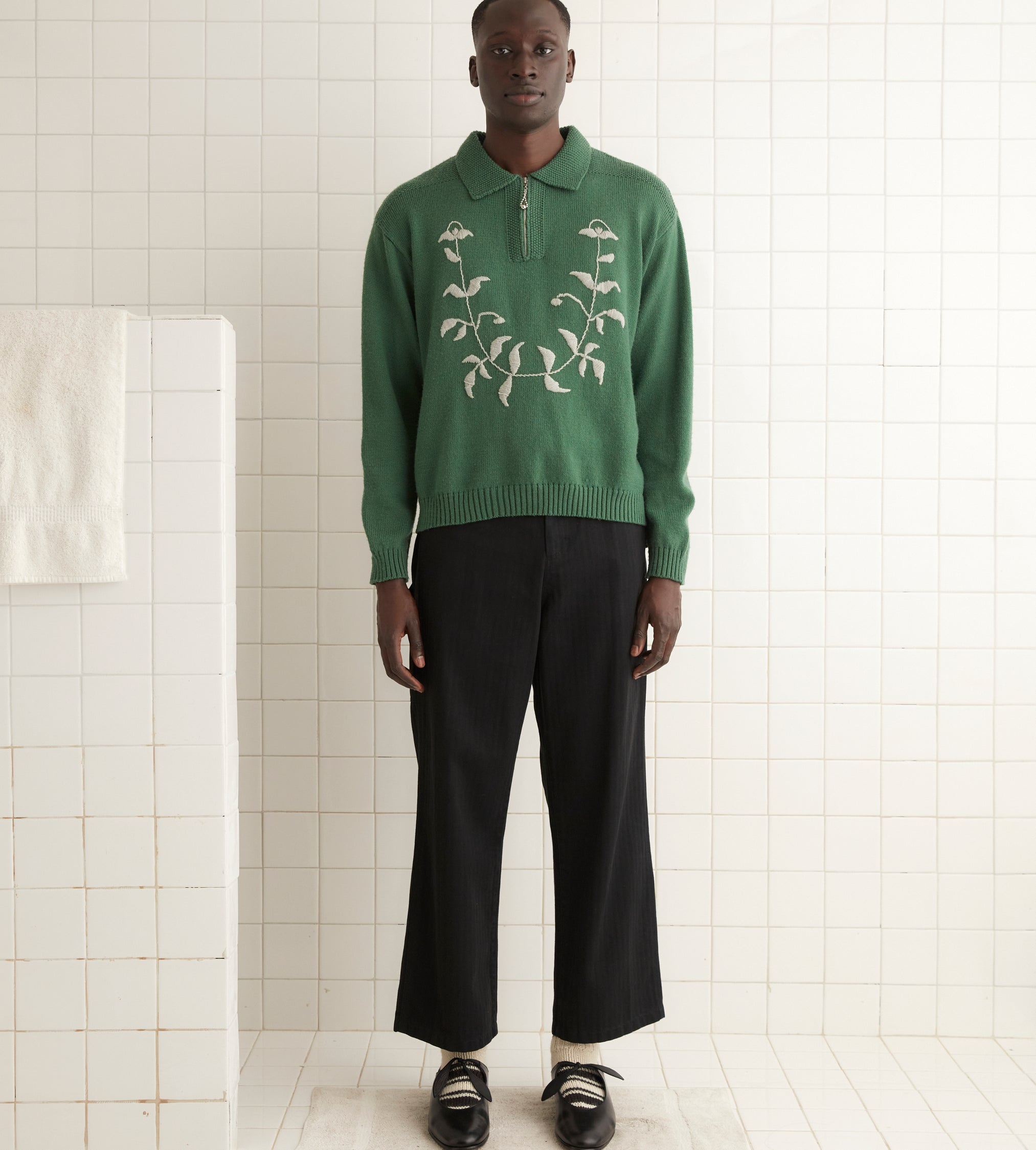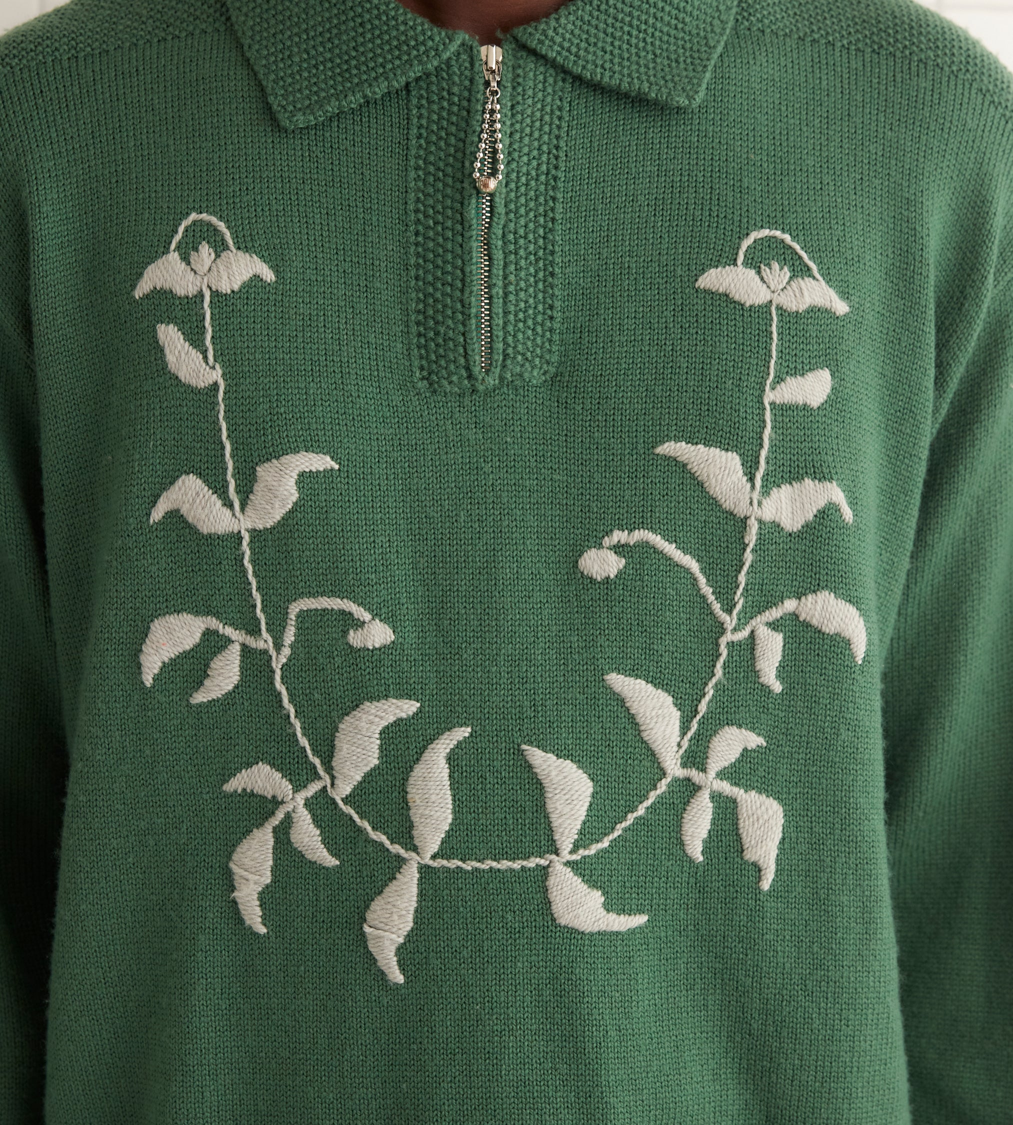 This pullover is inspired by a 1970s sweater, which was embroidered with a gray floral pattern. We reproduced the embroidery by hand for this style.