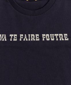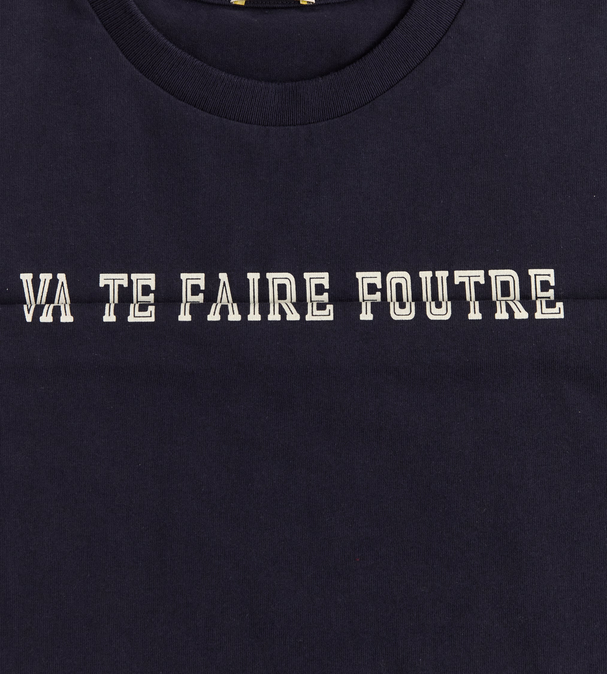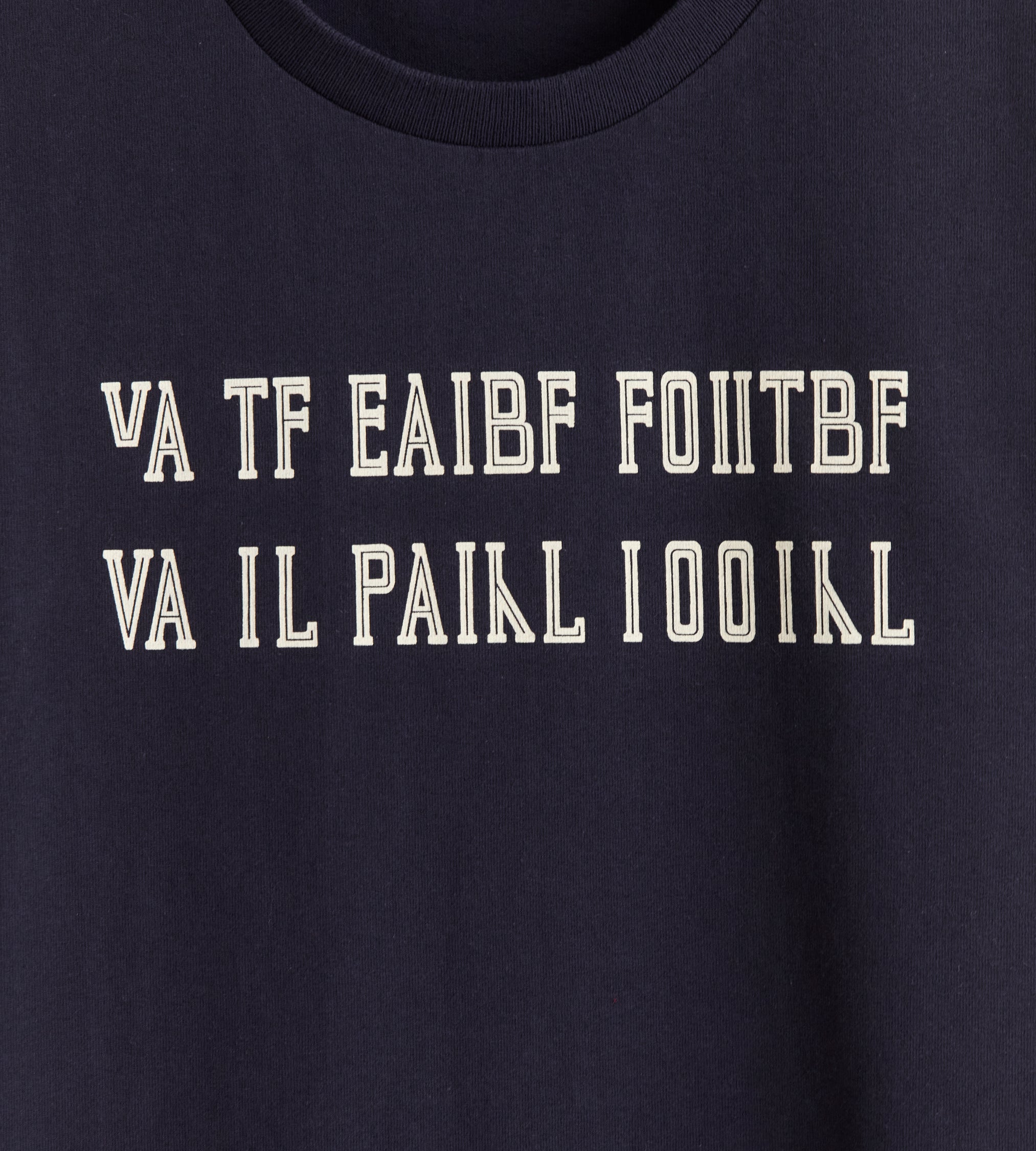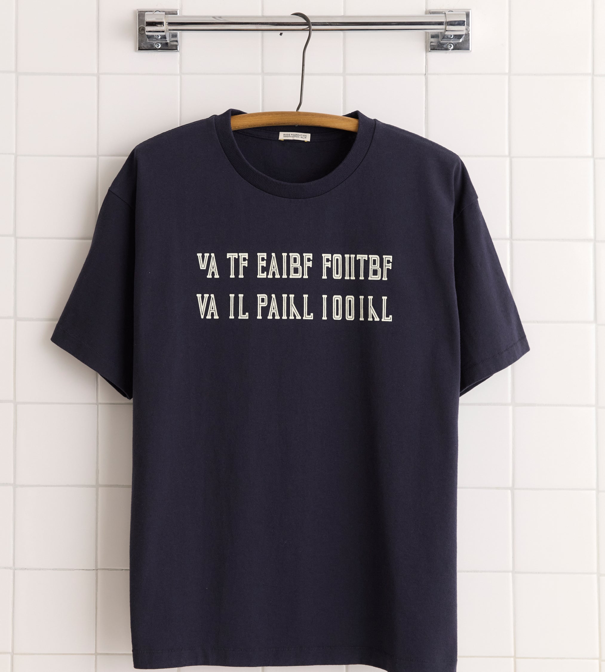 This tee is inspired by a joke tee from the 1980s. When folded together, the two lines of text spell a hidden message.
