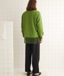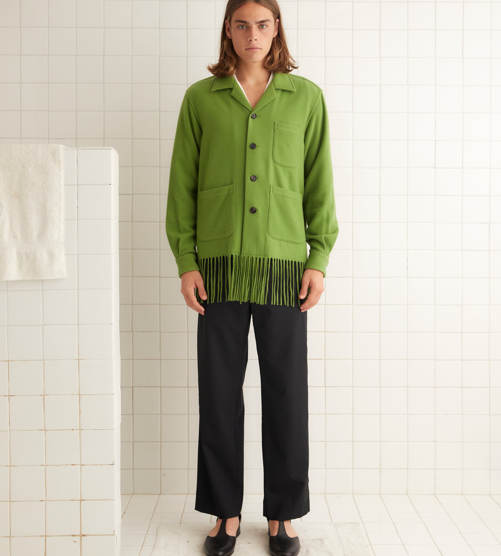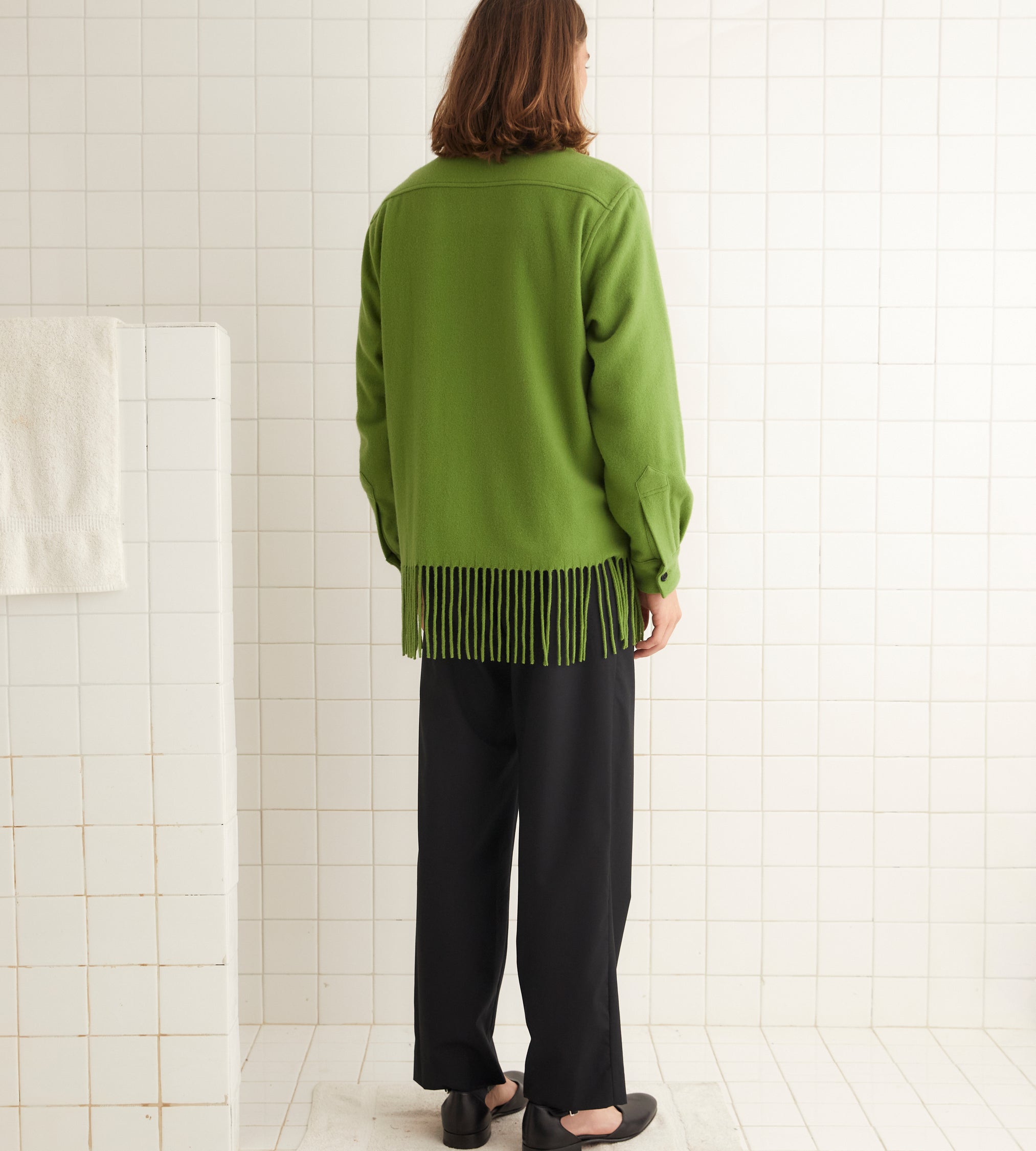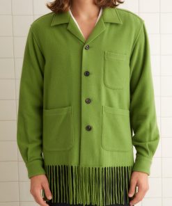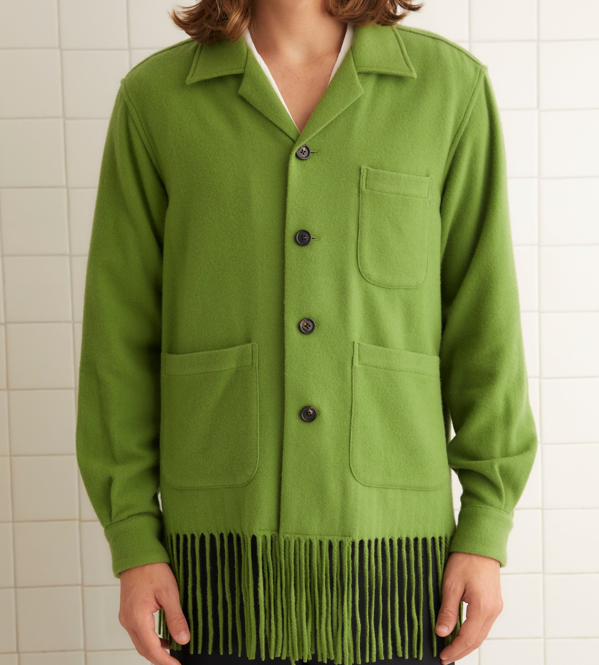 This overshirt is inspired by a midcentury woven blanket. Made of apple-green cashmere, it is trimmed with long fringe.