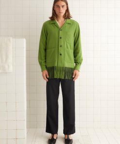 This overshirt is inspired by a midcentury woven blanket. Made of apple-green cashmere, it is trimmed with long fringe.