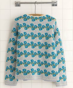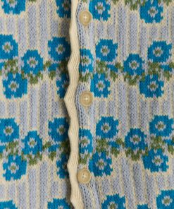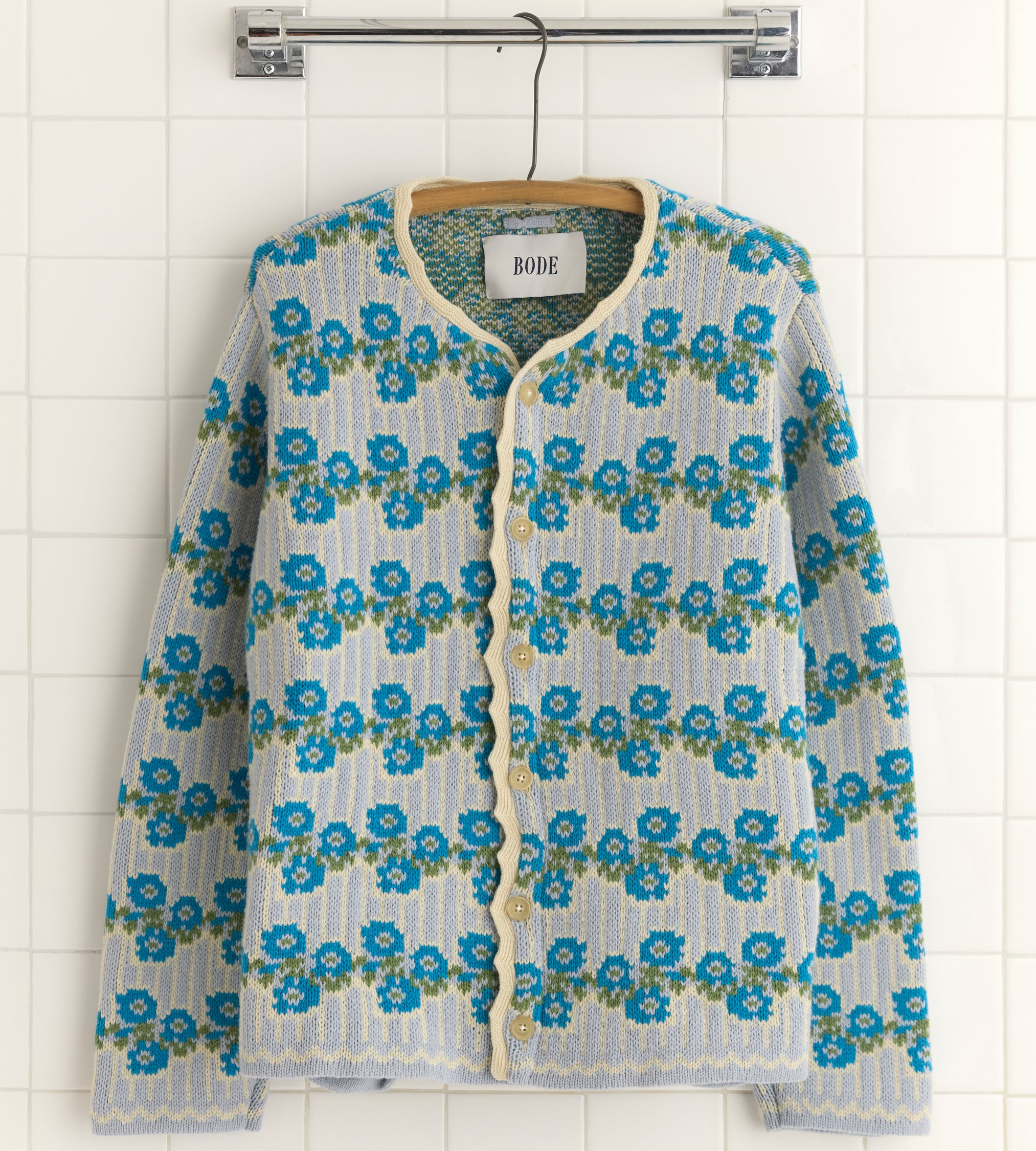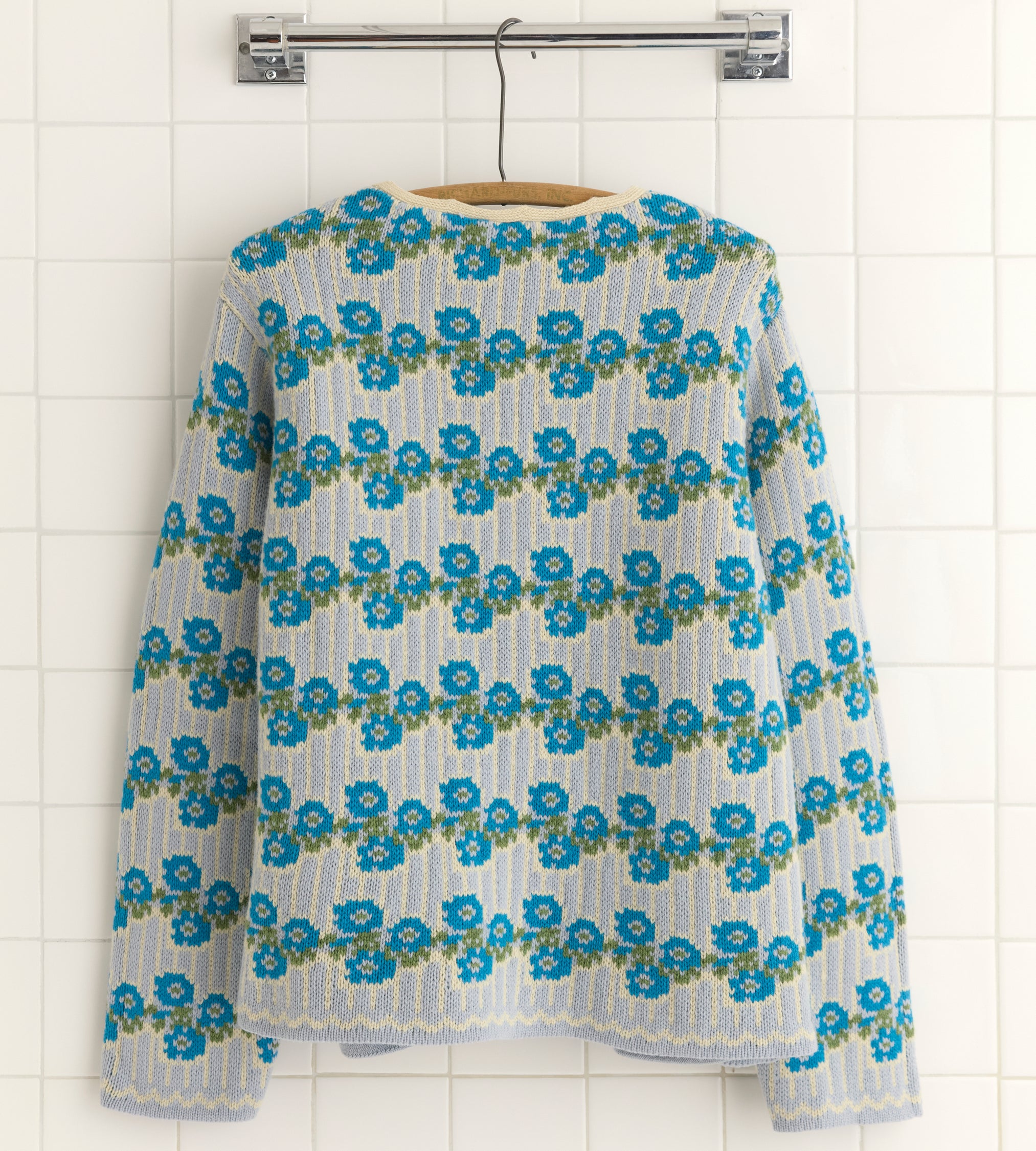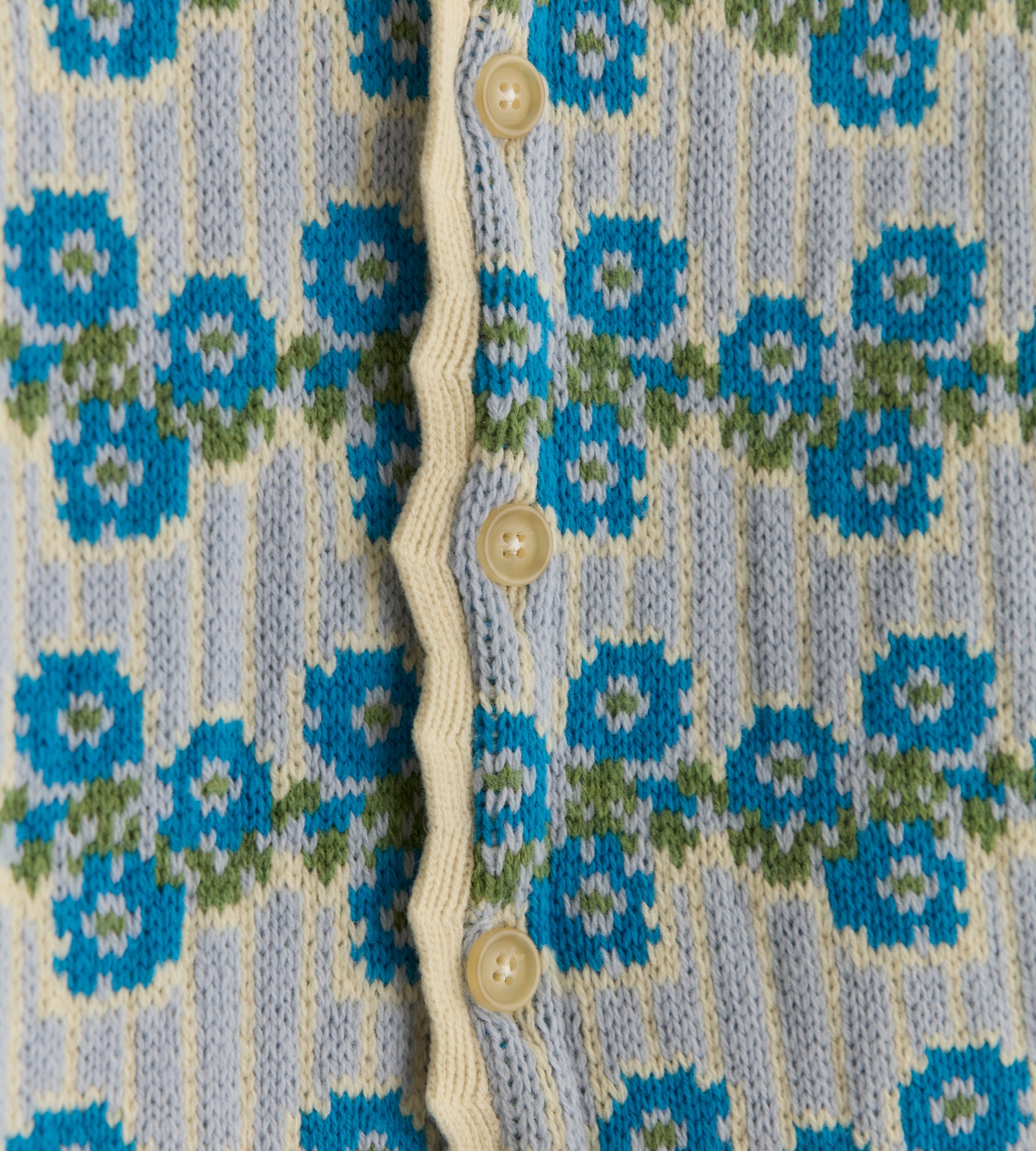 This cardigan is inspired by a sweater from the midcentury. We reproduced the green and blue floral stripes for this jacquard knit, made in a soft merino wool.