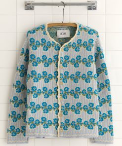 This cardigan is inspired by a sweater from the midcentury. We reproduced the green and blue floral stripes for this jacquard knit, made in a soft merino wool.