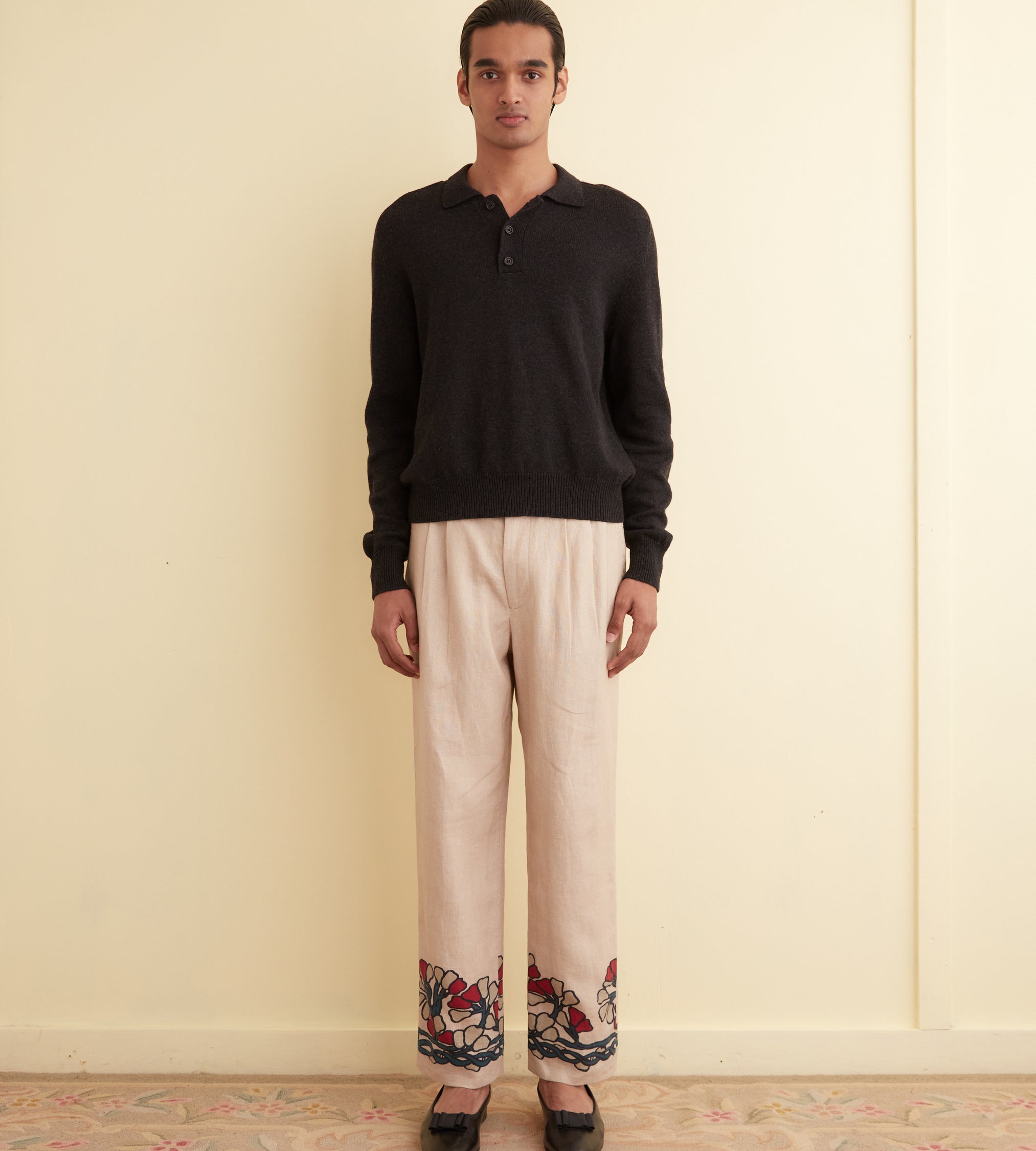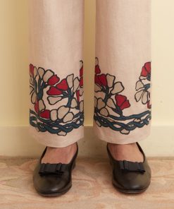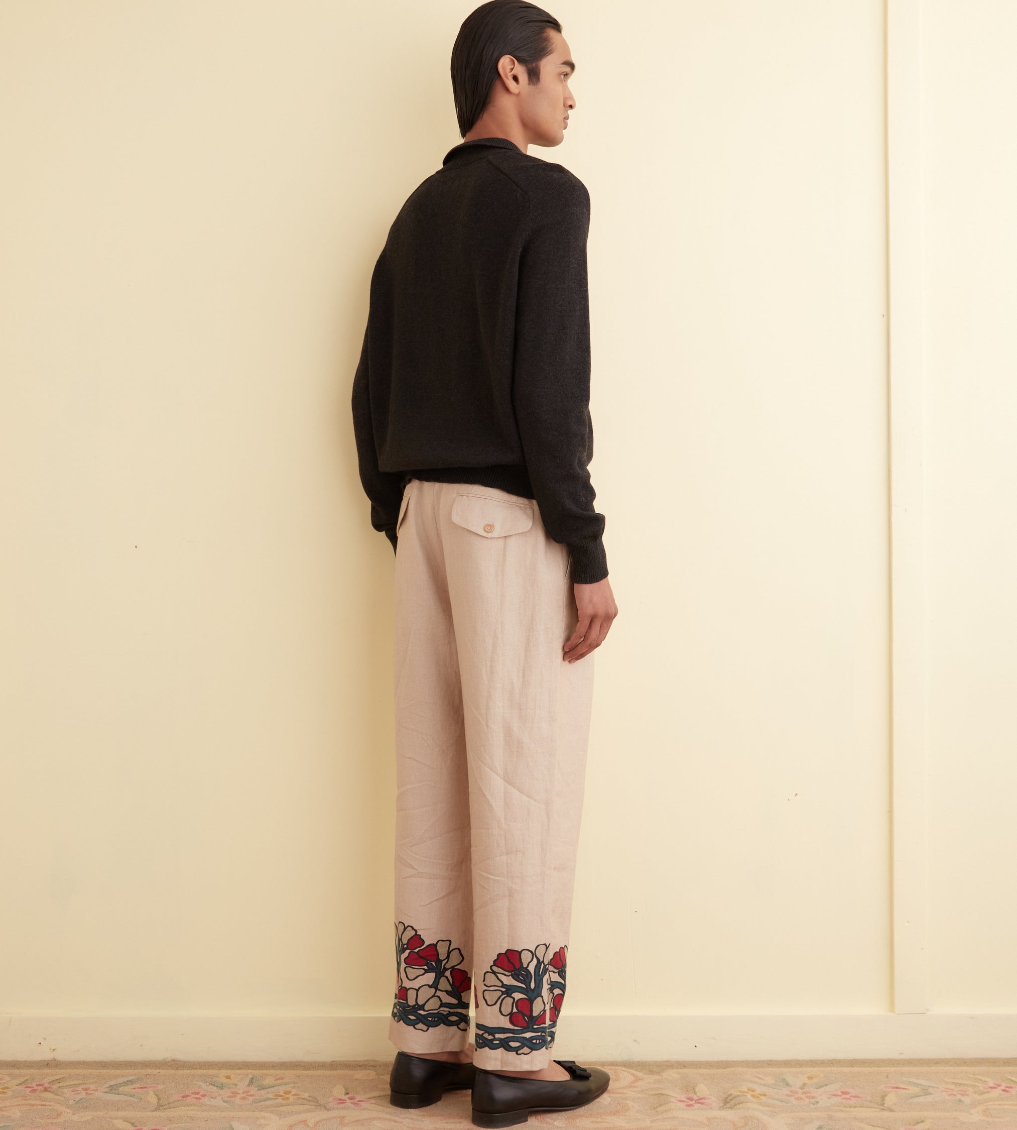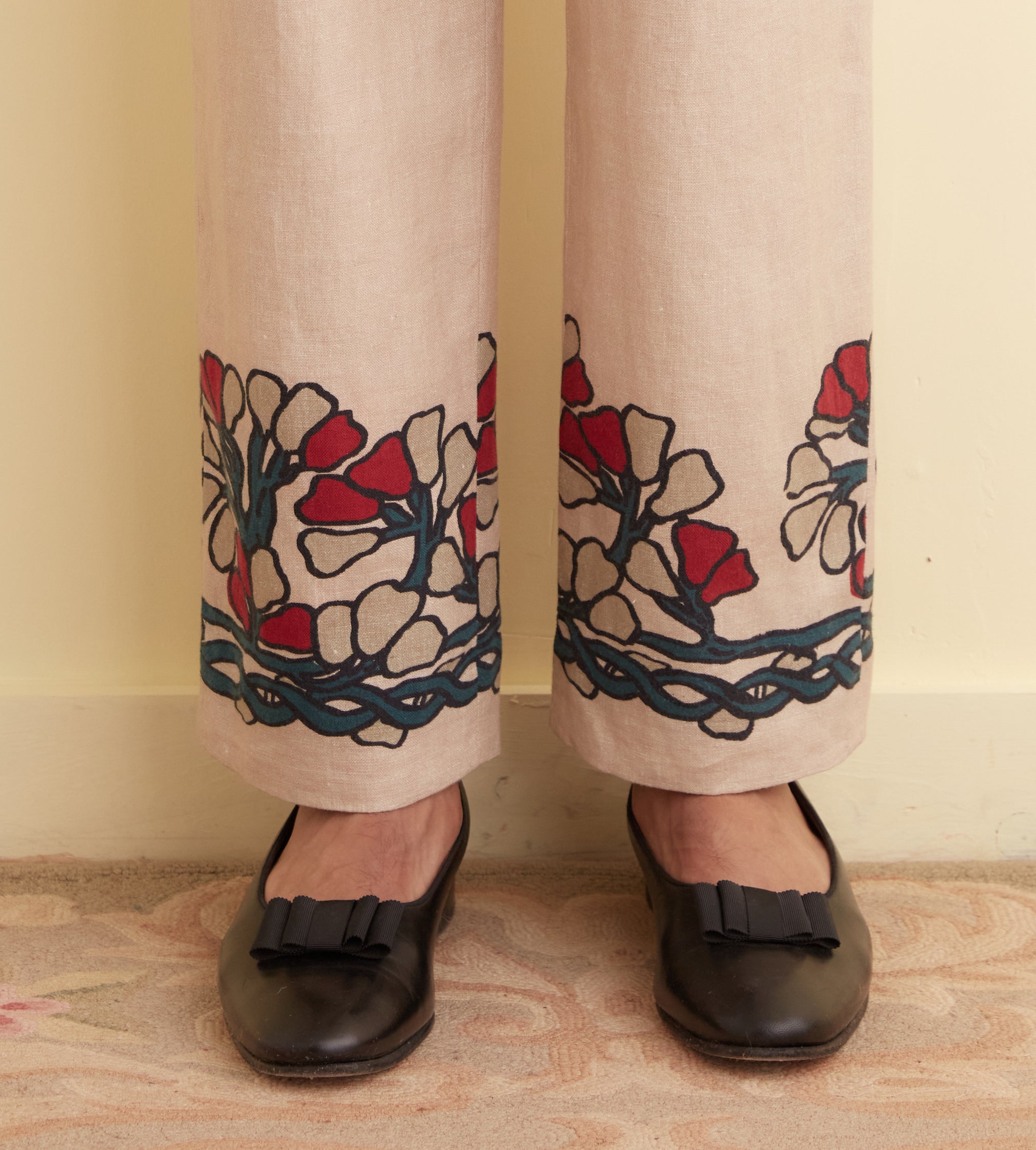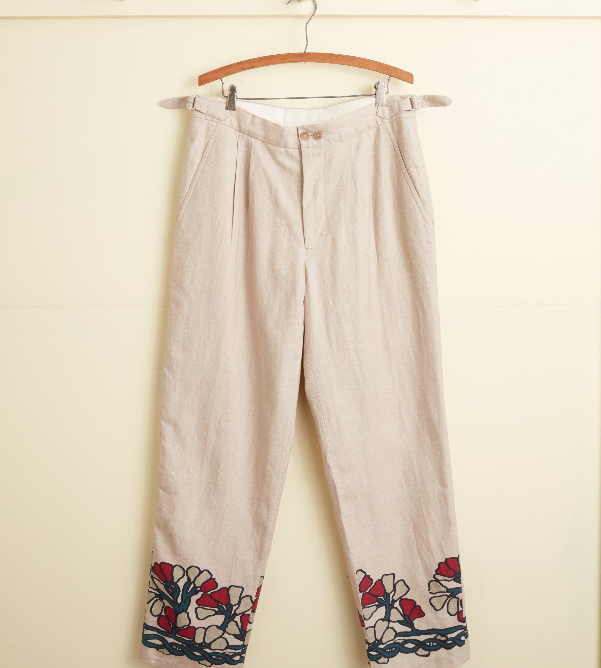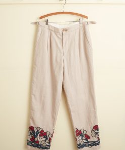 These trousers are inspired by a block-printed tablecloth from the midcentury. Block-printing is one of the oldest styles of printing and involves carving a pattern into a (usually) wooden block, then using that block as a stamp to transfer designs onto fabric. We reproduced the grey-and-red floral pattern of the original tablecloth for these trousers, which are cut with a mid-rise and a straight leg.