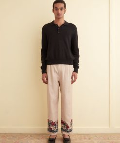 These trousers are inspired by a block-printed tablecloth from the midcentury. Block-printing is one of the oldest styles of printing and involves carving a pattern into a (usually) wooden block, then using that block as a stamp to transfer designs onto fabric. We reproduced the grey-and-red floral pattern of the original tablecloth for these trousers, which are cut with a mid-rise and a straight leg.