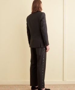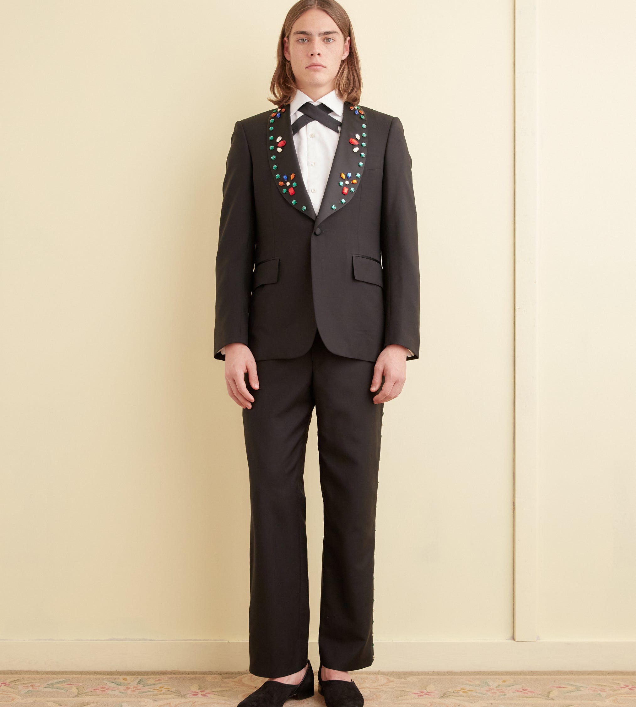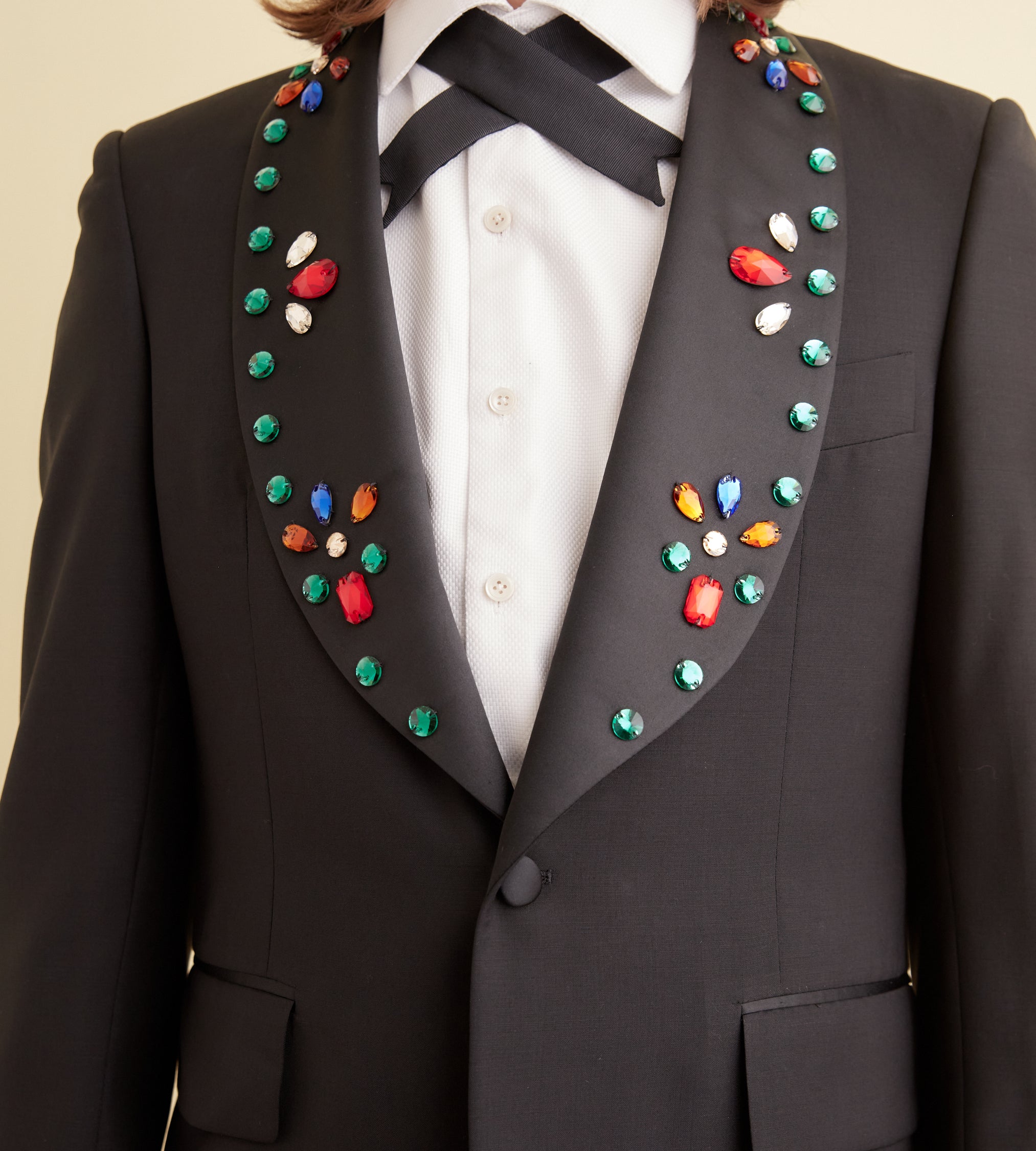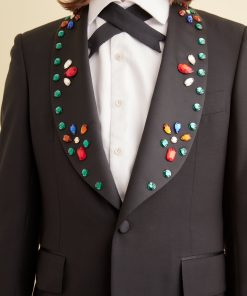 This tuxedo jacket is inspired by a gemstone collar from the 1960s. We reproduced the colorful, gem-studded pattern for this style. Each gemstone is hand-stitched onto the jacket collar.