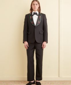 This tuxedo jacket is inspired by a gemstone collar from the 1960s. We reproduced the colorful, gem-studded pattern for this style. Each gemstone is hand-stitched onto the jacket collar.